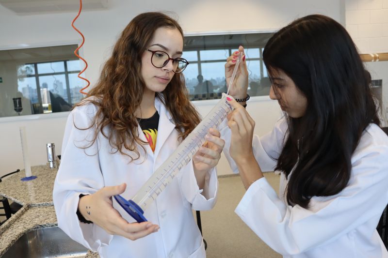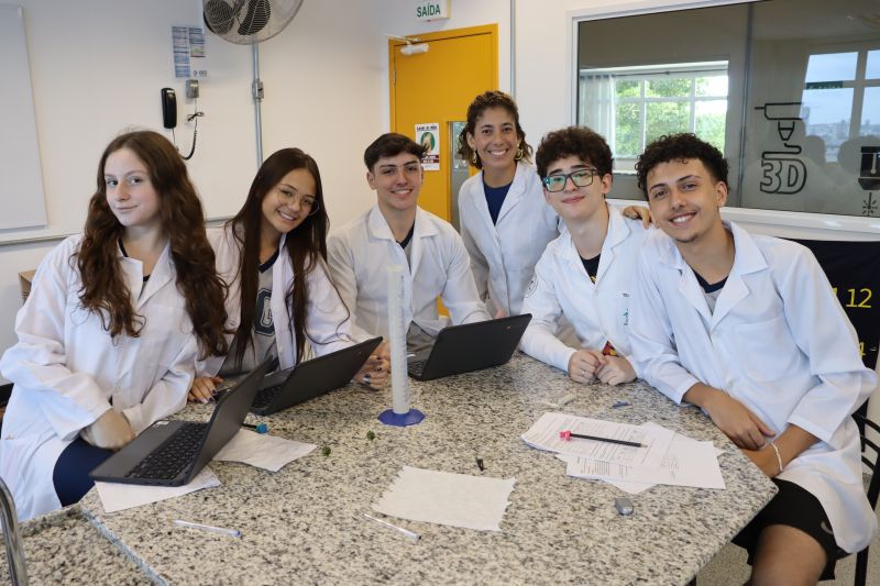 Os alunos do Itinerário de Química, da 1ª série do EM – Investigação e Análises Químicas, e da 3ª série EM – Química+, foram ao laboratório para realizar experimentos sob a orientação da Professora Priscila.