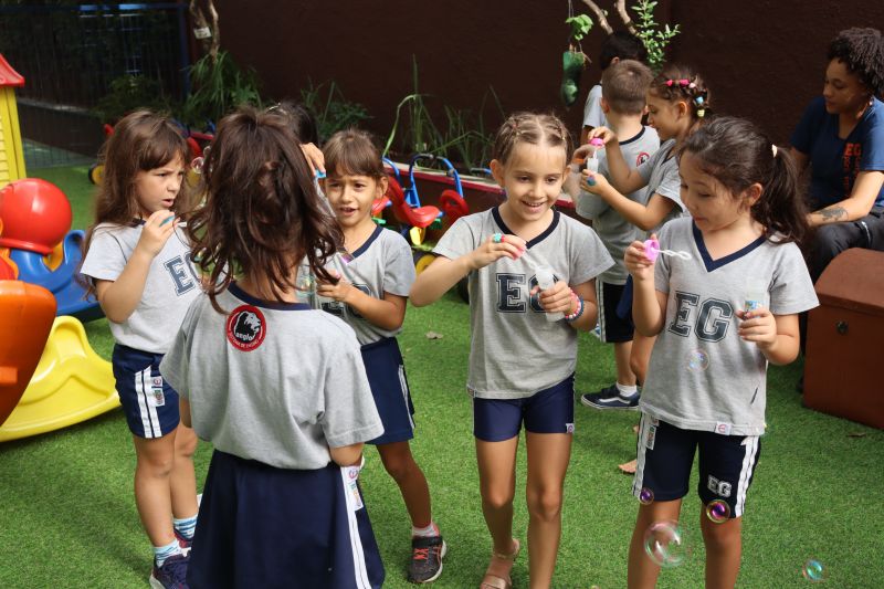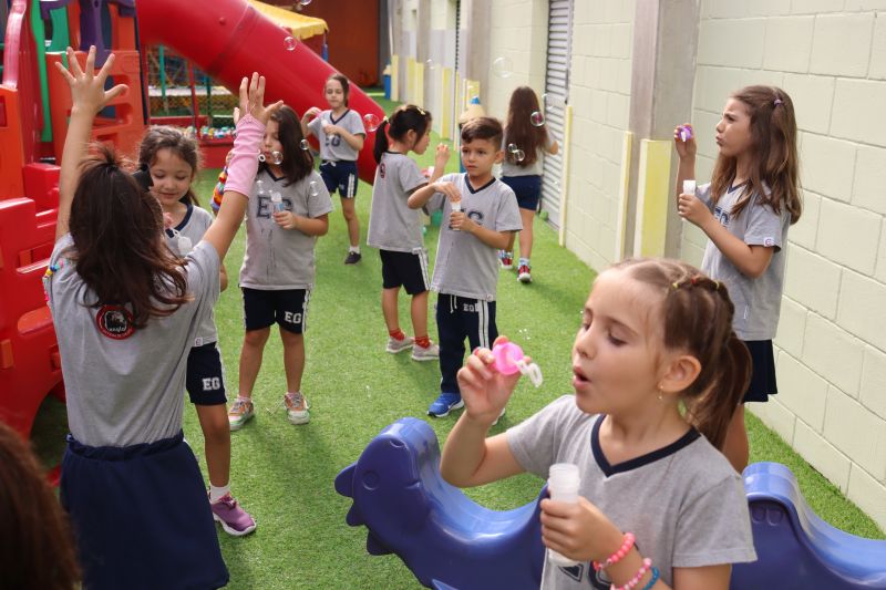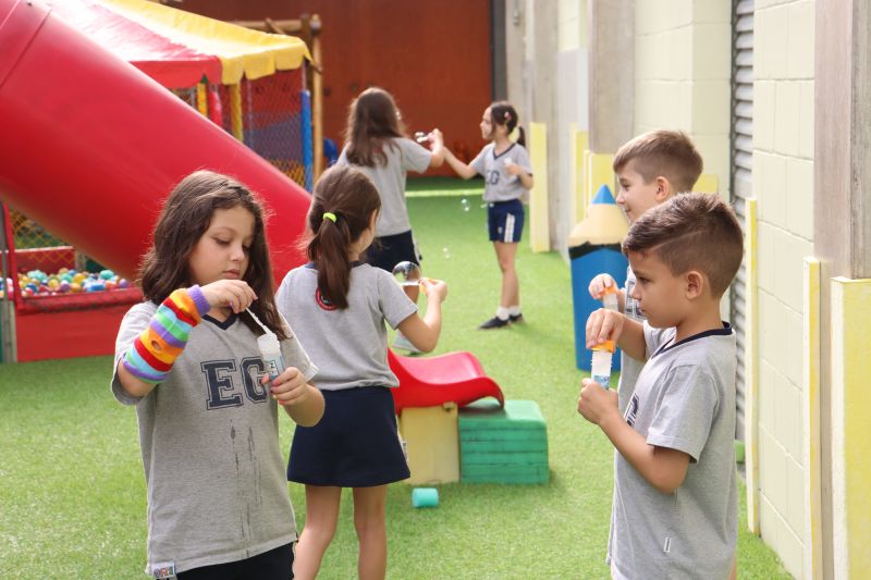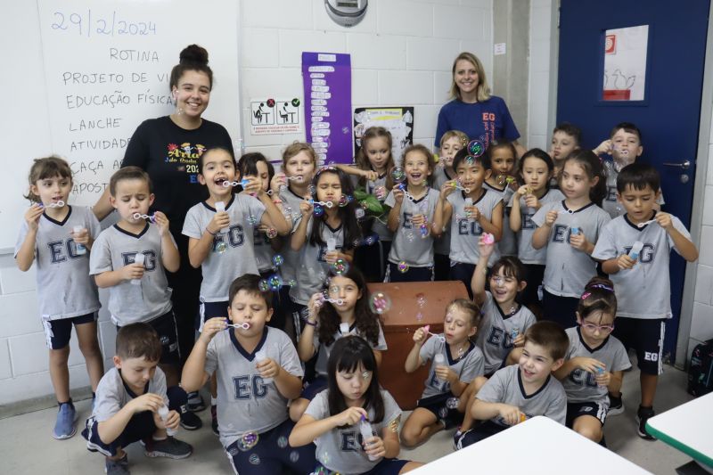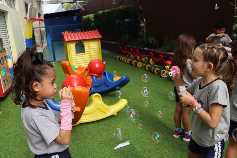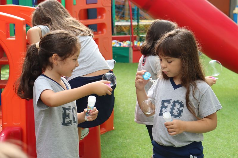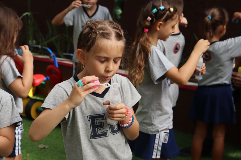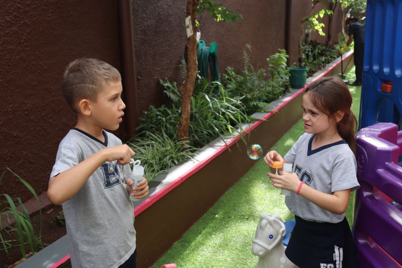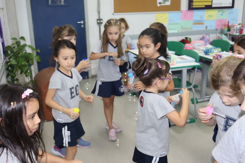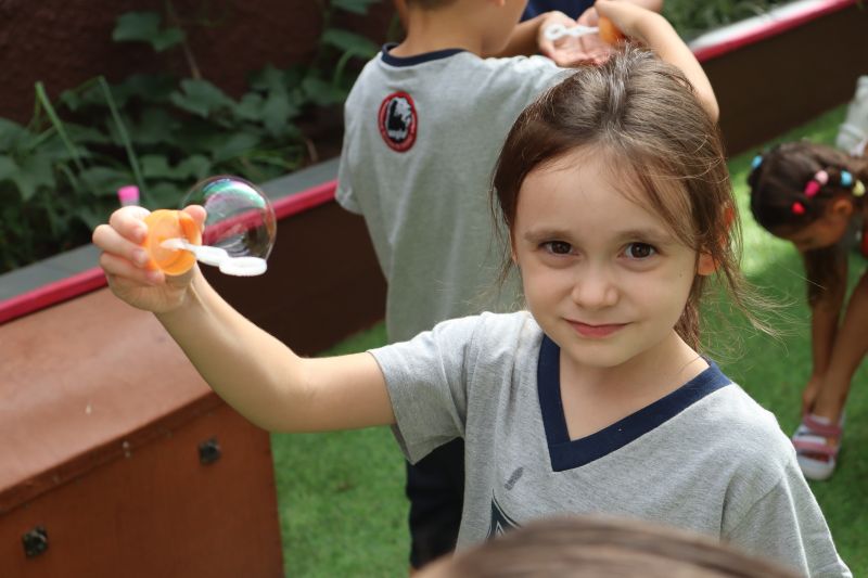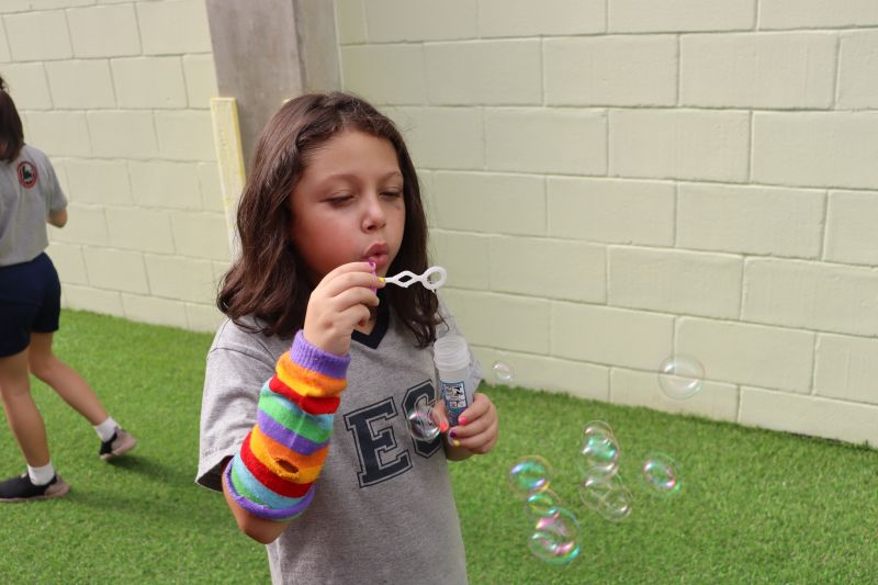 No final da atividade, os alunos receberam tubos para fazer bolhas de sabão para brincar.