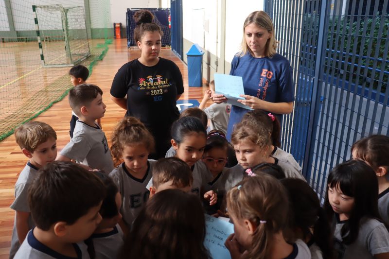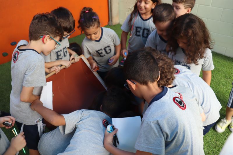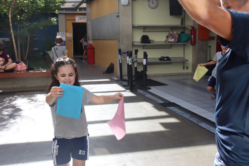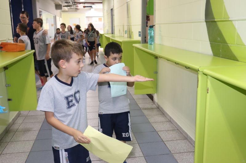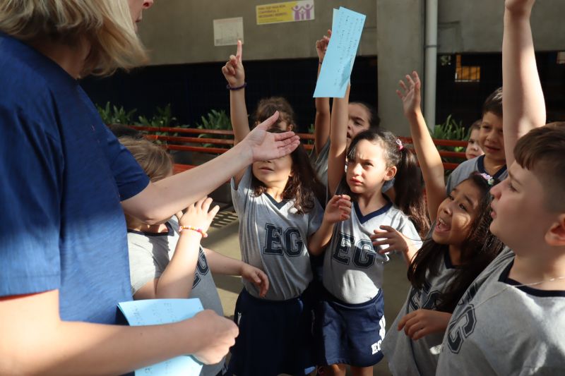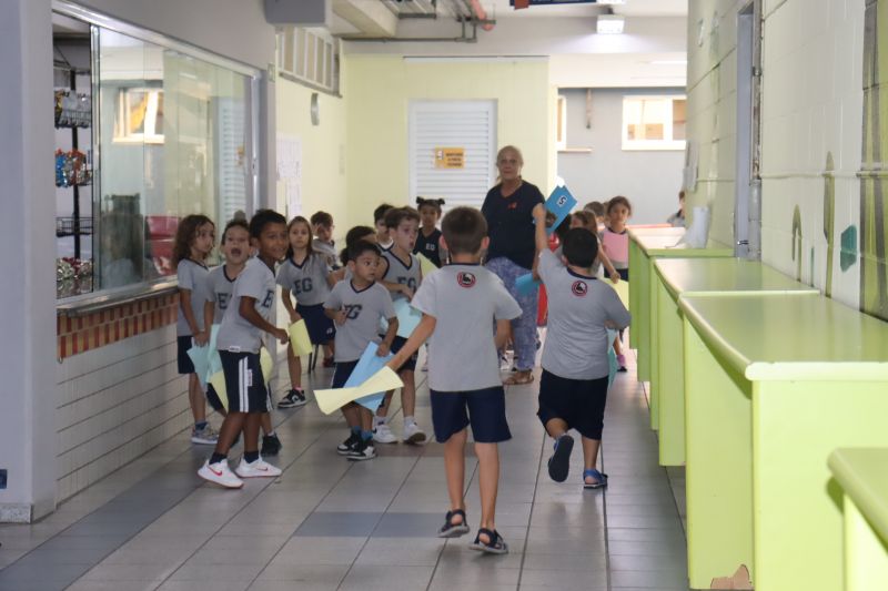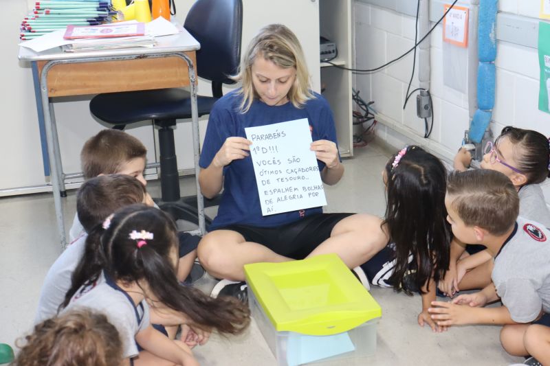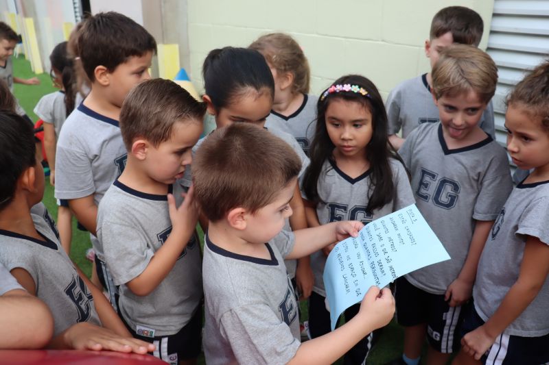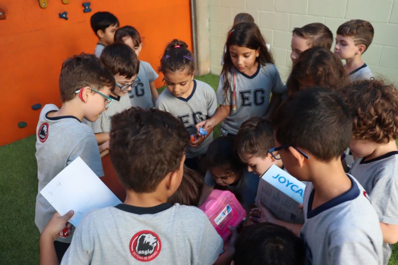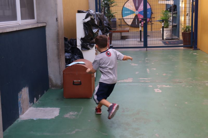 Várias pistas foram espalhadas pelo Colégio e, para que o tesouro fosse encontrado, os estudantes tiveram de decifrar todas elas. O tesouro era formado por diversos materiais que eles utilizarão nas aulas de Matemática durante o ano, como material dourado, trena, régua, fita métrica, balanças, sólidos geométricos e geoplano, entre outros.