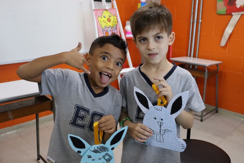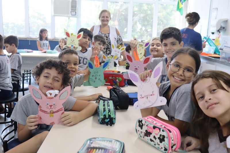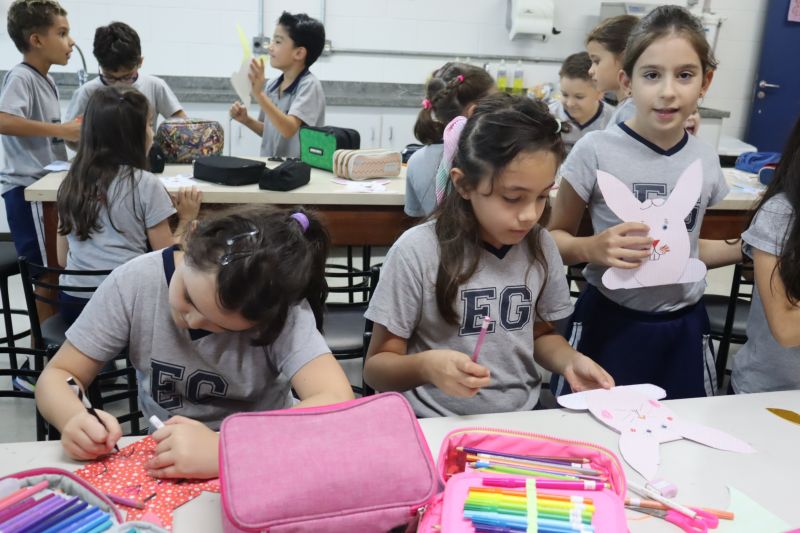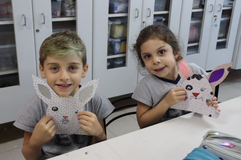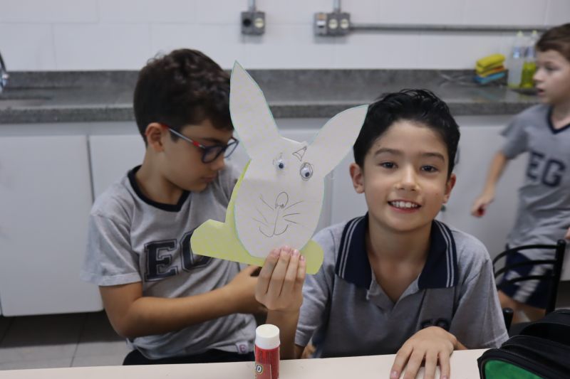 Durante a aula, eles confeccionaram um cartão em formato de coelho da Páscoa e, de forma divertida, exploraram a criatividade, customizando o cartão com desenhos, cores e colagens.