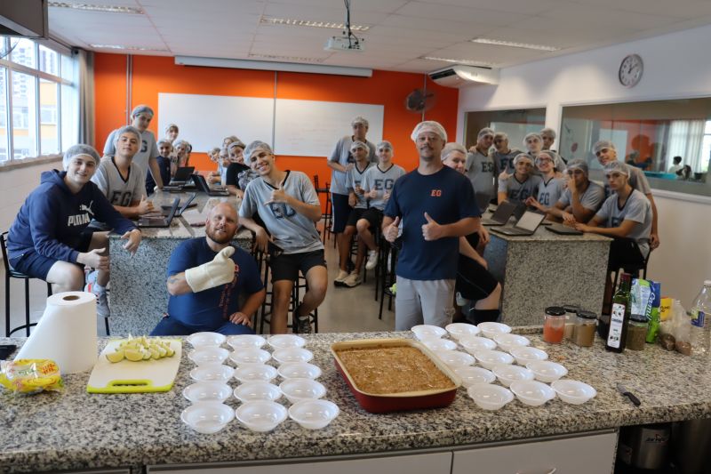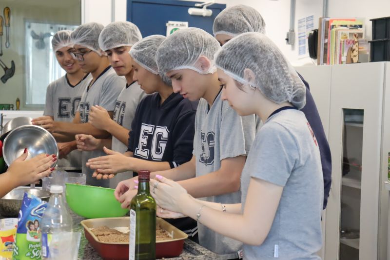 Os estudantes da 2ª série do Ensino Médio, do Itinerário de Química – Investigação e Análises Químicas, foram à cozinha experimental para provar que uma receita vegana pode ter o sabor de carne, já que estão aprendendo sobre adulterações no Módulo 9 da apostila C – material Anglo.