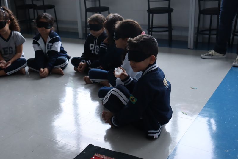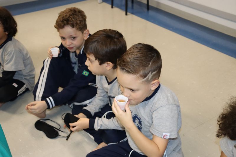 Os alunos do 1º ano EF foram à Sala de Arte para vivenciar uma atividade sobre os cinco sentidos, preparada pelas Professoras Cida, Eny, Marcela, Valquíria e pelo Professor Carlos (responsável pelo Laboratório e pela Cozinha Experimental).