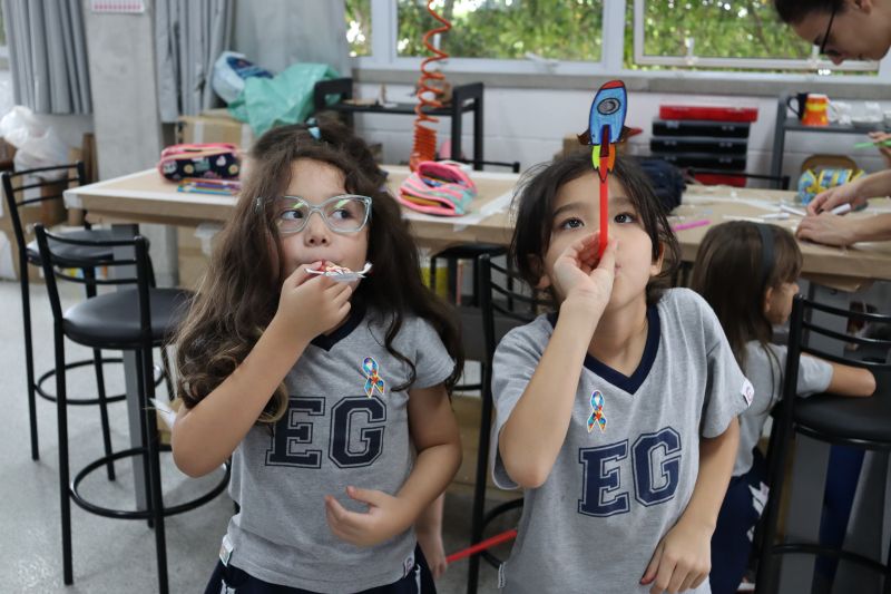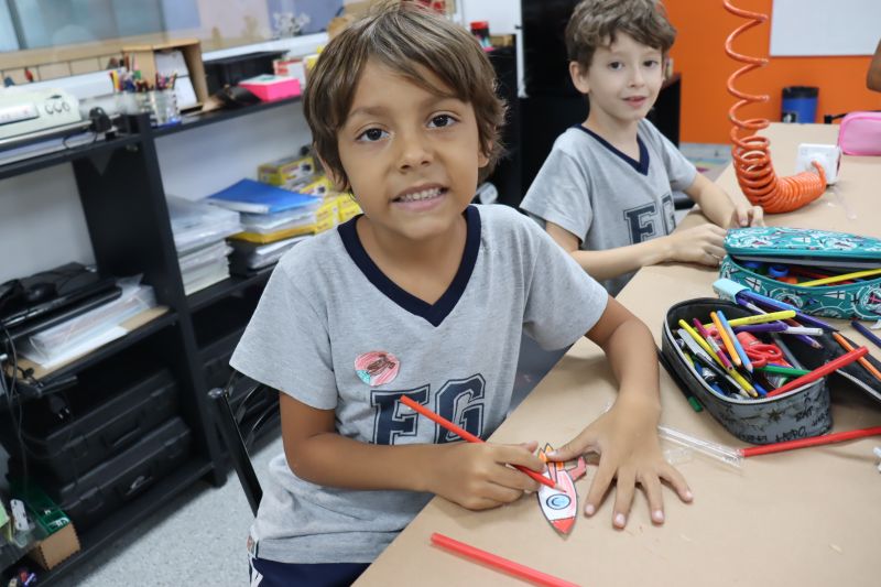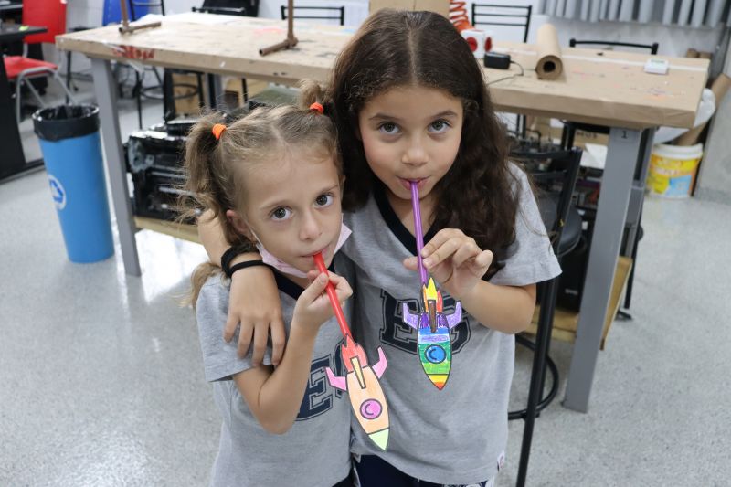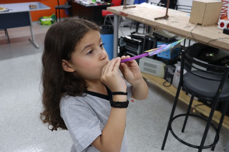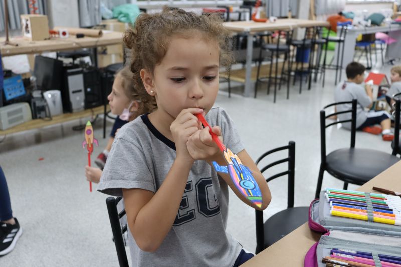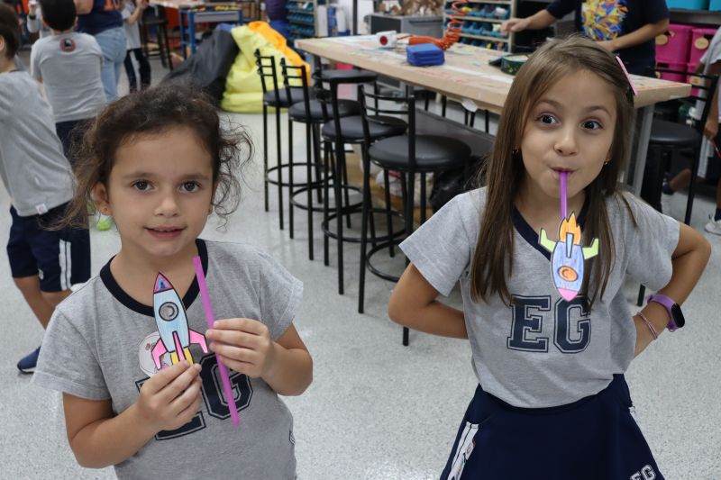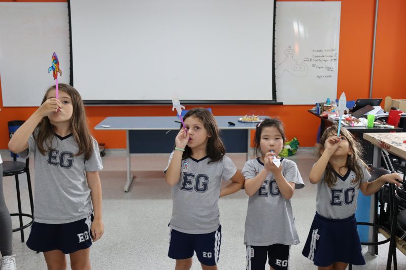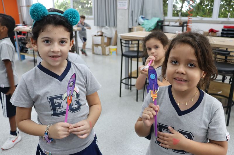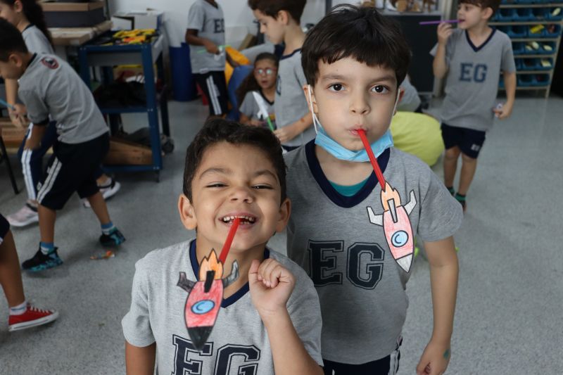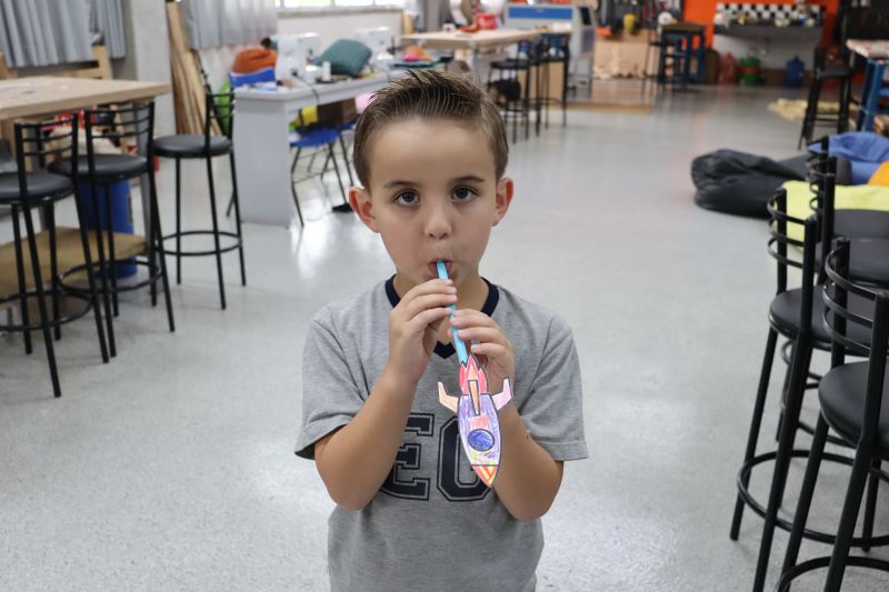 Em um segundo momento, os alunos confeccionaram um foguete de papel, com base de canudo, que com um sopro, podia “voar”.