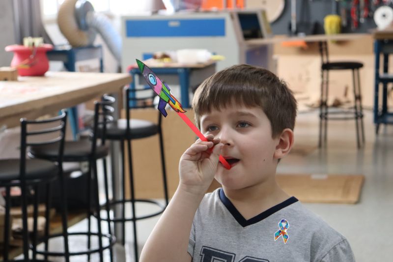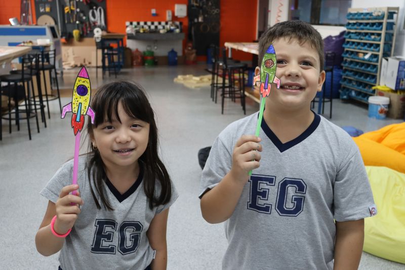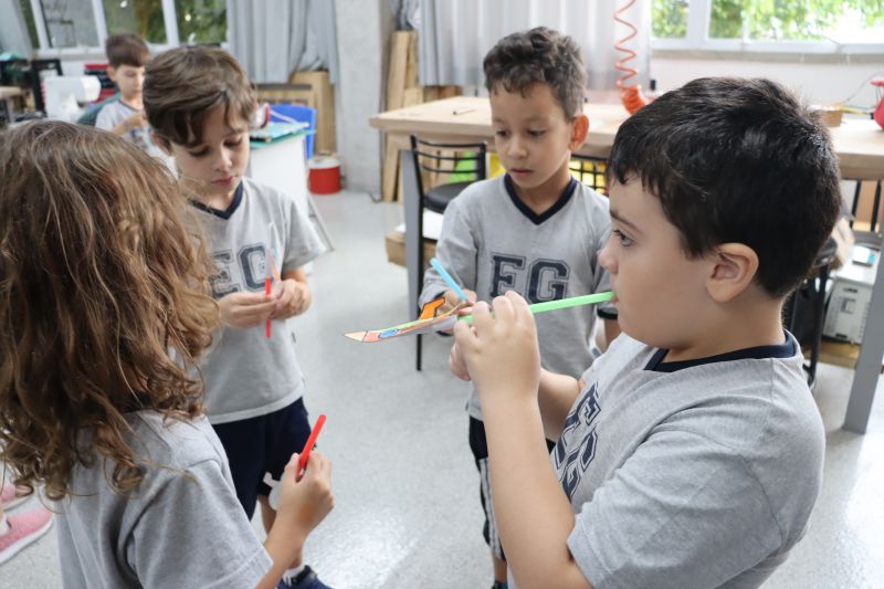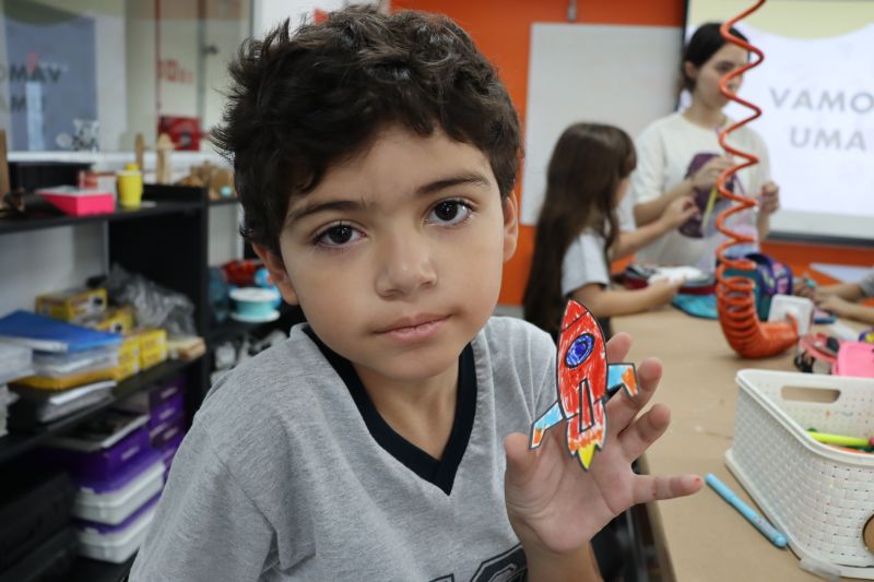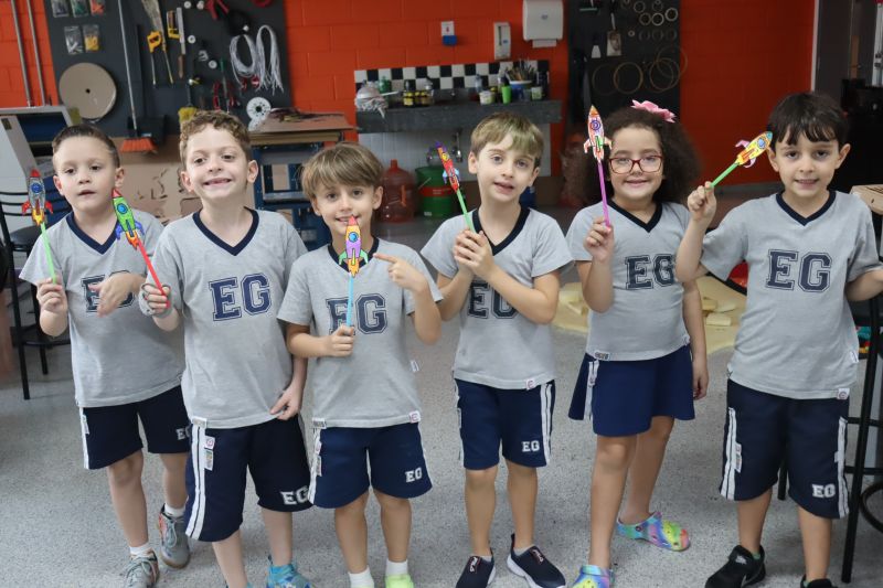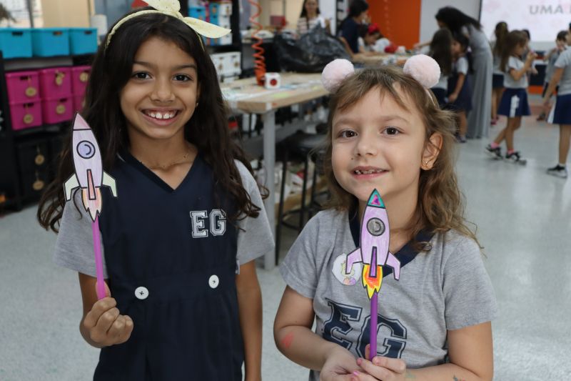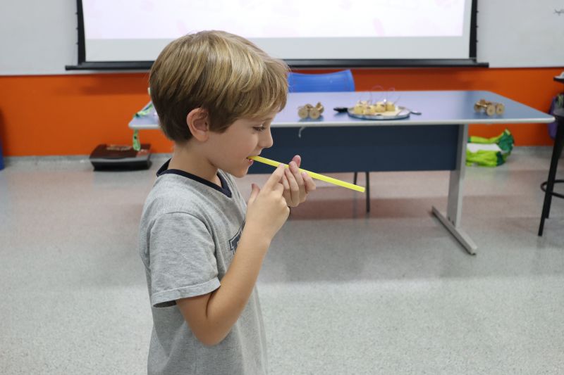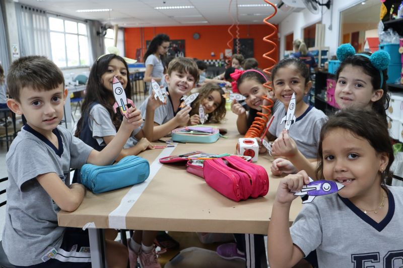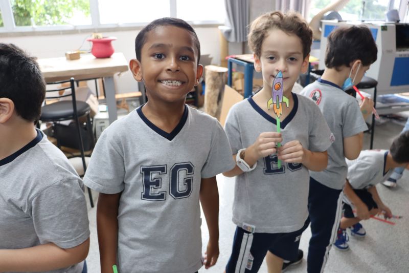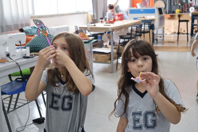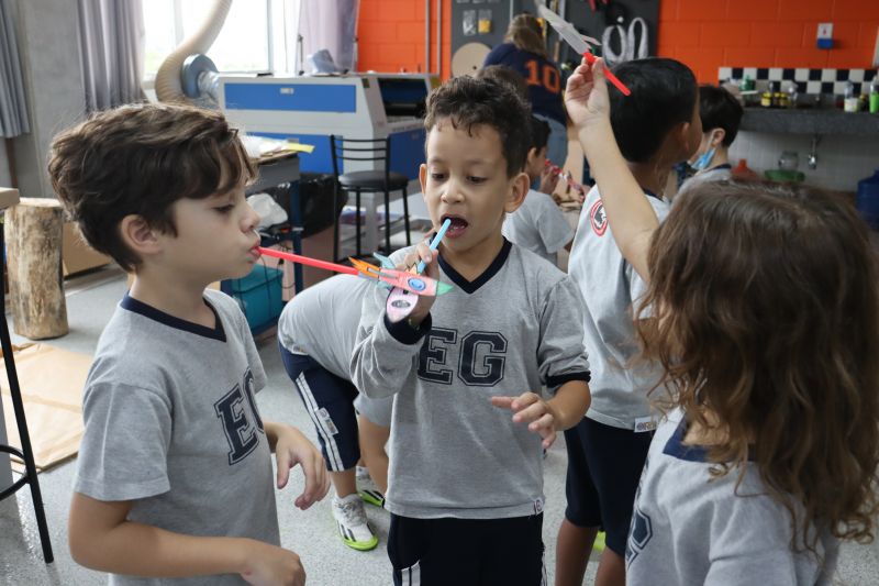 Em um segundo momento, os alunos confeccionaram um foguete de papel, com base de canudo, que com um sopro, podia “voar”.