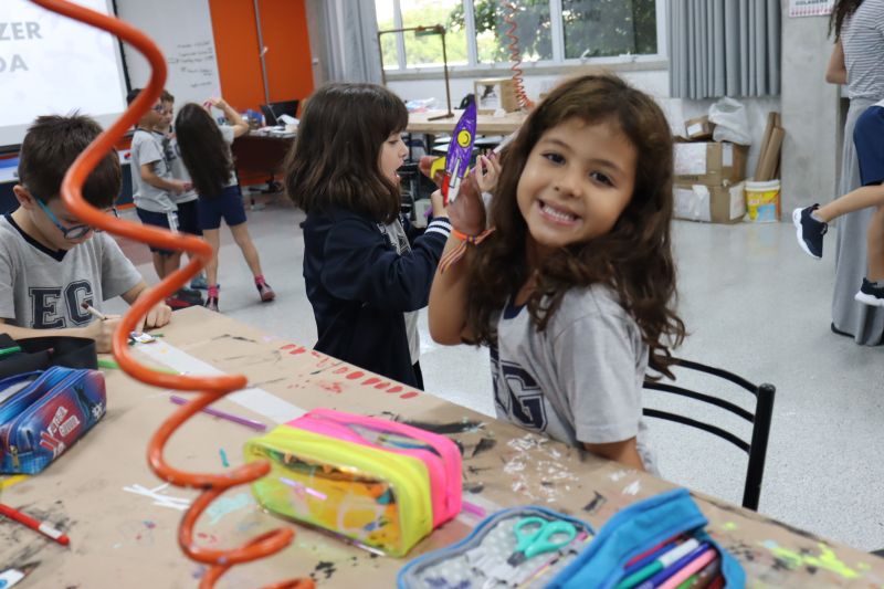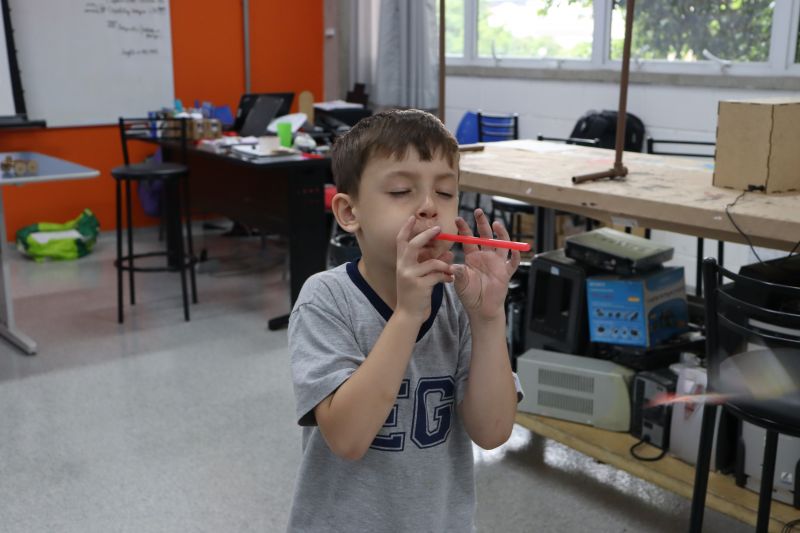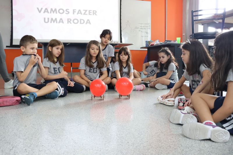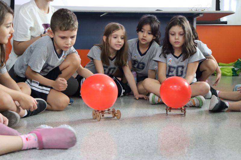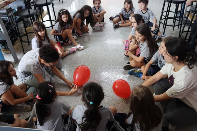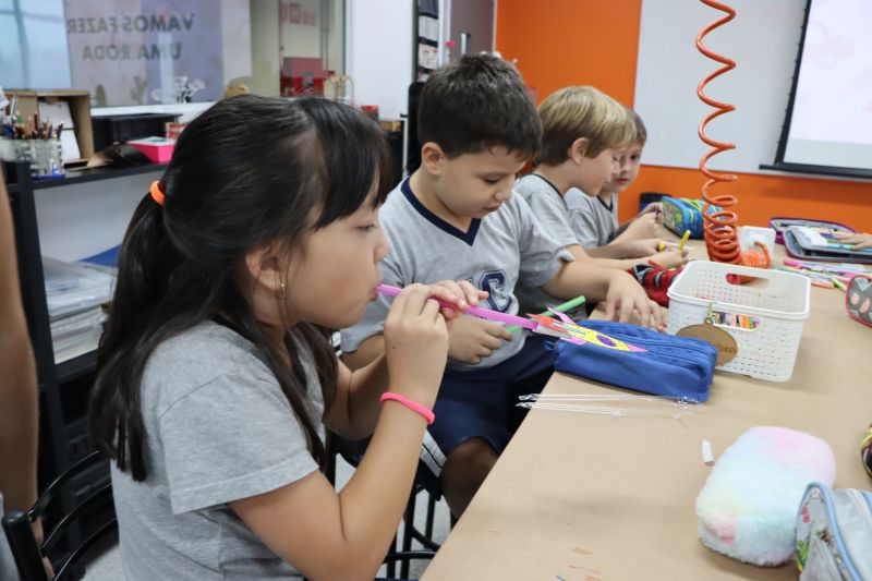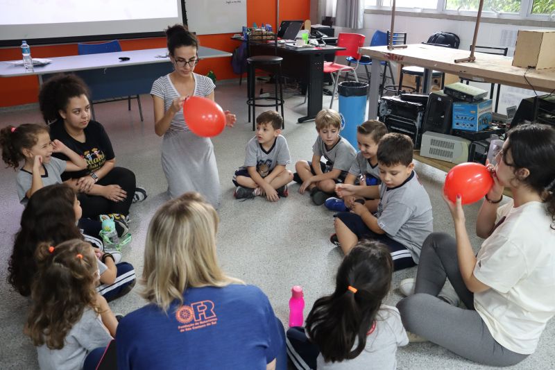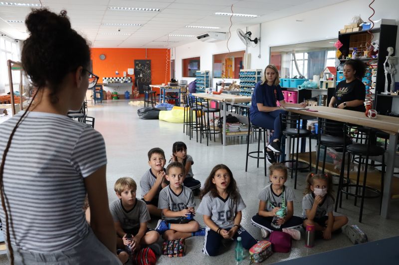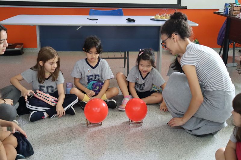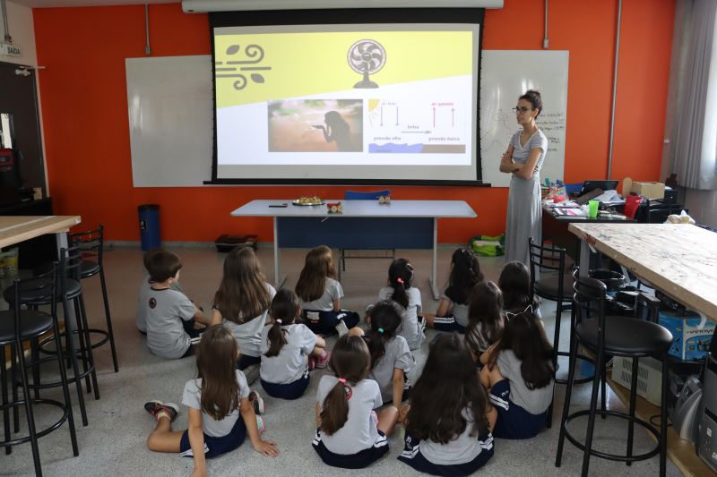 A Virginia, responsável pelo espaço, explicou para os alunos sobre os diferentes tipos de energia e, posteriormente, os estudantes identificaram brinquedos ou objetos que funcionam com pilhas, energia elétrica, energia eólica e com a força do corpo humano.