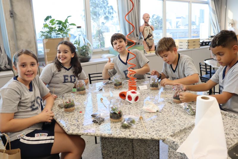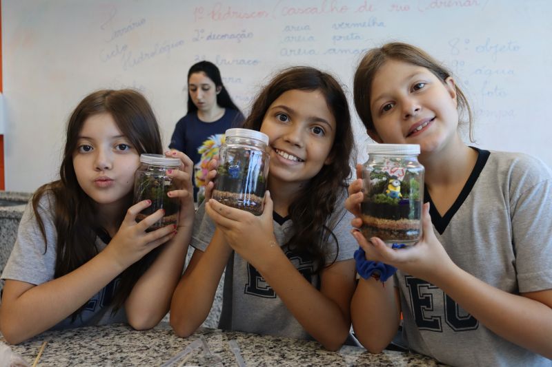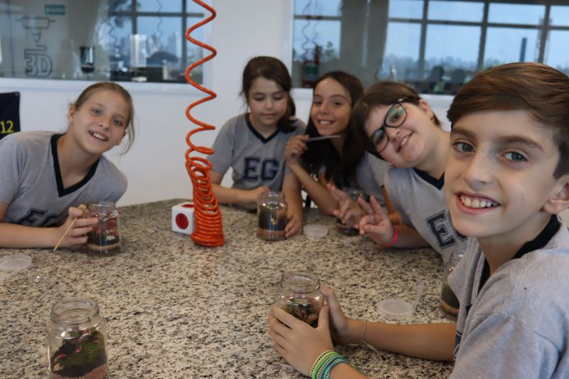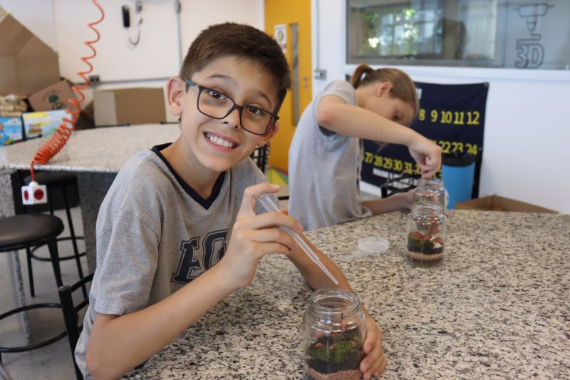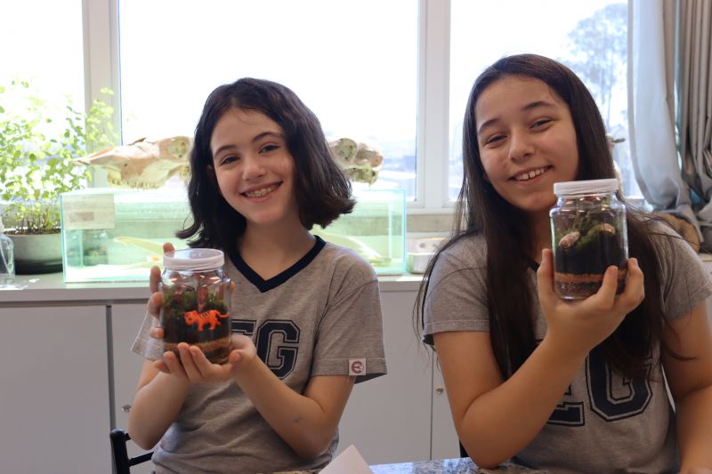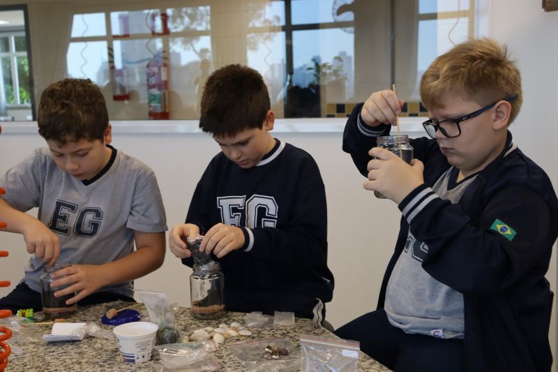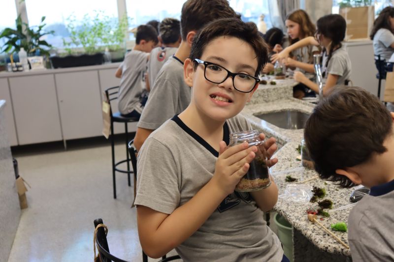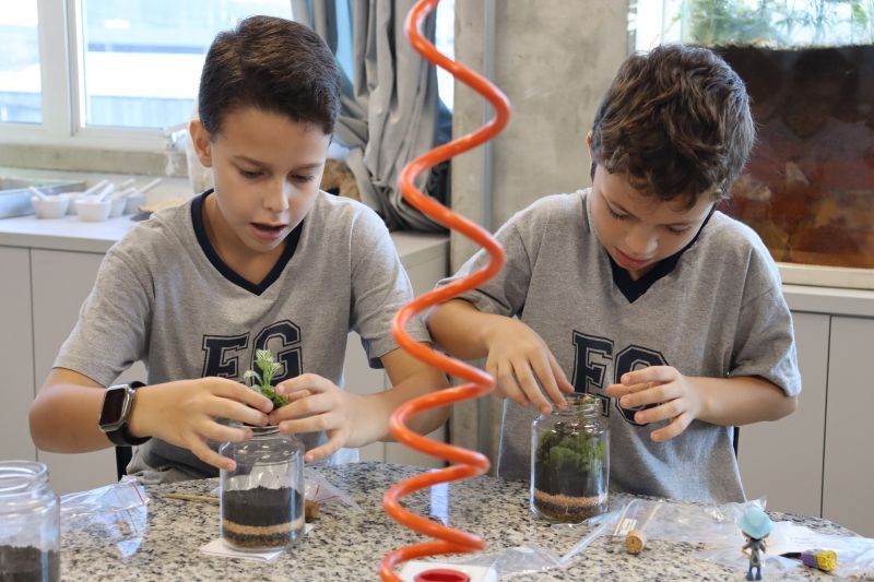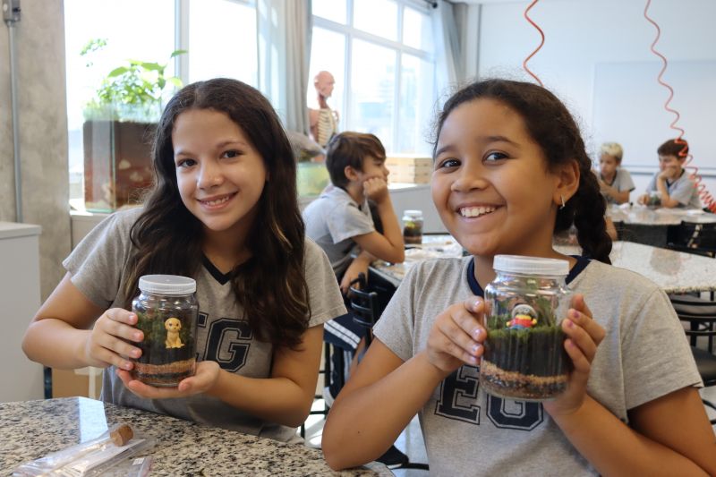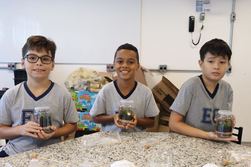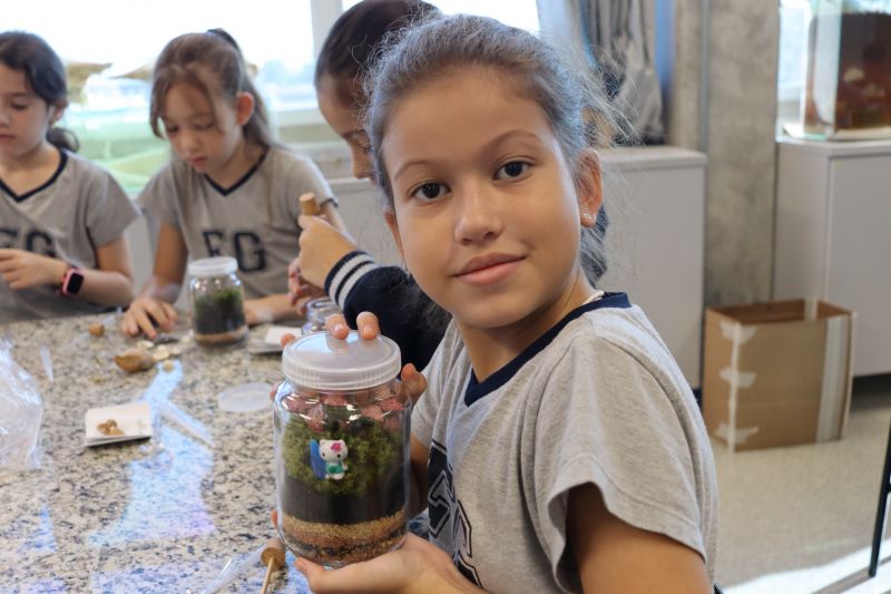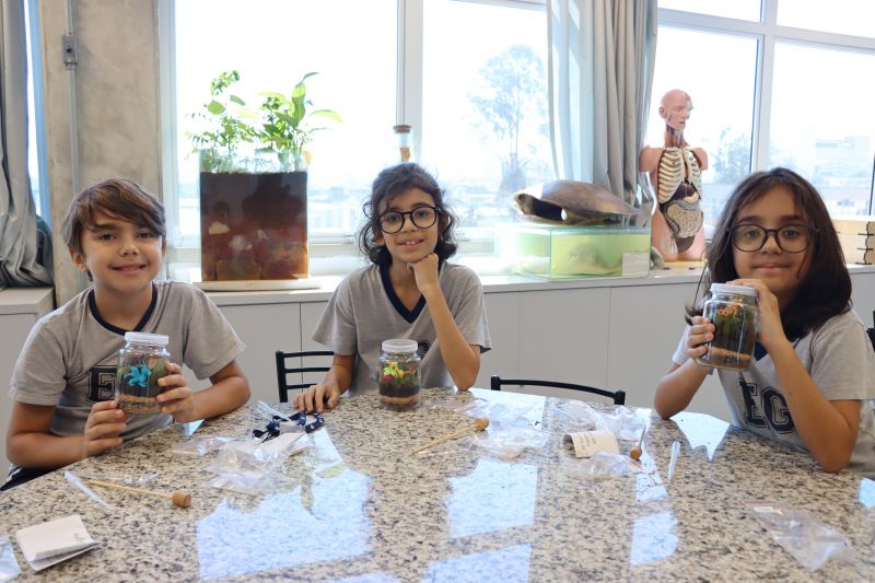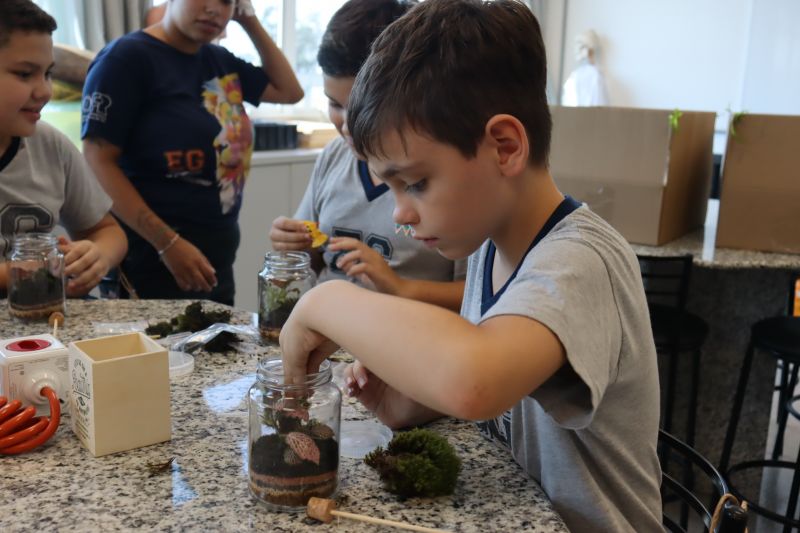 Para dar início à atividade, eles receberam um kit com um pote de vidro, rolha, terra especialmente preparada para terrários, pedras, musgos, mudas de fitônias e miniaturas personalizadas.