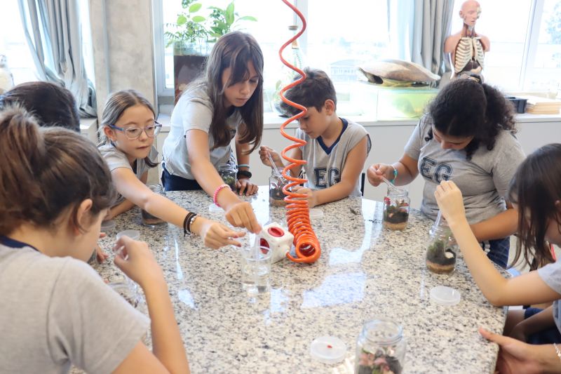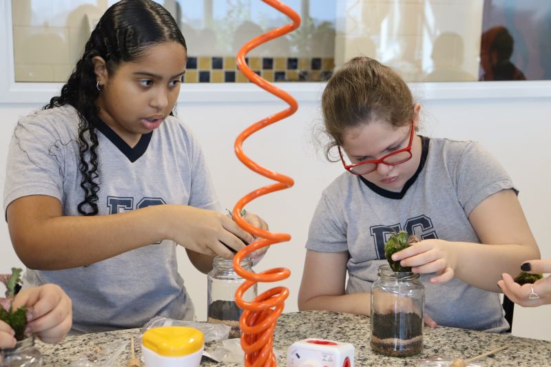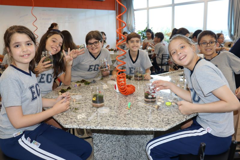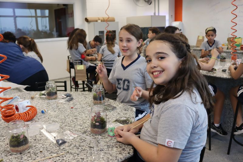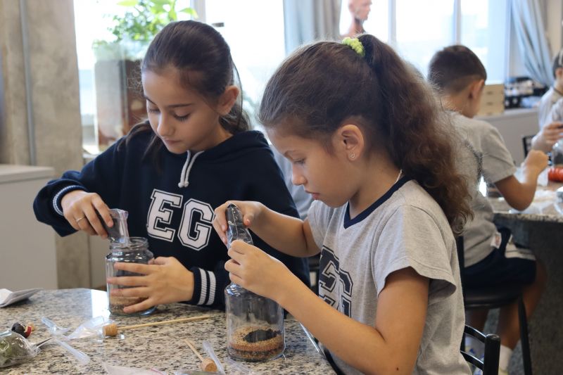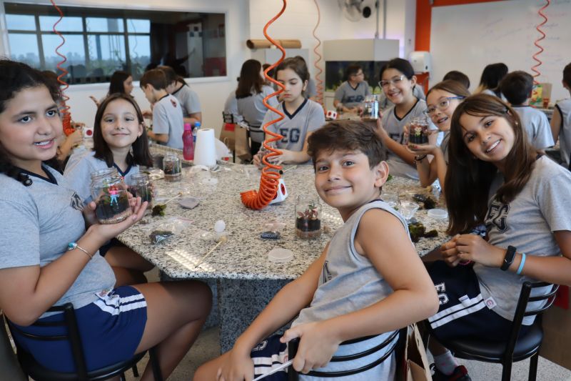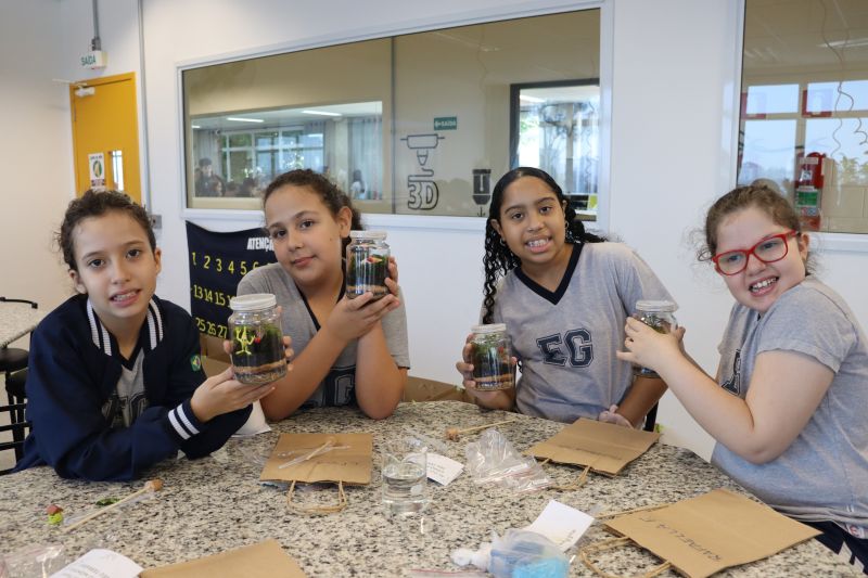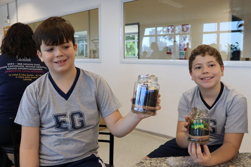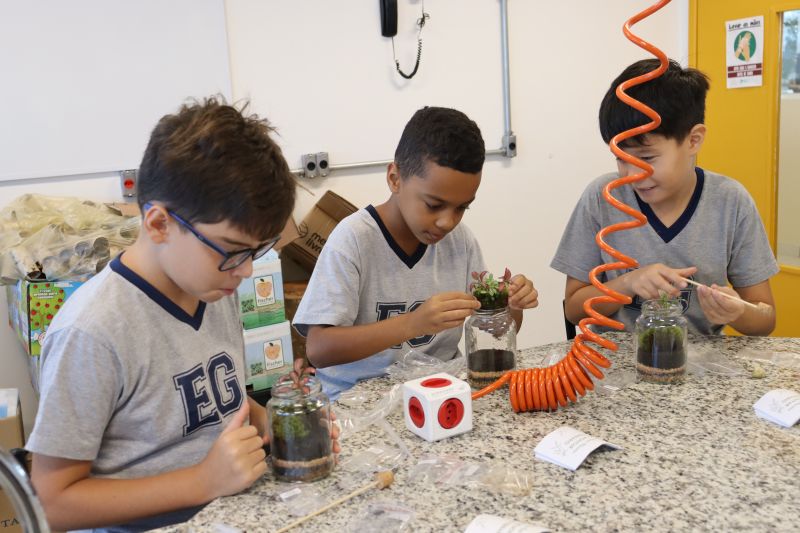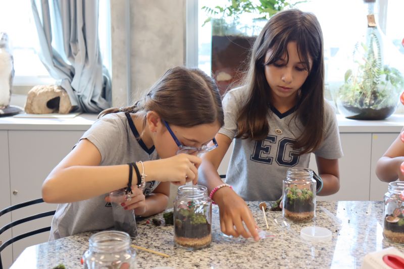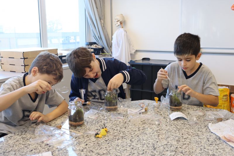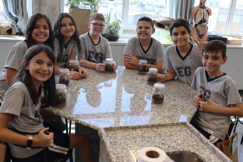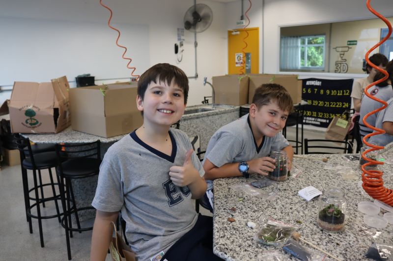 Para dar início à atividade, eles receberam um kit com um pote de vidro, rolha, terra especialmente preparada para terrários, pedras, musgos, mudas de fitônias e miniaturas personalizadas.