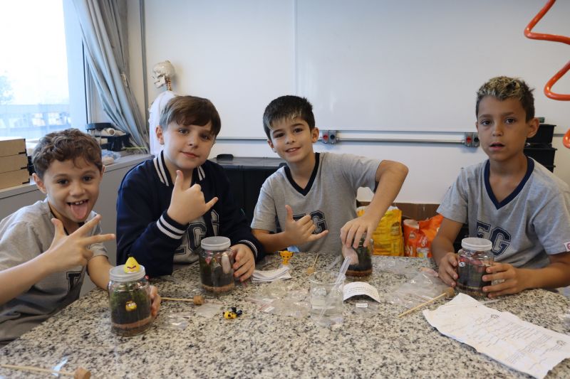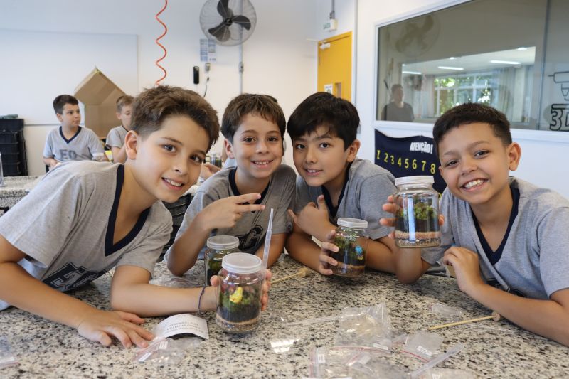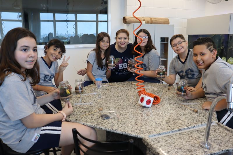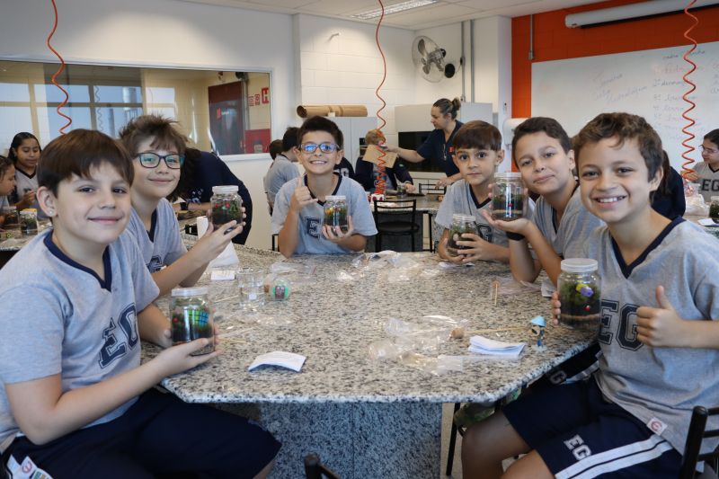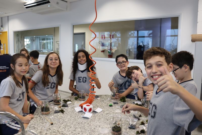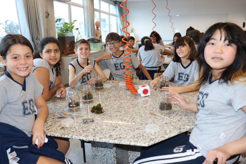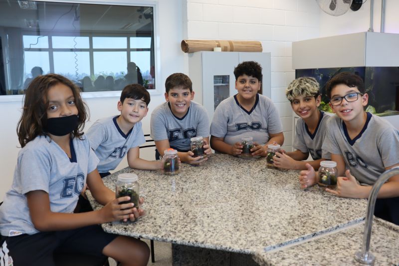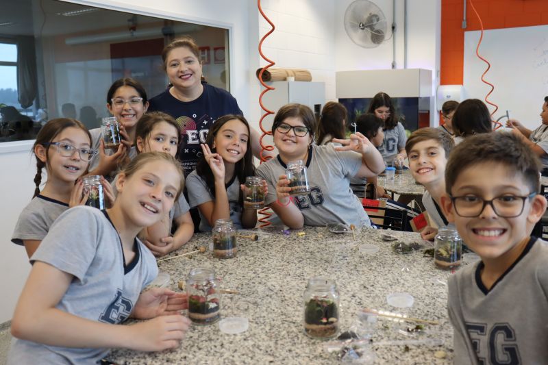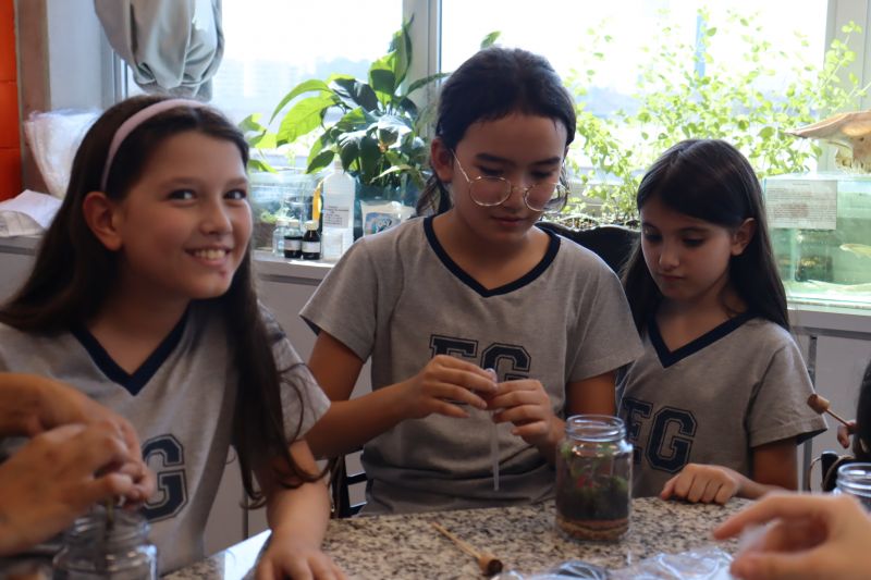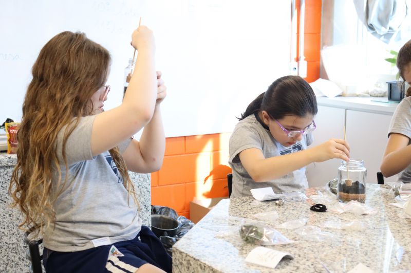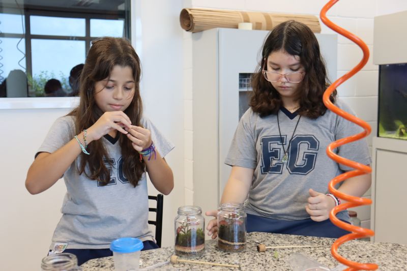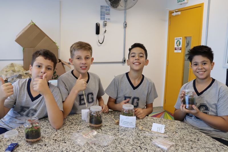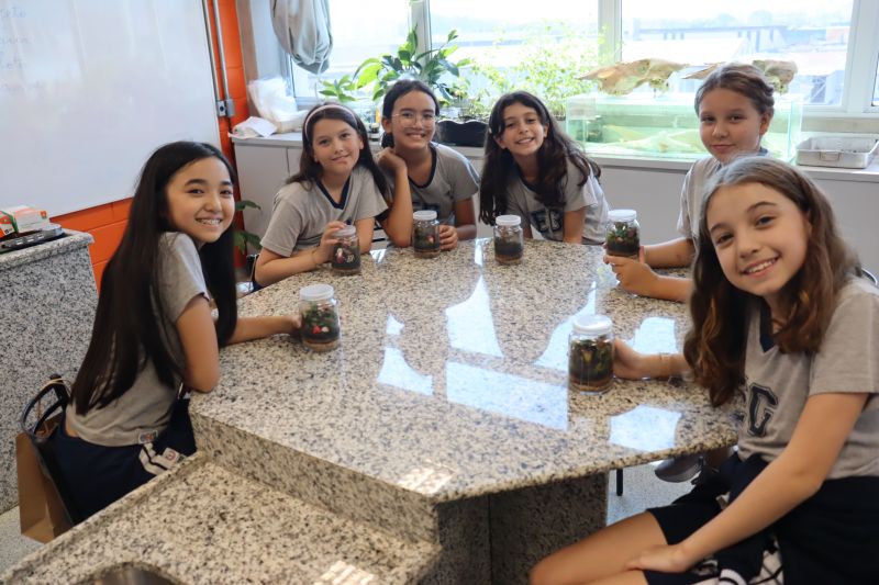 Os estudantes do 5º ano, acompanhados pelas professoras Liliam e Tânia, foram ao Laboratório para confeccionar um terrário, de acordo com estudos realizados em sala de aula.