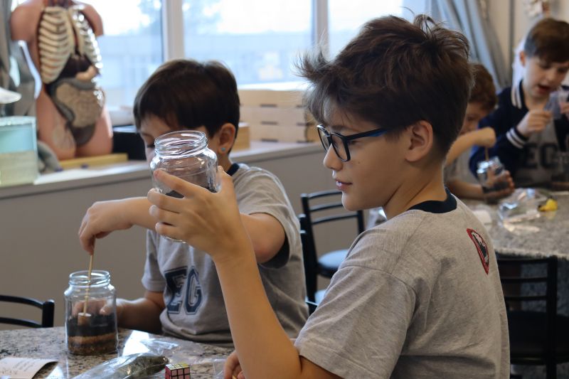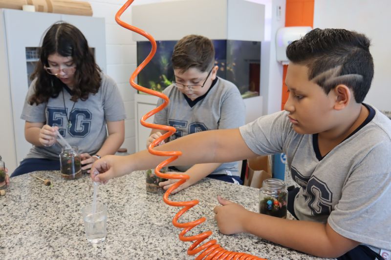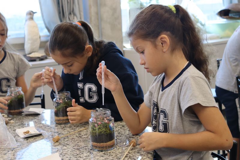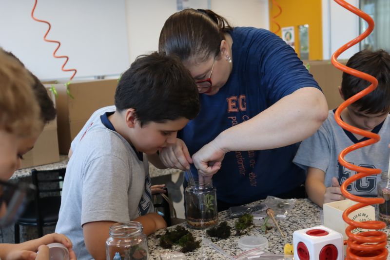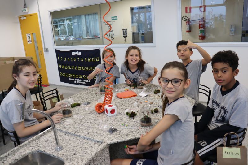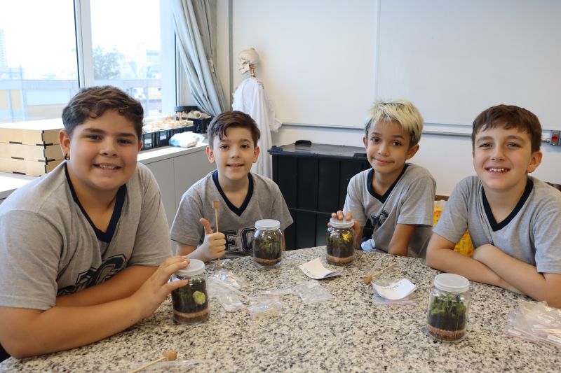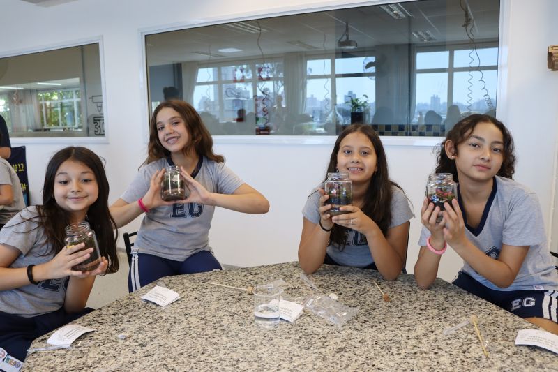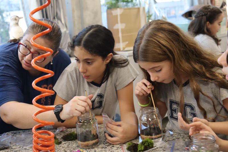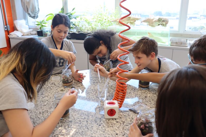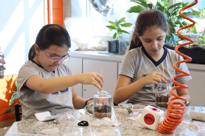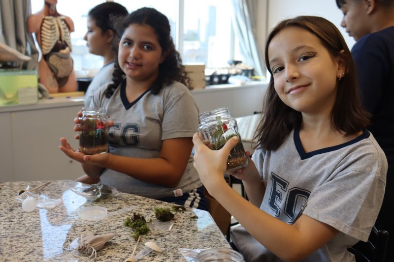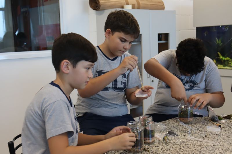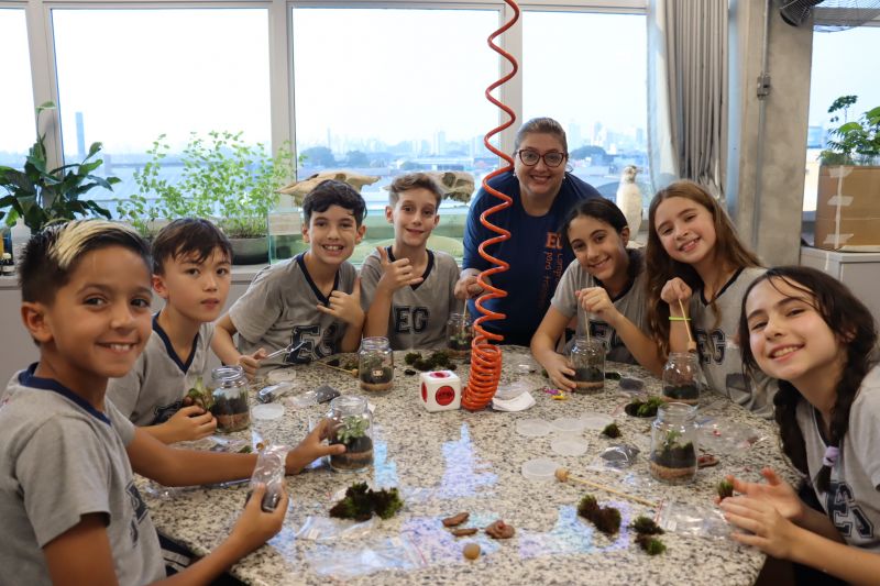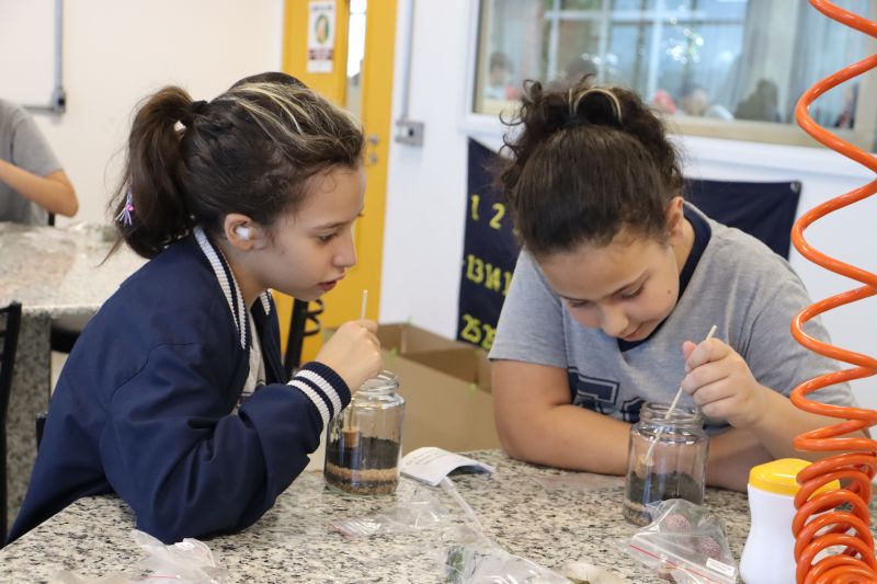 Os estudantes do 5º ano, acompanhados pelas professoras Liliam e Tânia, foram ao Laboratório para confeccionar um terrário, de acordo com estudos realizados em sala de aula.