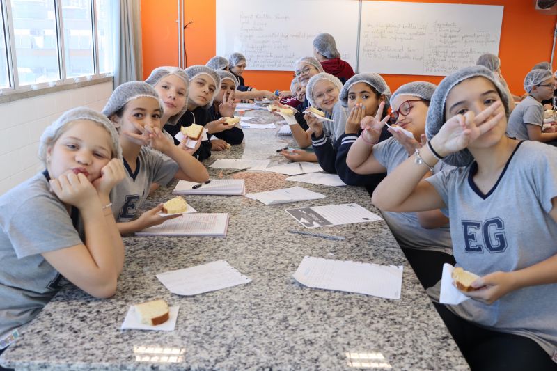 Durante a aula, o Professor Carlos (responsável pelo espaço) orientou e auxiliou os alunos a prepararem uma receita de pão de mandioca, ingrediente originário do Brasil. Após o preparo, todos experimentaram o pão.