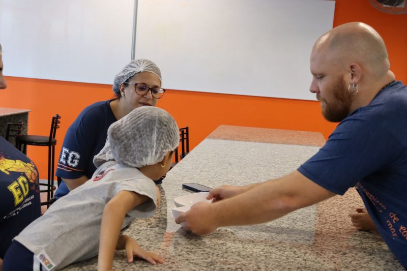Com auxílio do Professor Carlos (responsável pelo espaço), os estudantes observaram as diferenças entre um ovo cru e um ovo cozido. Durante a aula, também verificaram se há diferença entre o ovo de casca branca e o ovo de casca laranja.