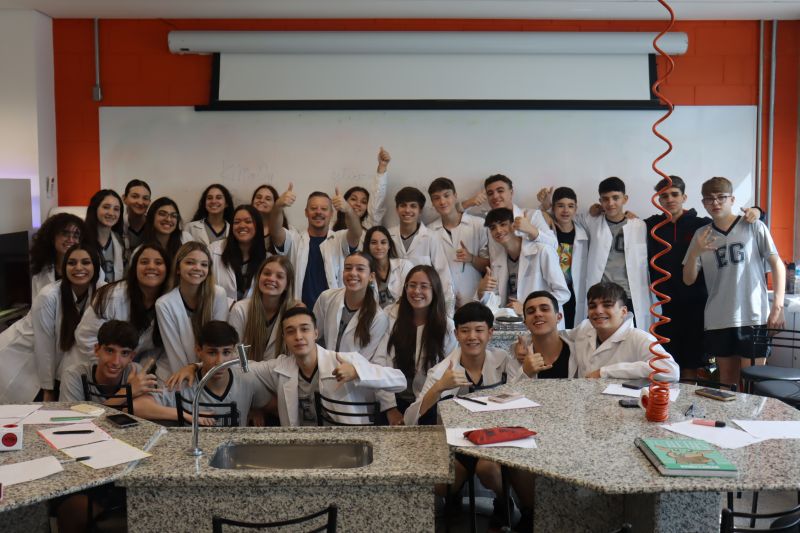 O Professor Alex realizou, com os alunos de 1ª e 2ª séries do Ensino Médio, uma aula prática, no laboratório, com demonstração de alguns tipos de reações químicas, para a construção do trabalho trimestral.