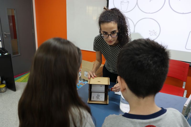 Primeiramente, a Virginia e a Bárbara, responsáveis pelo espaço, conversaram com os estudantes sobre os diferentes tipos de ilusão de ótica e suas características. Em seguida, eles tiveram acesso a alguns experimentos ópticos estudados.