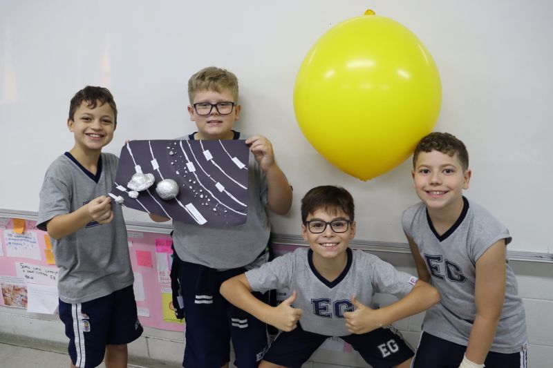 Divididos em grupos, montaram esferas de papel alumínio, representando o tamanho de cada planeta. Para reproduzir o Sol, foi utilizado um balão de látex, na cor amarela.