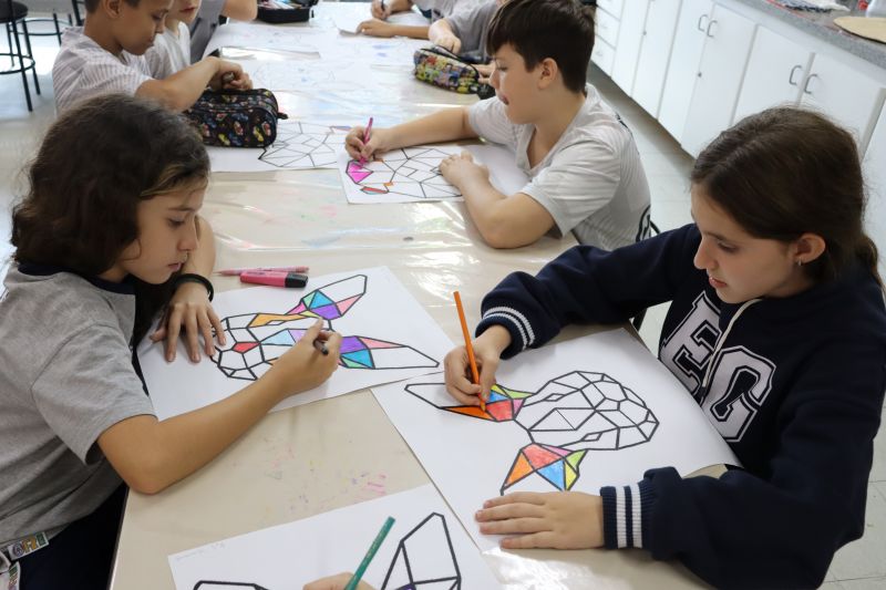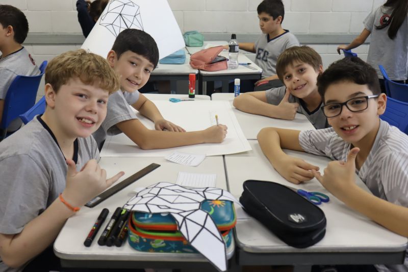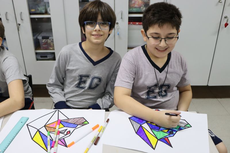 Sob orientação da Professora Tânia, os alunos do 5º ano do EF realizaram um trabalho inspirado nas obras do Romero Britto, para provar que a geometria está muito presente na arte.