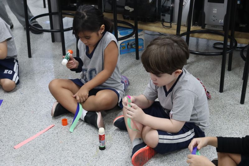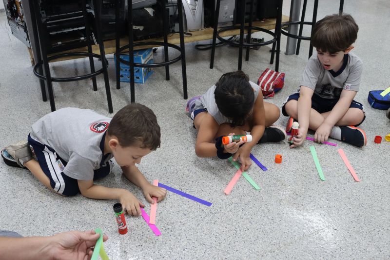 Em outro momento, eles foram até o Espaço Maker e, com o auxílio da Virginia, responsável pelo espaço, confeccionaram uma decoração junina.