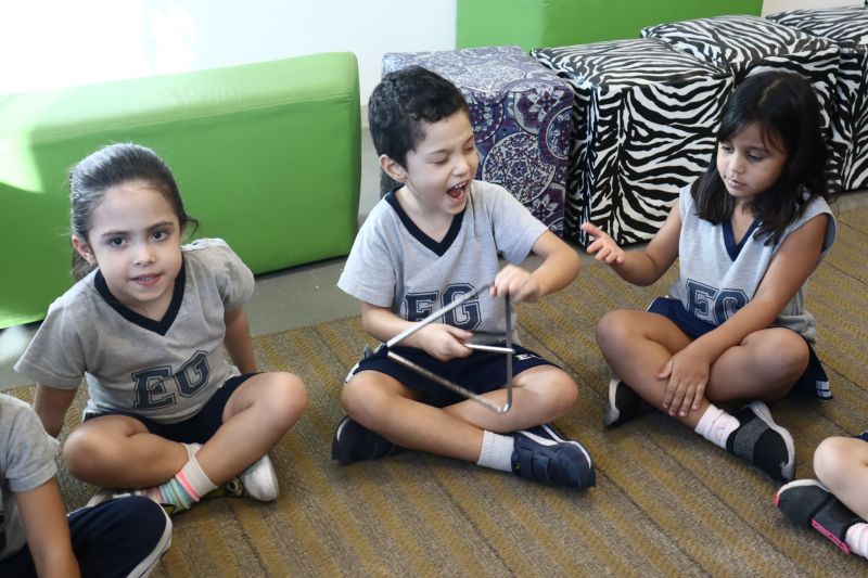 Na sala de musicalização, o Professor Gideon, de Música, apresentou aos estudantes algumas canções e instrumentos muito utilizados em festas juninas. Em seguida, as crianças confeccionaram uma sanfona, utilizando rolo de papel higiênico, papéis e canetas coloridas.