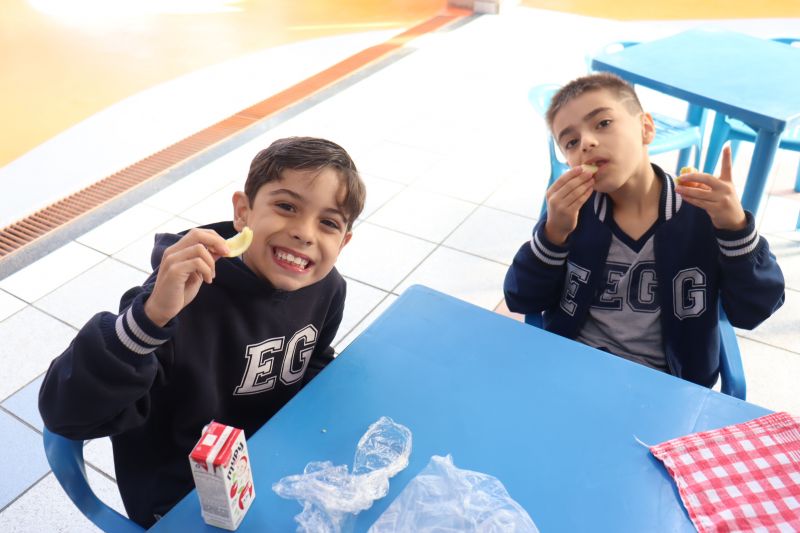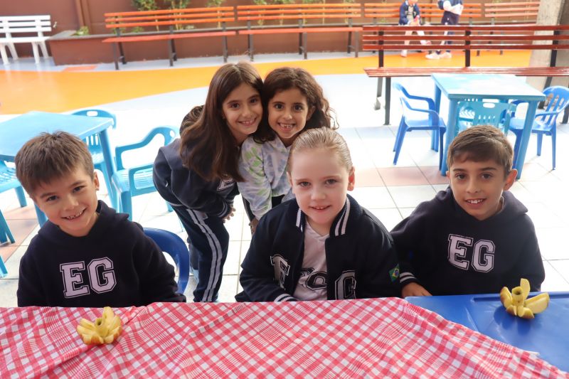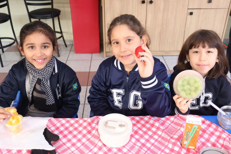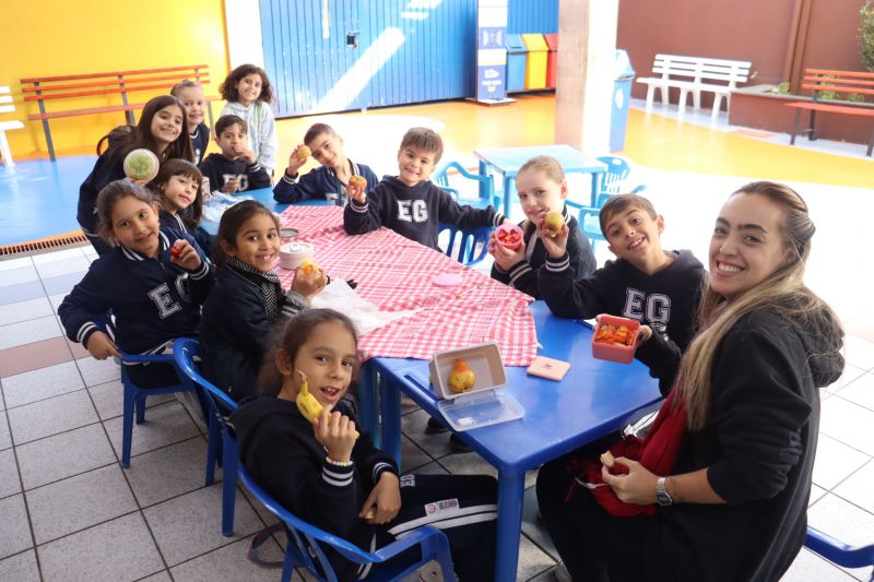 As turmas foram até o pátio infantil do Colégio e realizaram um piquenique apenas com alimentos saudáveis, como frutas, legumes e verduras.