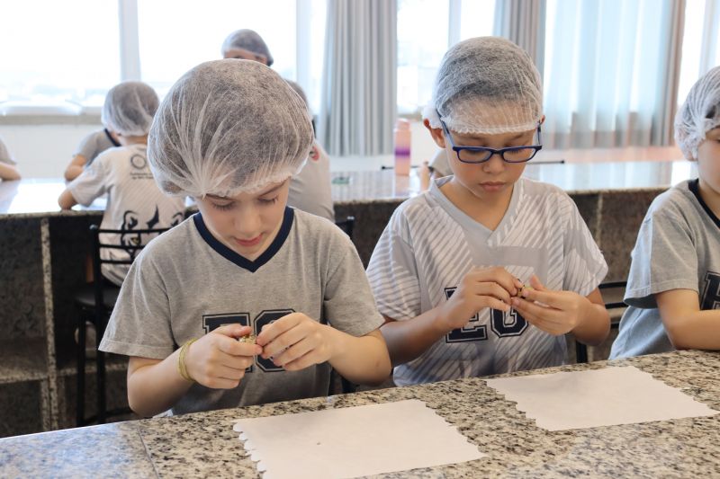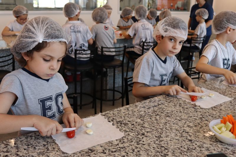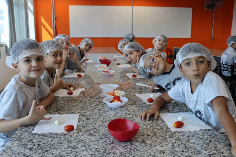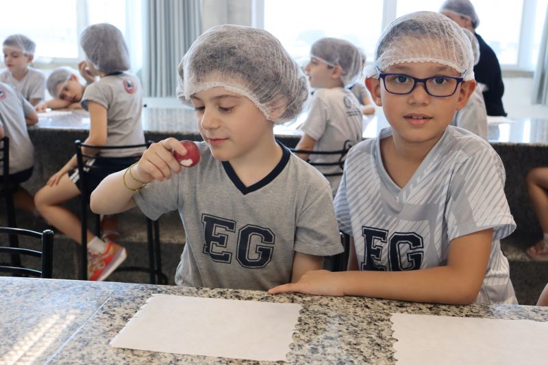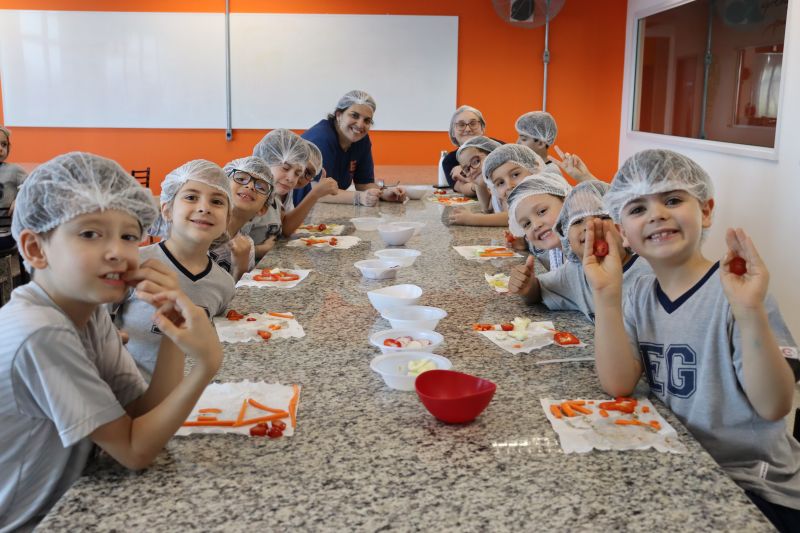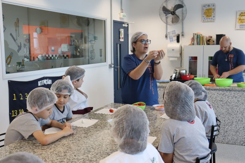 A Teacher Roberta, de Inglês, preparou uma aula especial de cook time, na Cozinha Experimental, para os alunos do 1º ano do EF.