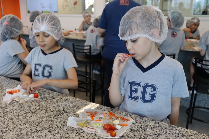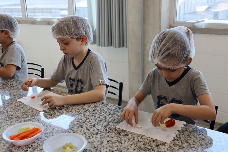 Os alunos, com comandos em inglês, revisitaram os objetos de conhecimento estudados em sala de aula, como shapes, colors, action verbs, etc. Com a ajuda do Professor Carlos, responsável pelo espaço, os estudantes criaram pratos saudáveis, em formato de sólidos geométricos.