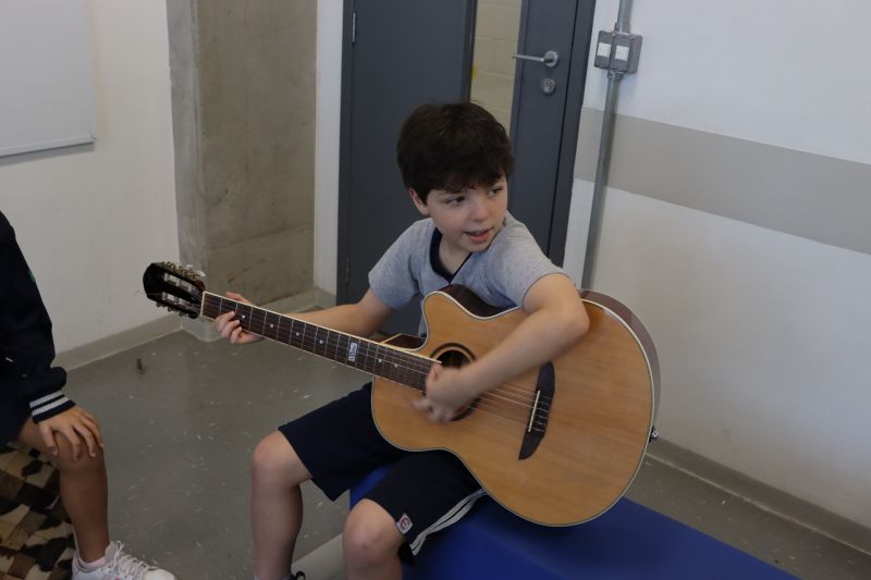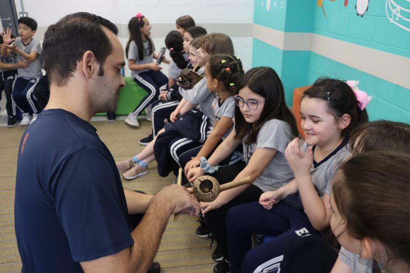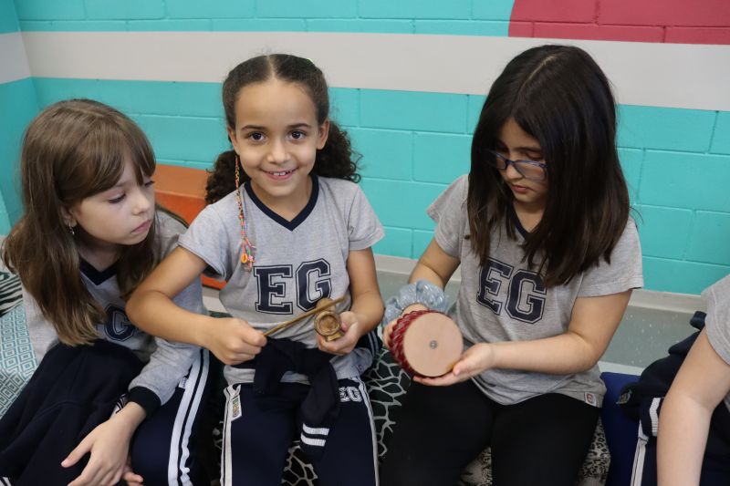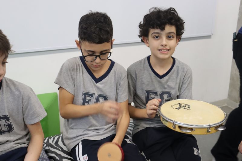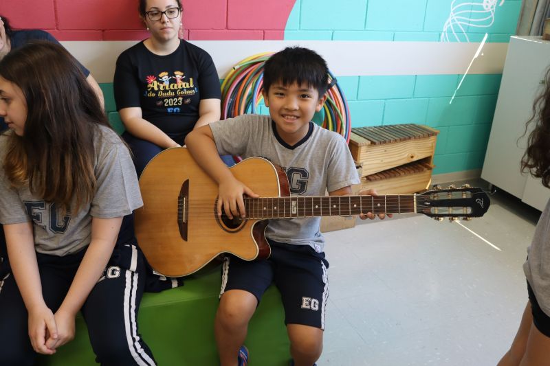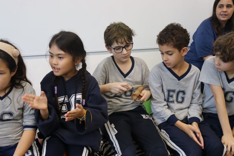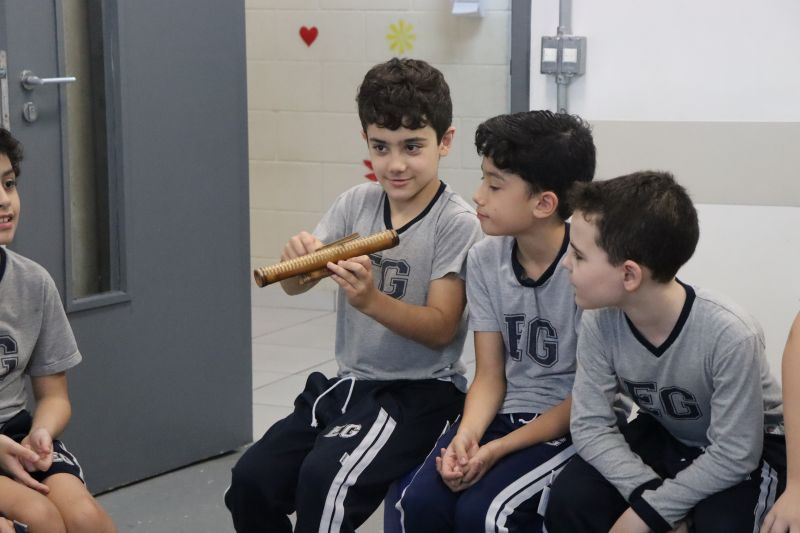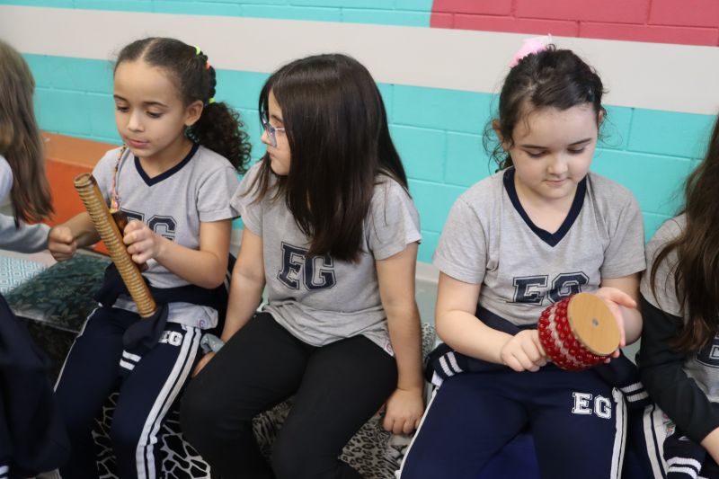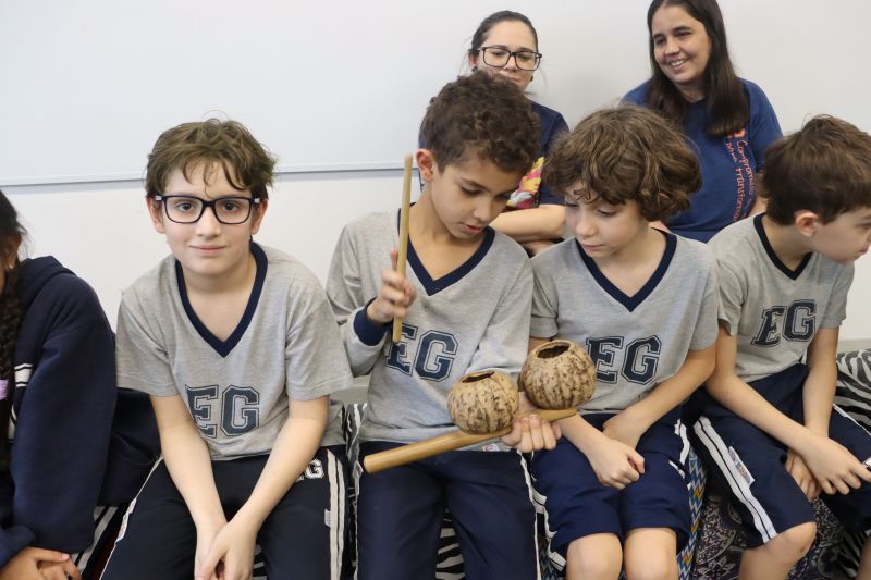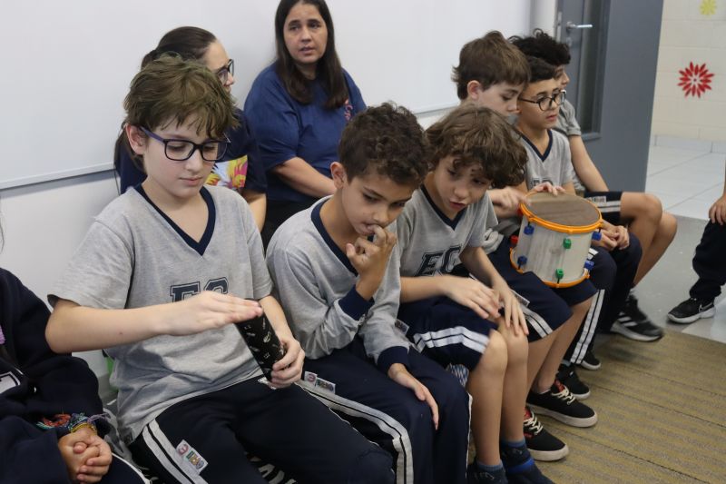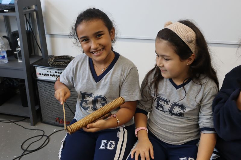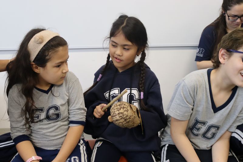 Seguindo as orientações do Professor Gideon, de Música, os estudantes conheceram diversos instrumentos musicais de sopro, corda e percussão, como reco-reco, violão, guitarra, flauta doce, xilofone, chocalho e clava.