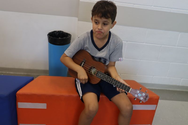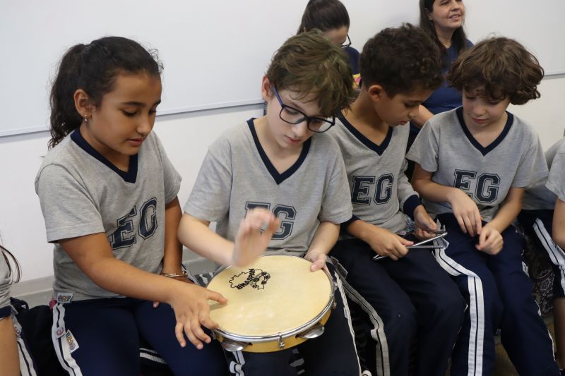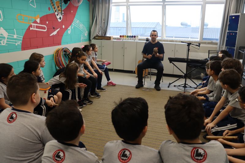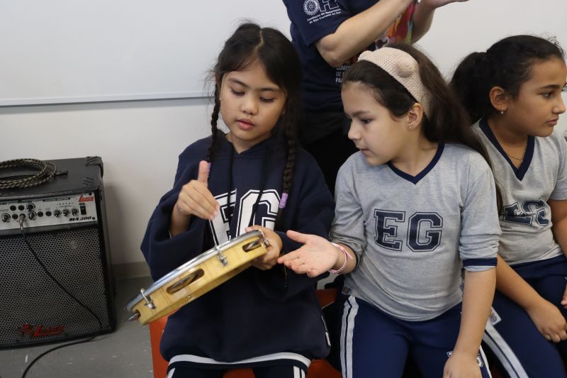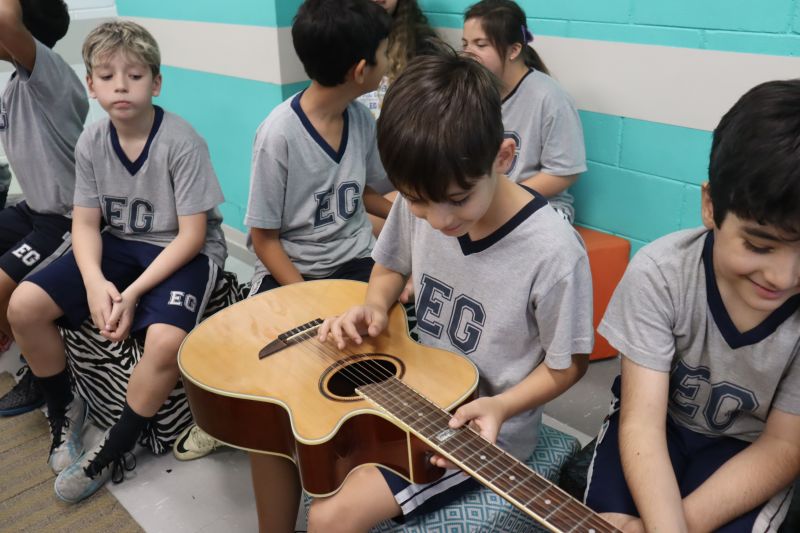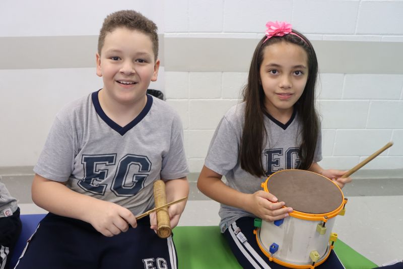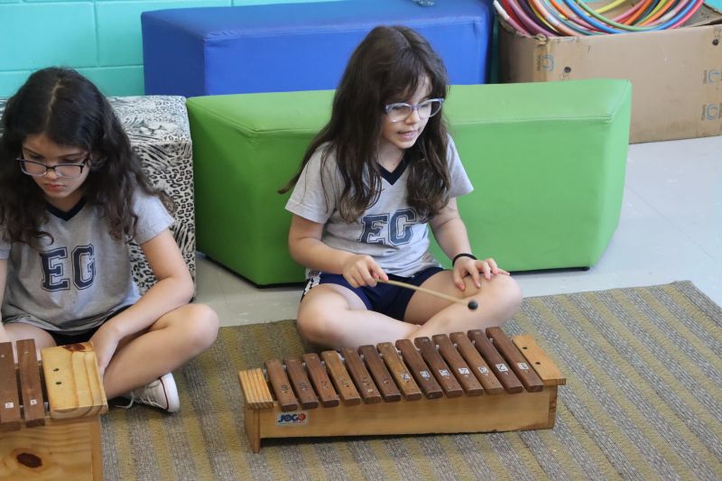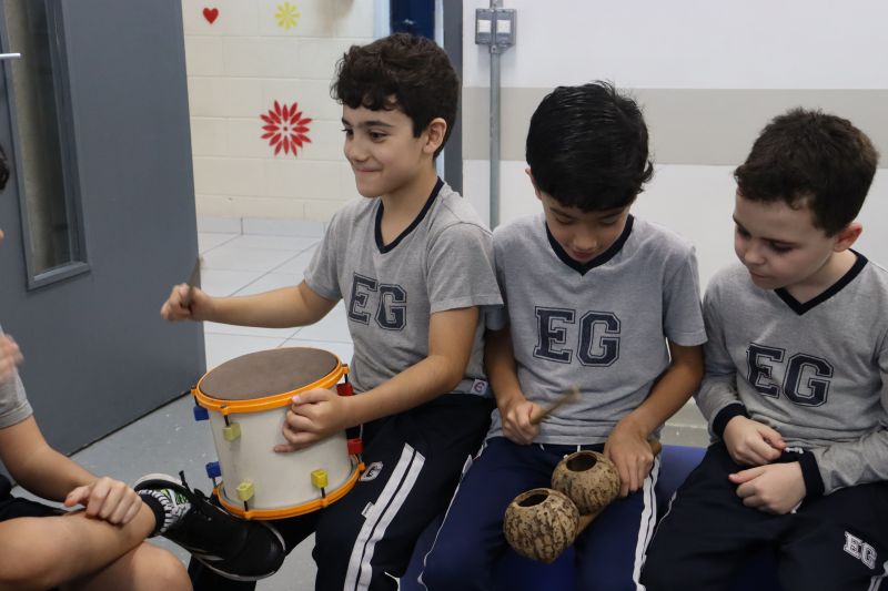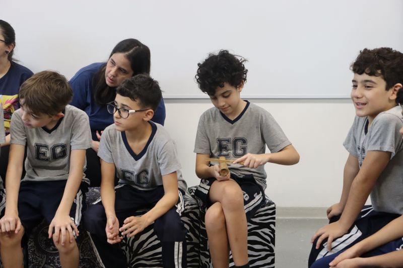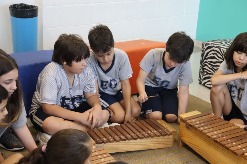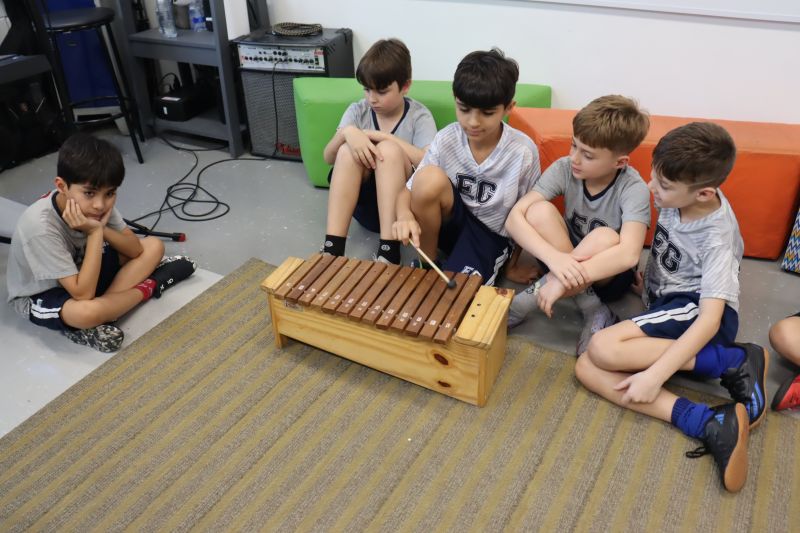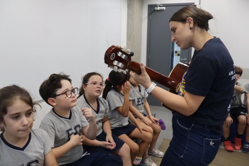 Seguindo as orientações do Professor Gideon, de Música, os estudantes conheceram diversos instrumentos musicais de sopro, corda e percussão, como reco-reco, violão, guitarra, flauta doce, xilofone, chocalho e clava.