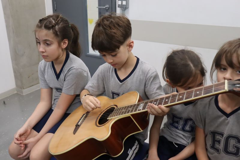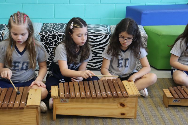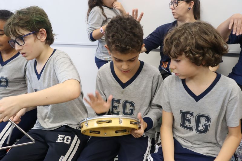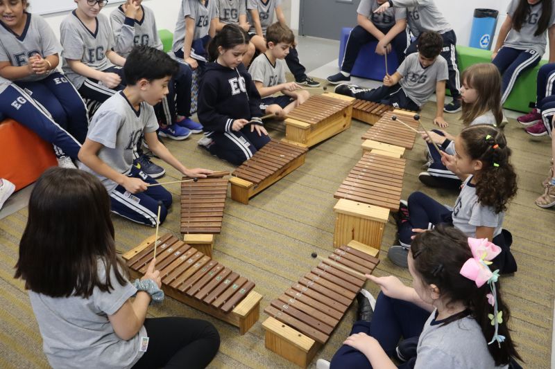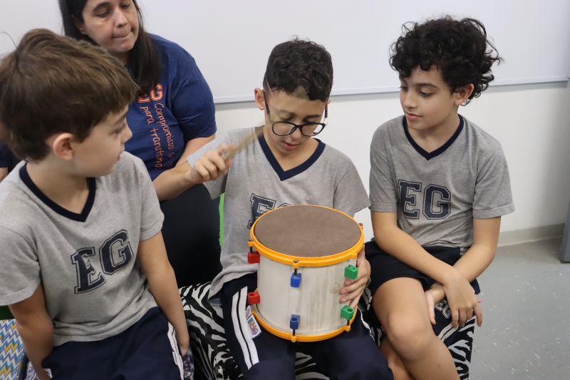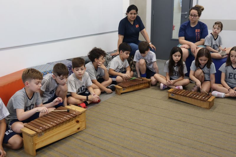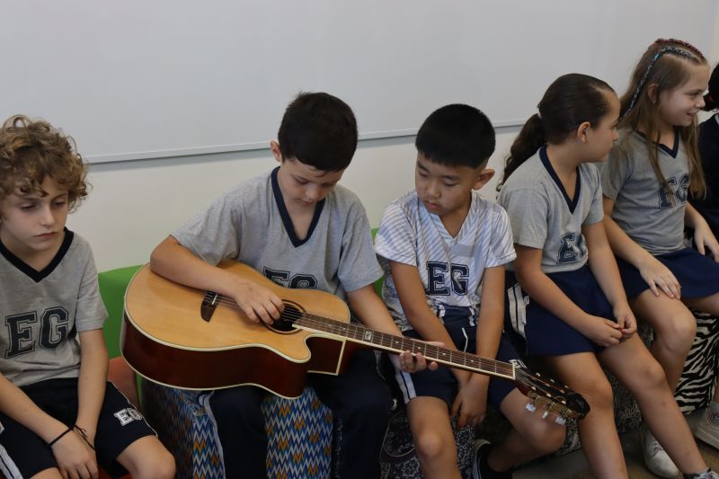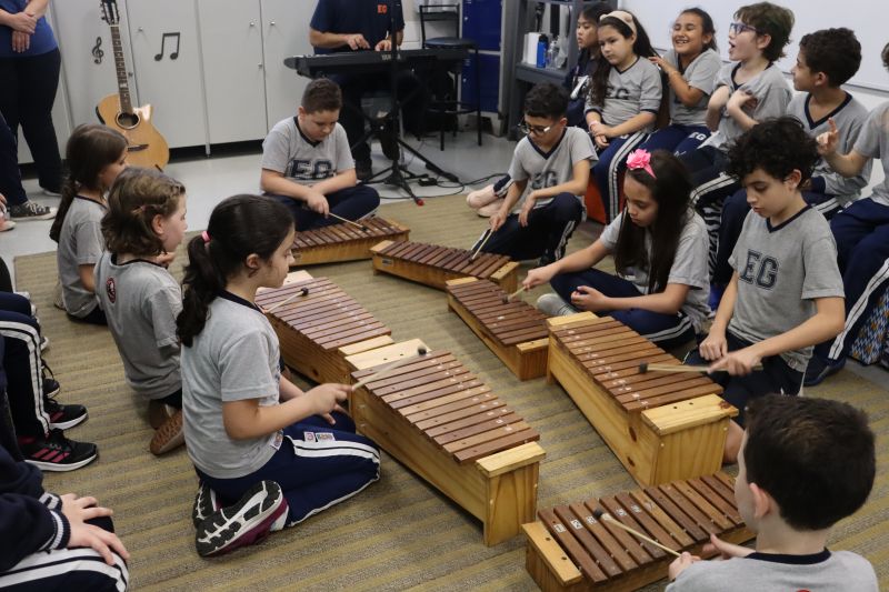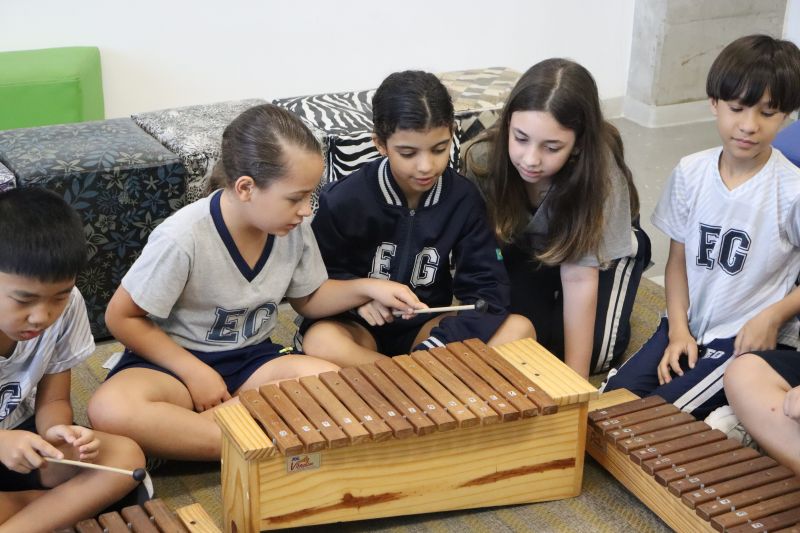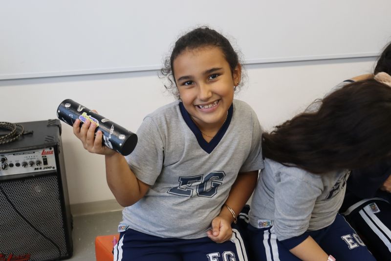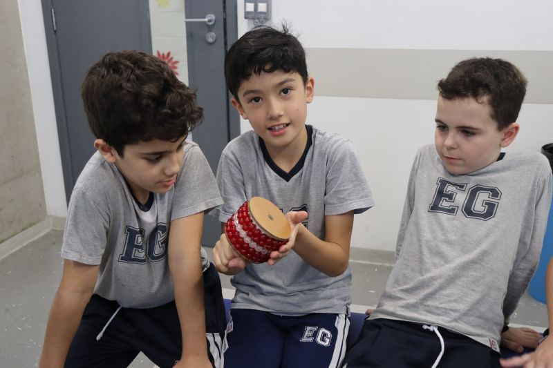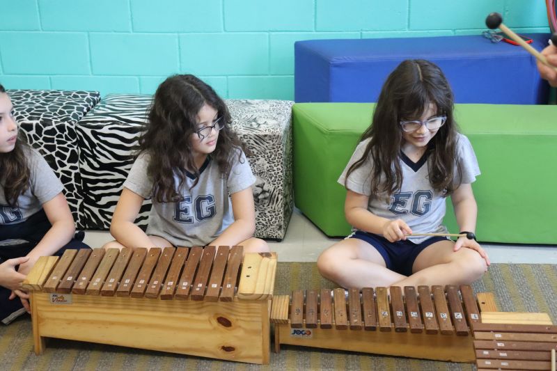 Seguindo as orientações do Professor Gideon, de Música, os estudantes conheceram diversos instrumentos musicais de sopro, corda e percussão, como reco-reco, violão, guitarra, flauta doce, xilofone, chocalho e clava.