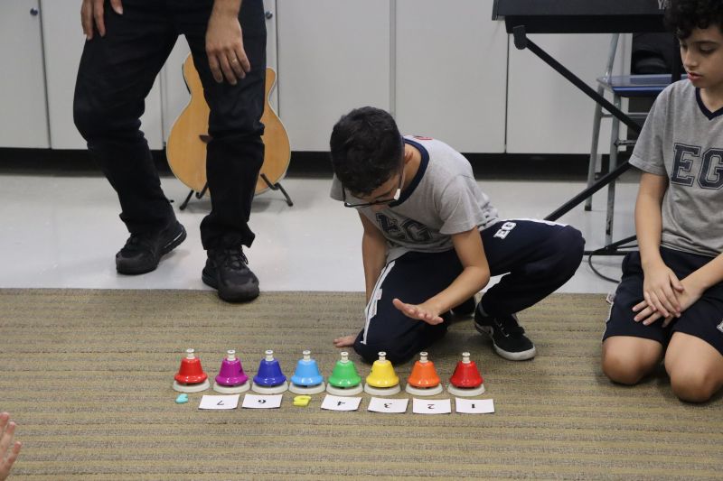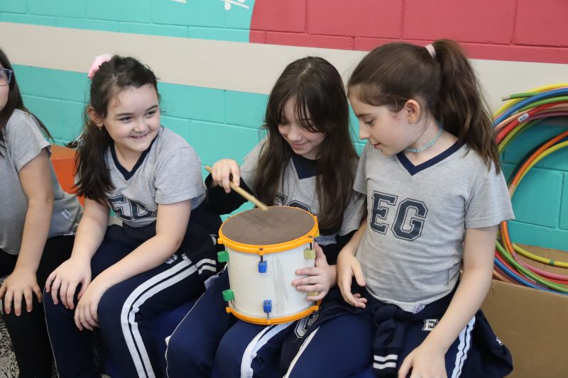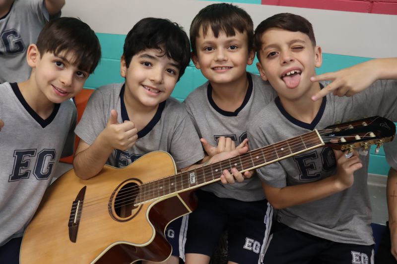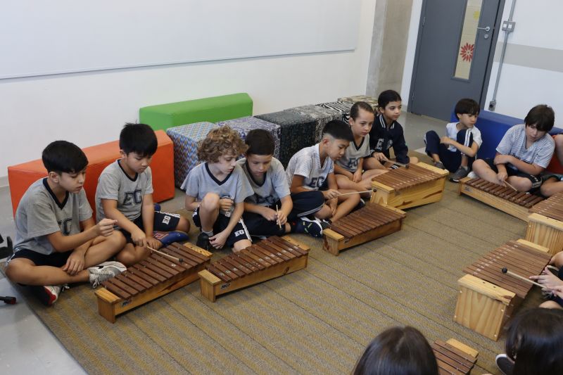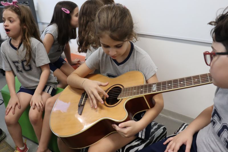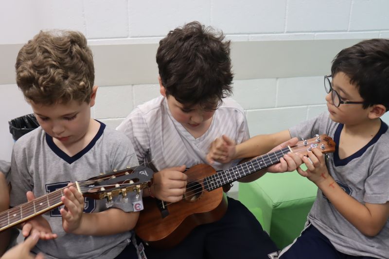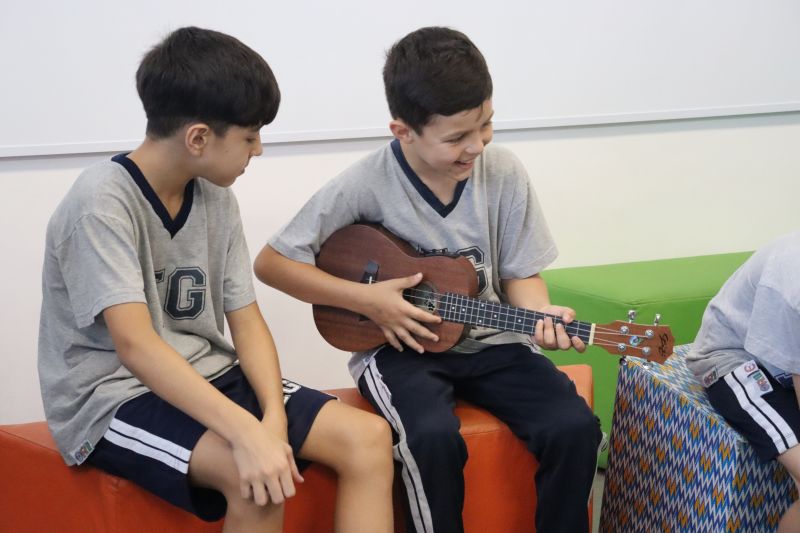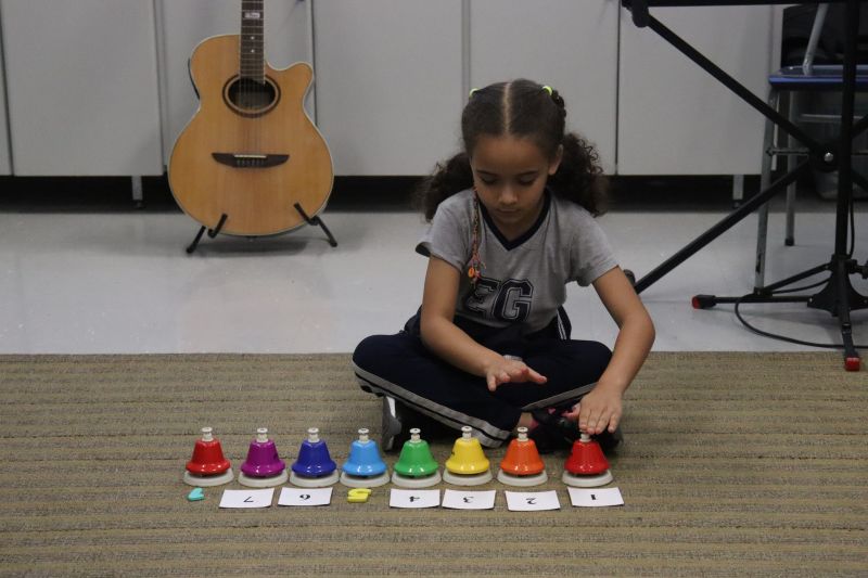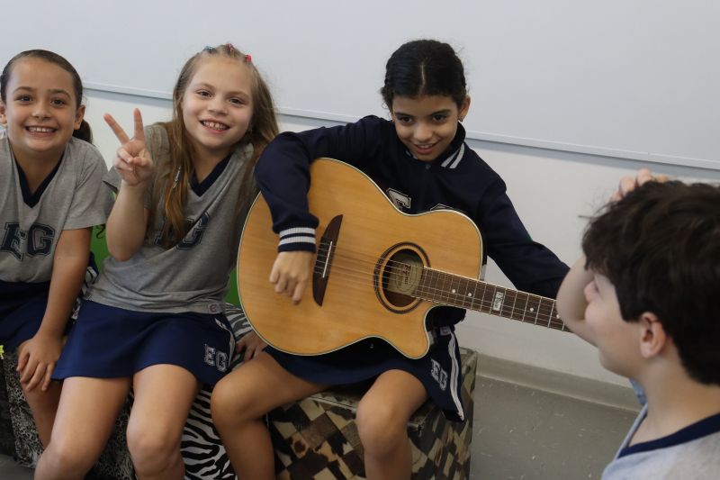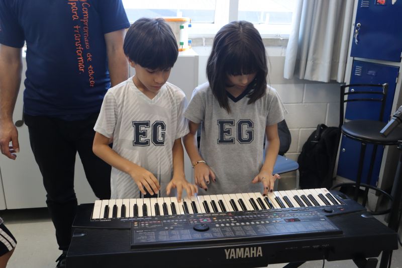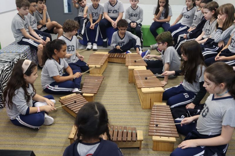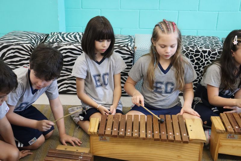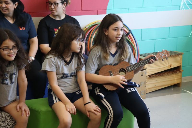 Seguindo as orientações do Professor Gideon, de Música, os estudantes conheceram diversos instrumentos musicais de sopro, corda e percussão, como reco-reco, violão, guitarra, flauta doce, xilofone, chocalho e clava.