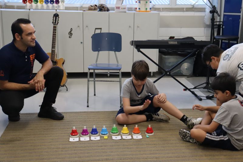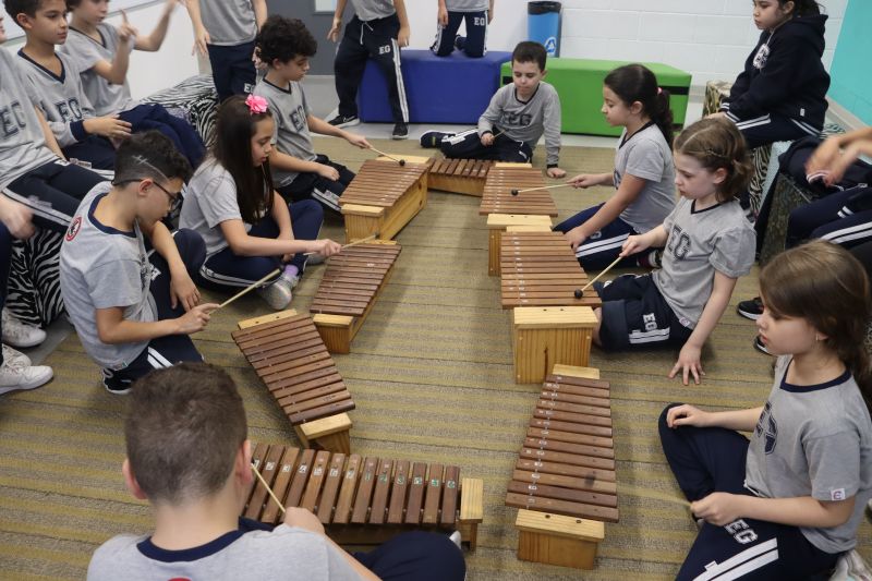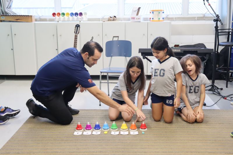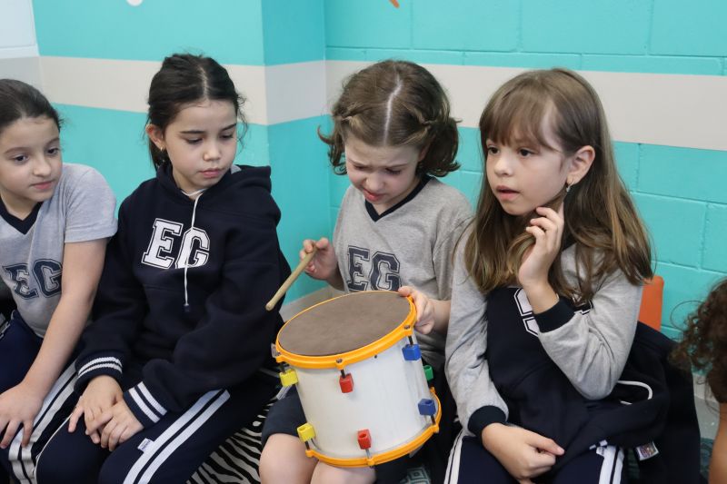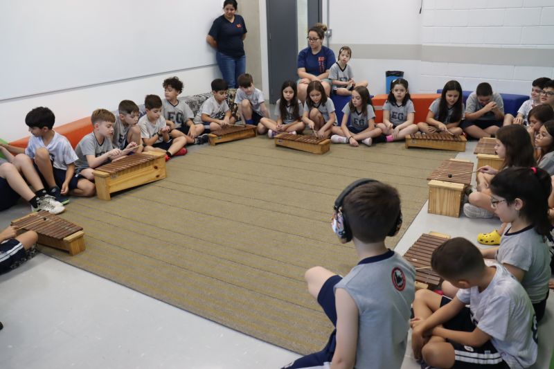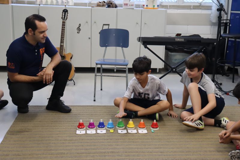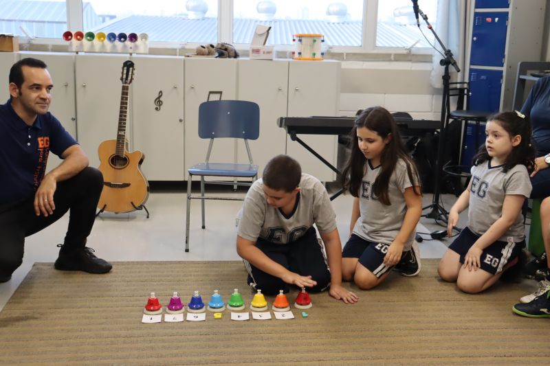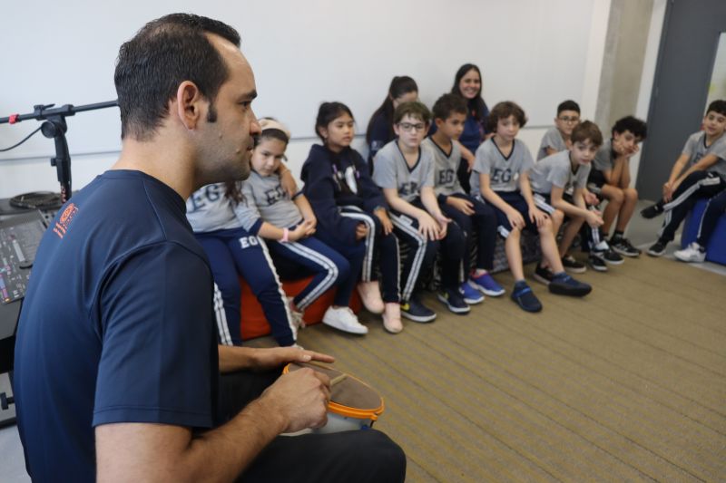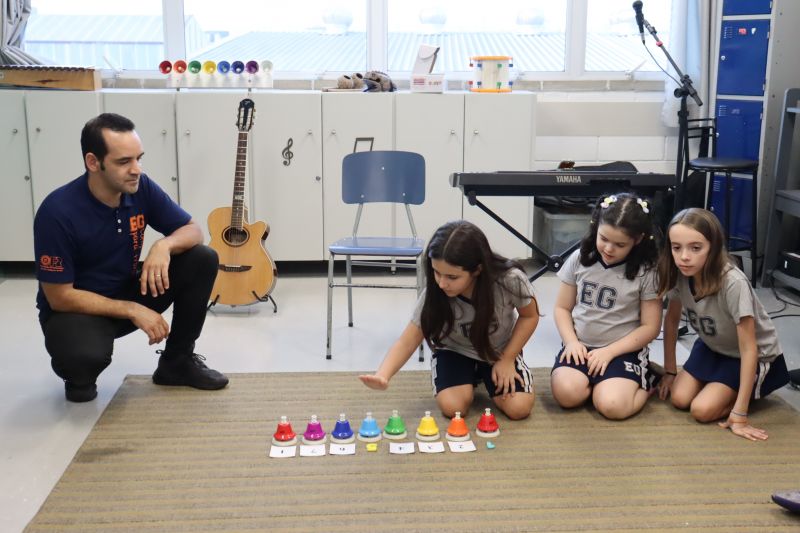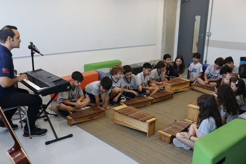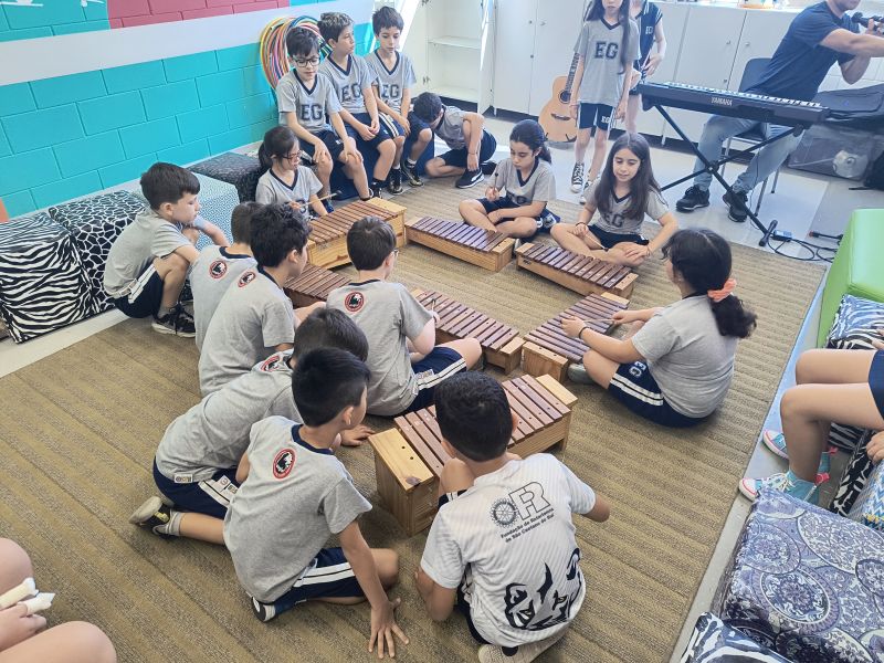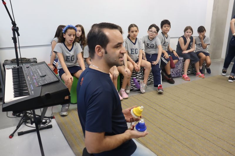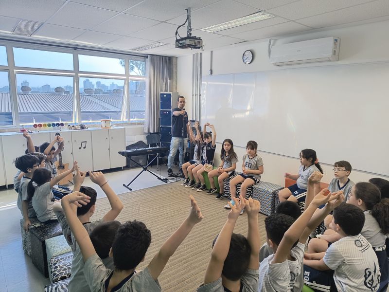 Acompanhados pelas Professoras Tatiana, Gina, Letícia, Paula e Cida, os alunos do 3º ano do EF foram à sala de musicalização.