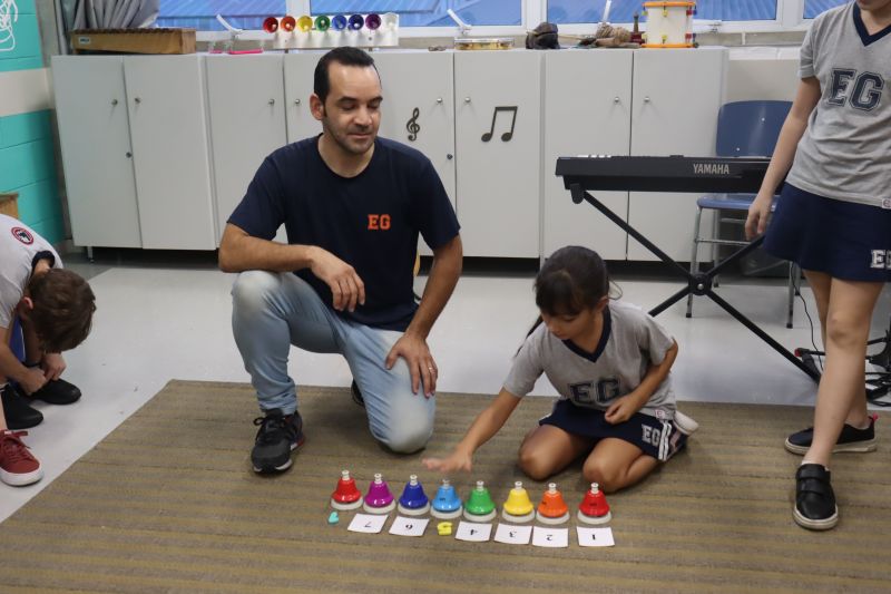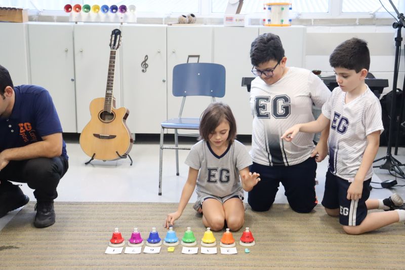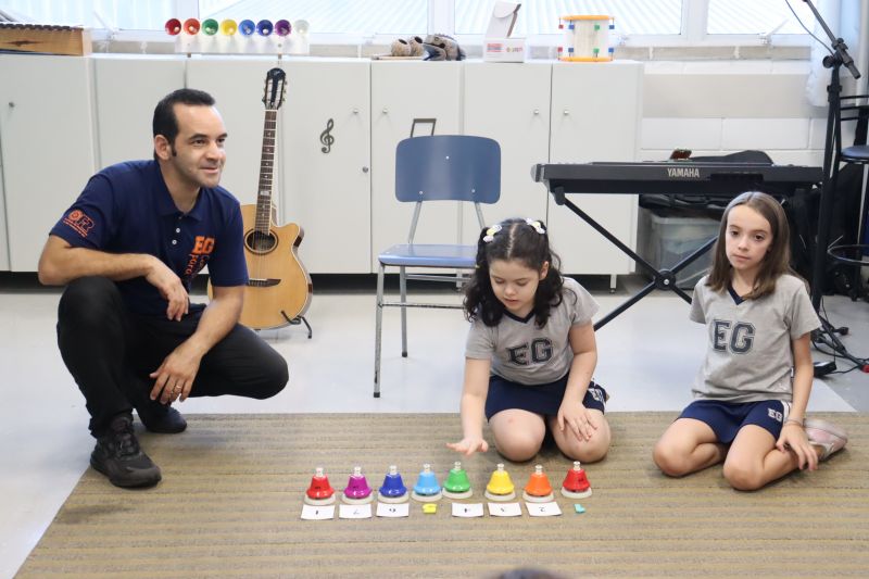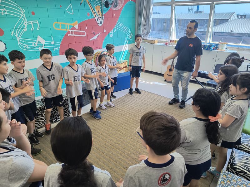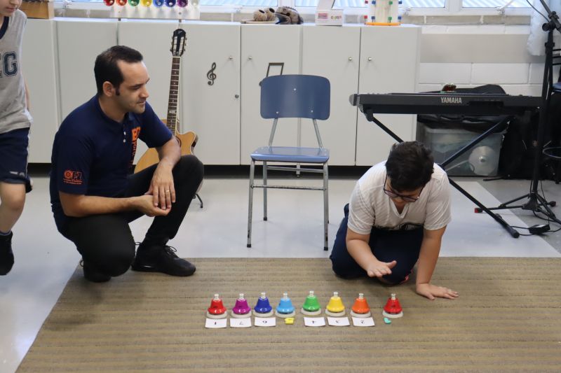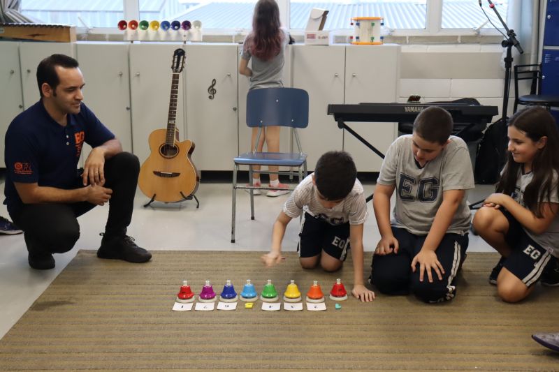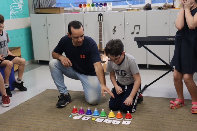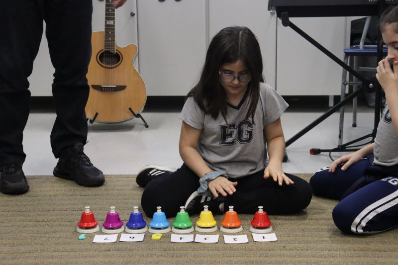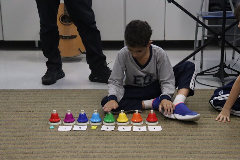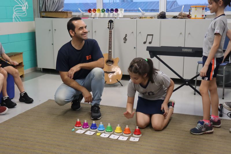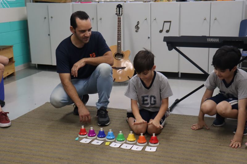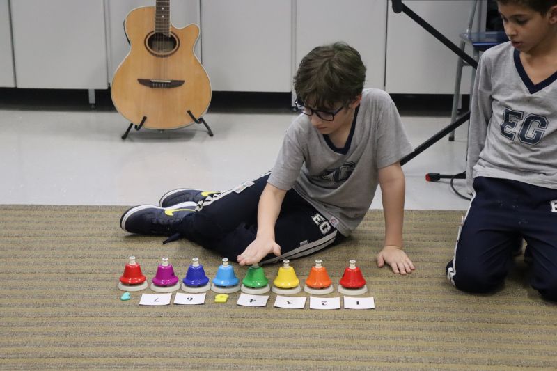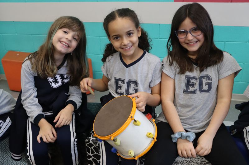 Acompanhados pelas Professoras Tatiana, Gina, Letícia, Paula e Cida, os alunos do 3º ano do EF foram à sala de musicalização.