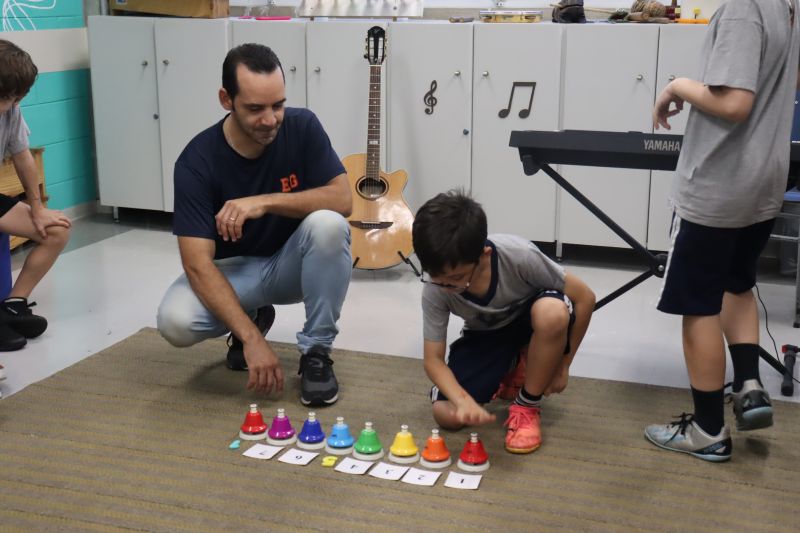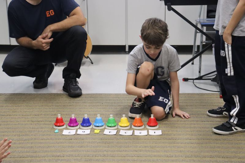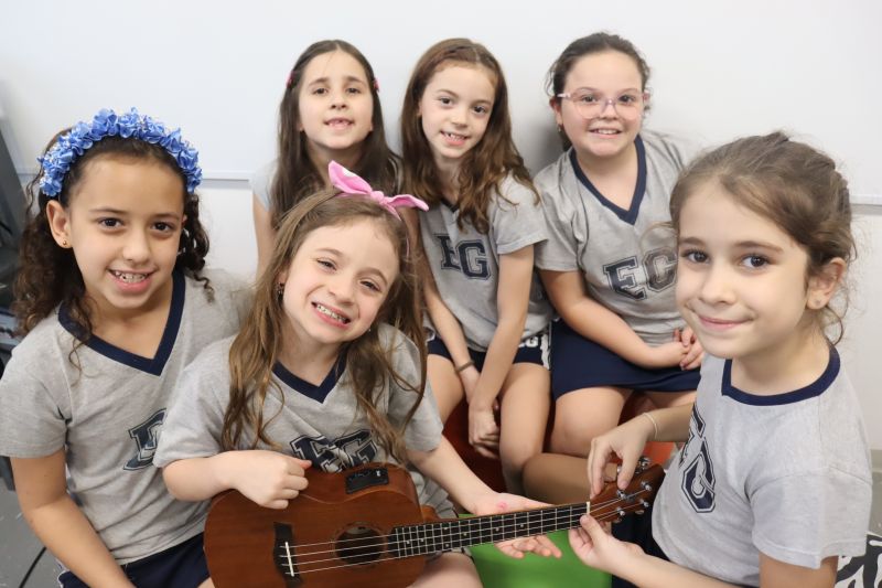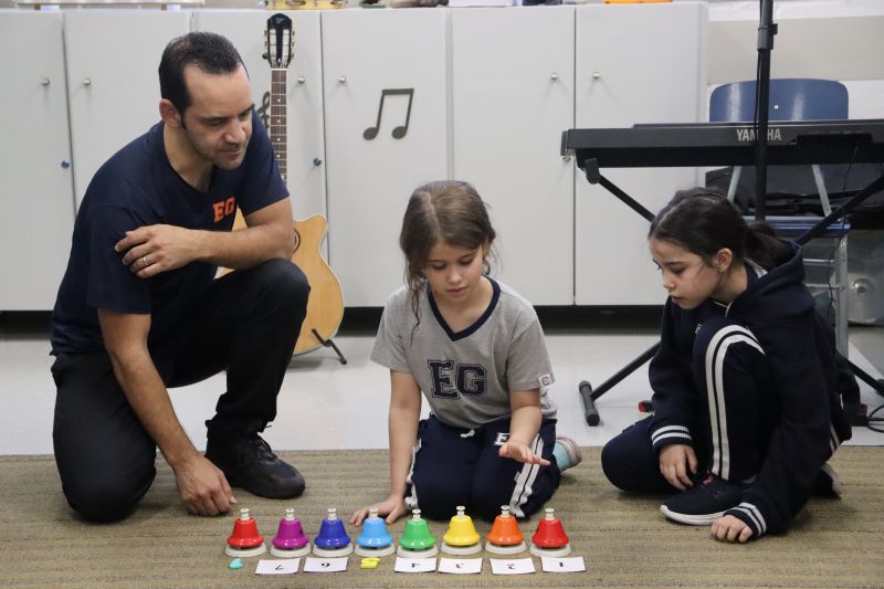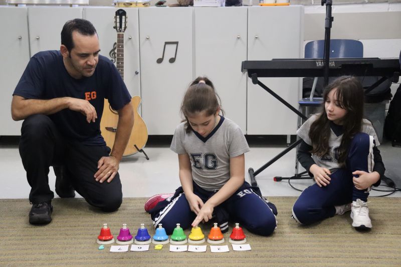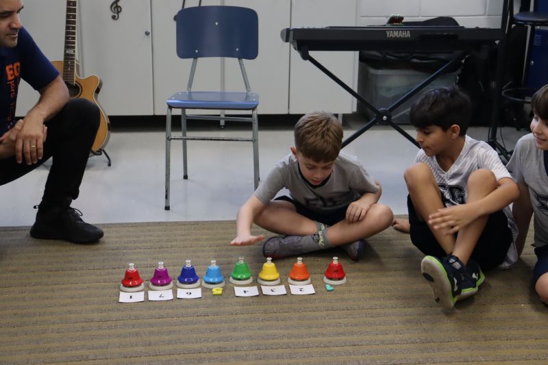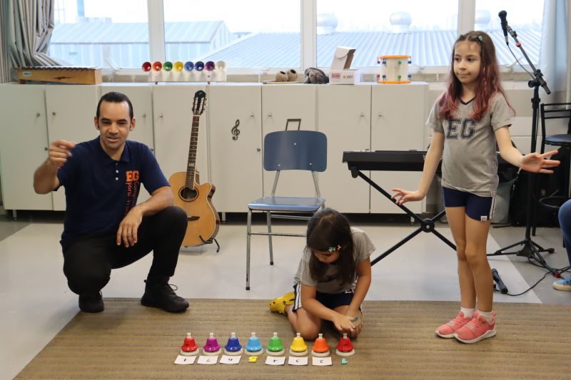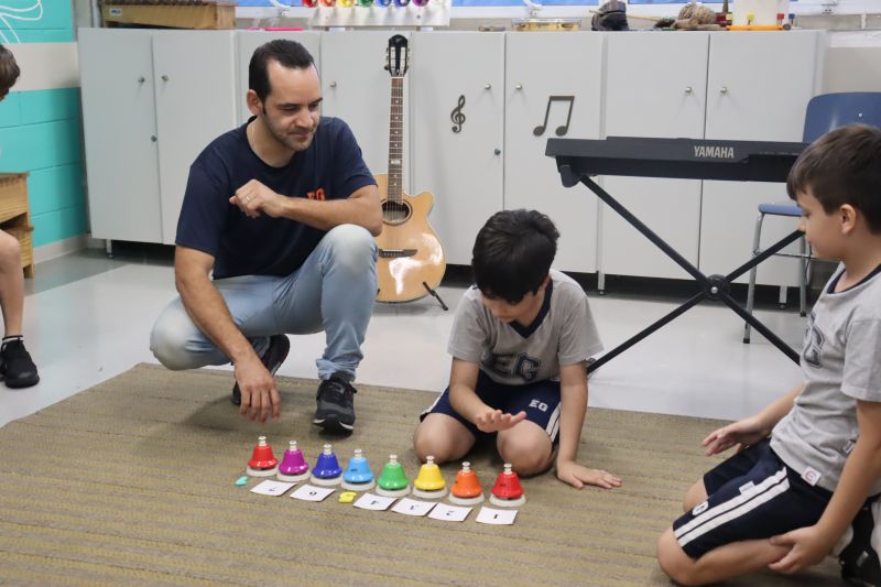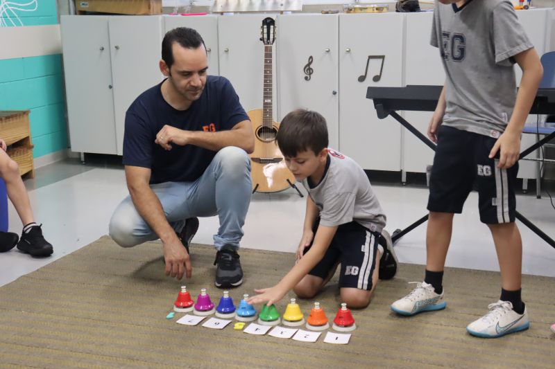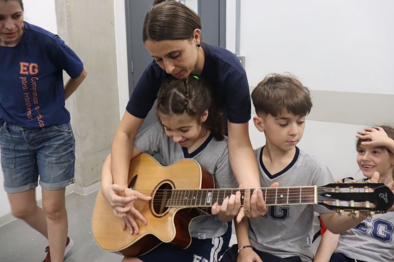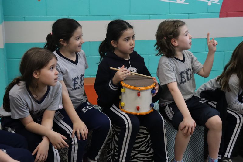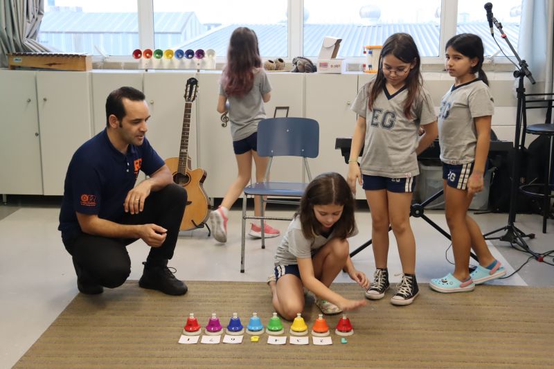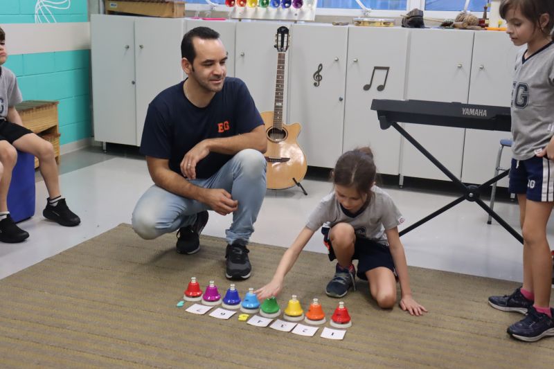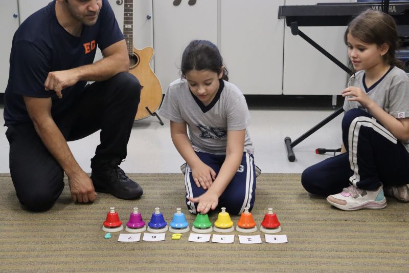 Acompanhados pelas Professoras Tatiana, Gina, Letícia, Paula e Cida, os alunos do 3º ano do EF foram à sala de musicalização.