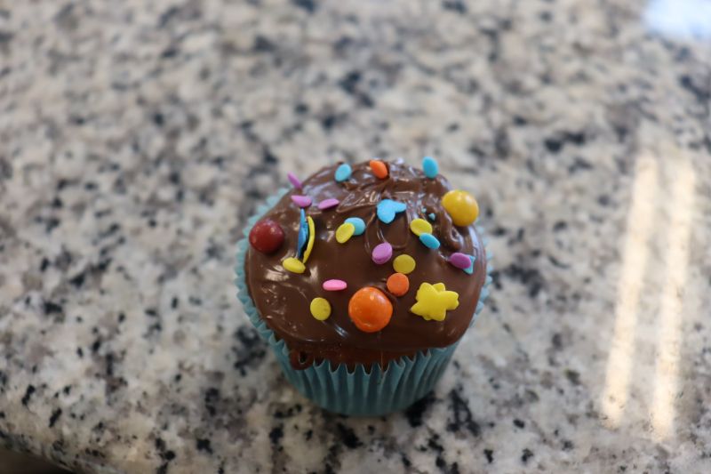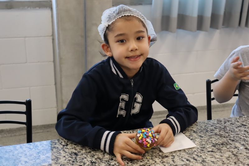Os alunos assistiram ao preparo da receita e, ao final, puderam decorar seus bolinhos com confeitos coloridos e degustá-los.