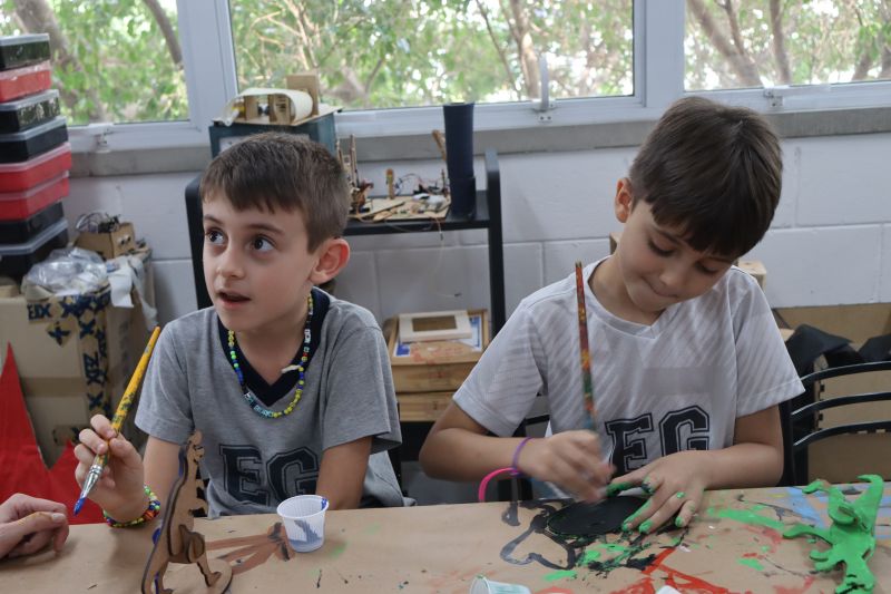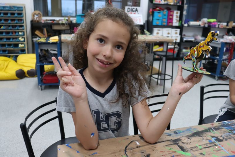 As crianças aprenderam sobre o tema em sala de aula e foram ao Espaço para colocar a imaginação para trabalhar. Lá puderam ver o funcionamento da máquina de corte a laser, utilizada na confecção dos dinossauros, em MDF.