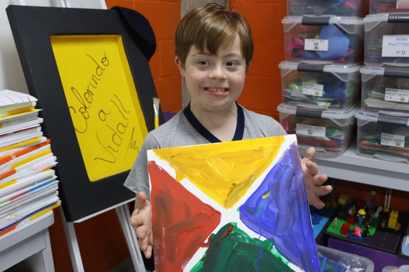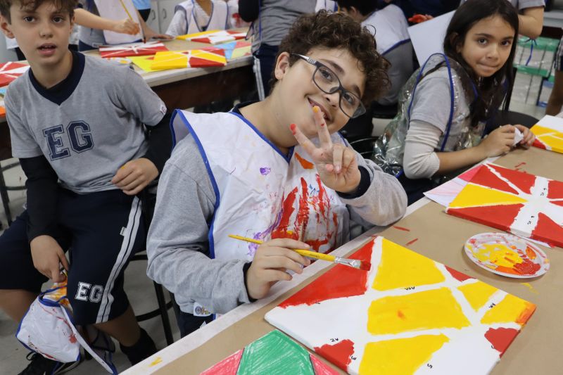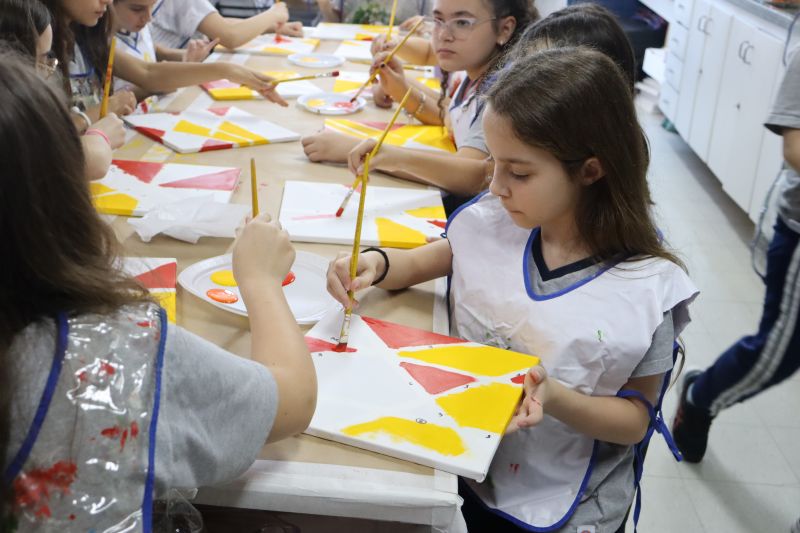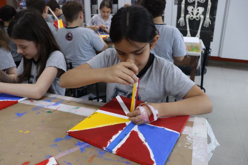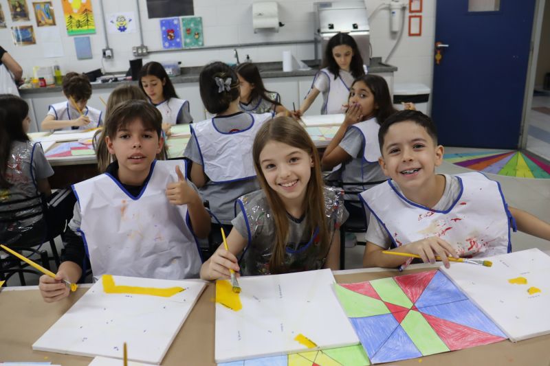 Em seguida, nas aulas de Arte com a Professora Vick, os alunos aplicaram esses conhecimentos geométricos na criação de uma composição artística em tela. Eles utilizaram fita crepe para delimitar formas de tinta para explorar a criatividade e habilidades como a coordenação motora.