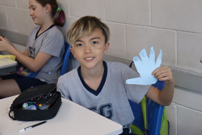 Em sala de aula, os alunos do 1º ao 5º ano, assistiram a um vídeo explicativo sobre o Dia de Ação de Graças, no qual um turkey (peru) era o personagem principal. Em um segundo momento, utilizaram uma de suas mãos como molde, em uma folha de sulfite, desenharam e cortaram. Na sequência, escreveram, nessa folha cortada, a que são gratos, ou seja, o que desperta o sentimento de gratidão em cada um deles.