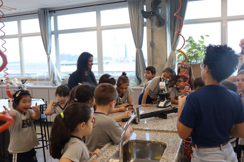 Os estudantes do 2º ano do Ensino Fundamental foram ao laboratório para uma atividade de utilização de instrumentos ópticos, com o objetivo de conhecerem diferentes tipos de lentes de aumento.