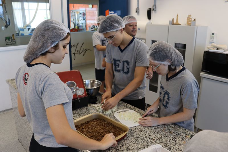 Os alunos da 2ª série do EM, do Itinerário de Investigação e análises Químicas, participaram de uma aula prática na cozinha experimental, para explorar o conceito de adulteração química de uma forma inusitada: preparando um quibe vegano!
