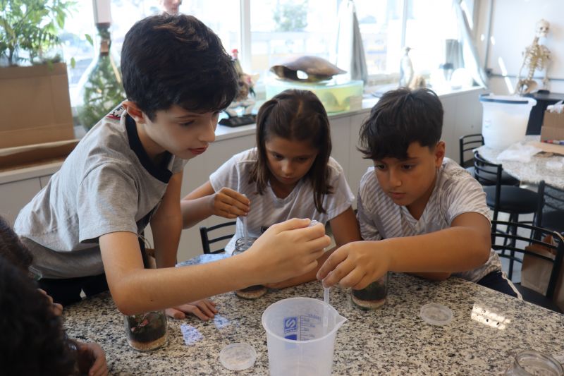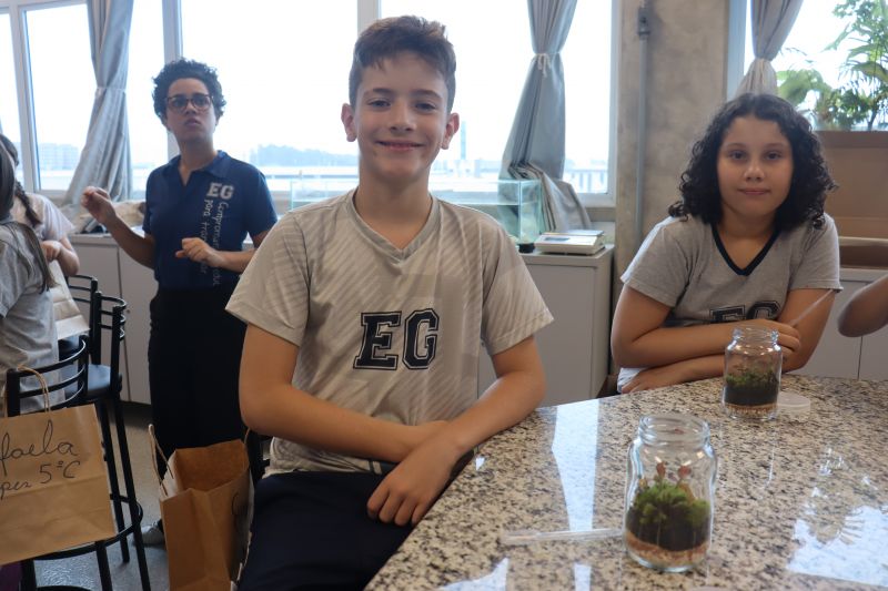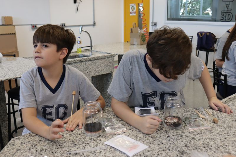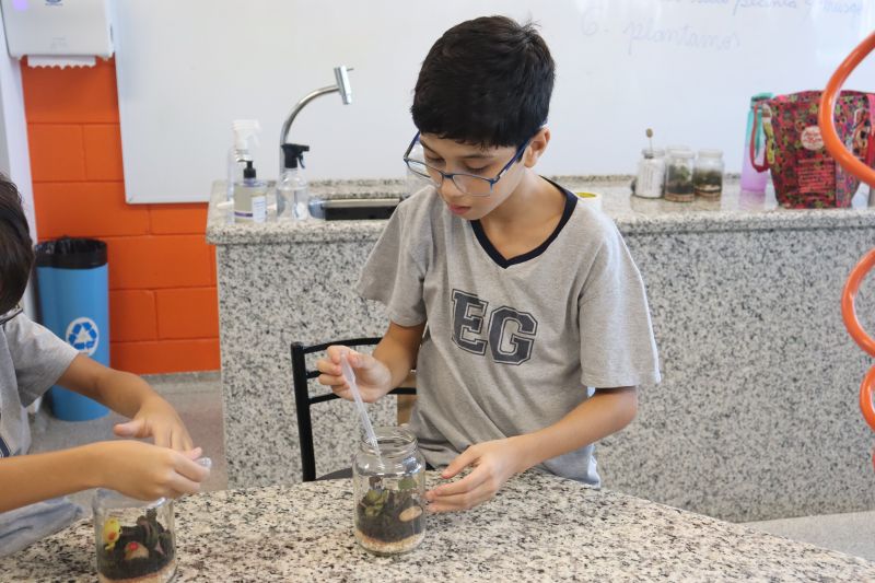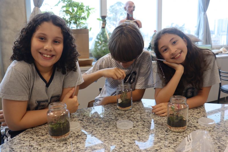 Para iniciar o experimento, cada estudante recebeu um kit contendo um pote de vidro, uma rolha, terra preparada, pedras, musgos e mudas de fitônias. Durante a montagem, as professoras explicaram a importância de cada elemento para a manutenção do ecossistema fechado e destacaram como a umidade e os ciclos de evaporação e condensação ocorrem dentro do recipiente.