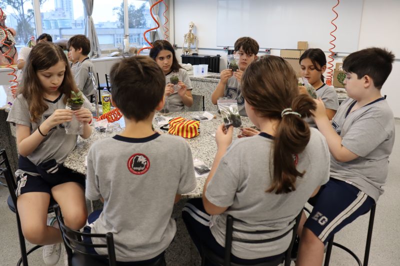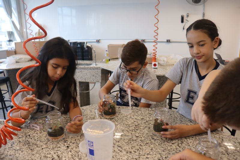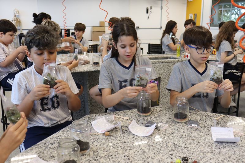 Os estudantes do 5º ano do EF, acompanhados pelas Professoras Liliam e Tânia, participaram de uma atividade no Laboratório, onde confeccionaram seus próprios terrários.