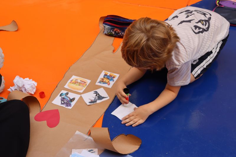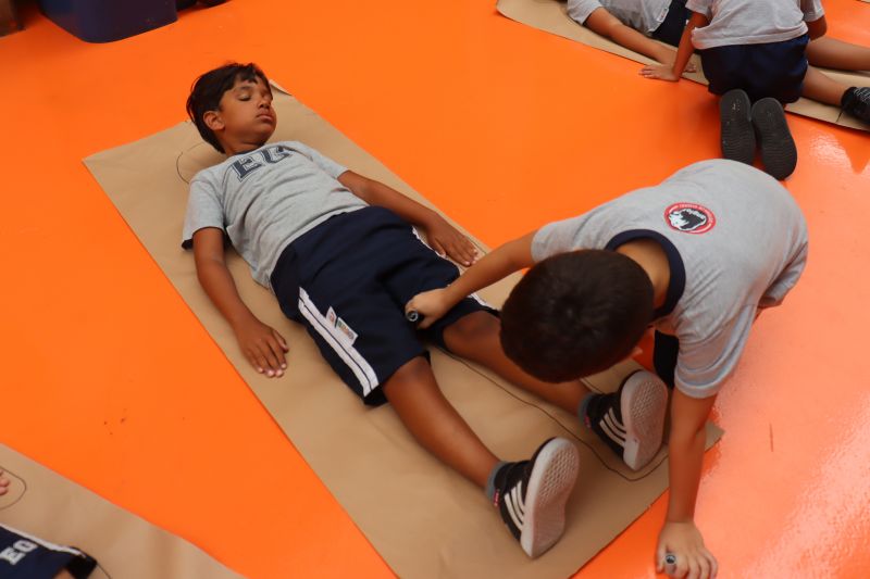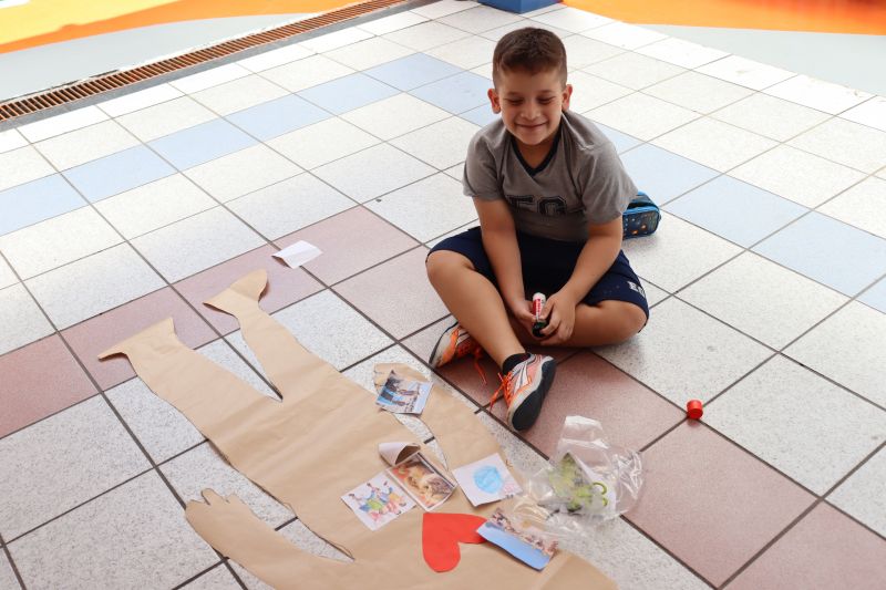 Para a realização da dinâmica, os alunos foram divididos em duplas. Um deles deitou em um grande papel kraft, enquanto o colega contornava sua silhueta, criando uma moldura do corpo, e vice-versa. Em seguida, cada estudante colou no desenho uma foto do próprio rosto e personalizou sua silhueta com a imagem de recortes de comidas favoritas, objetos especais, desenhos e outros elementos que representassem seus gostos, interesses e identidade.