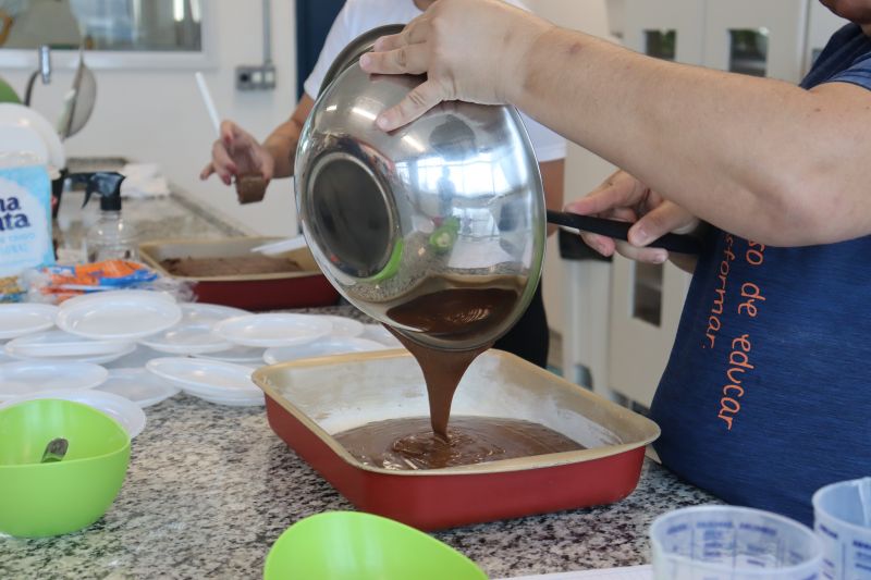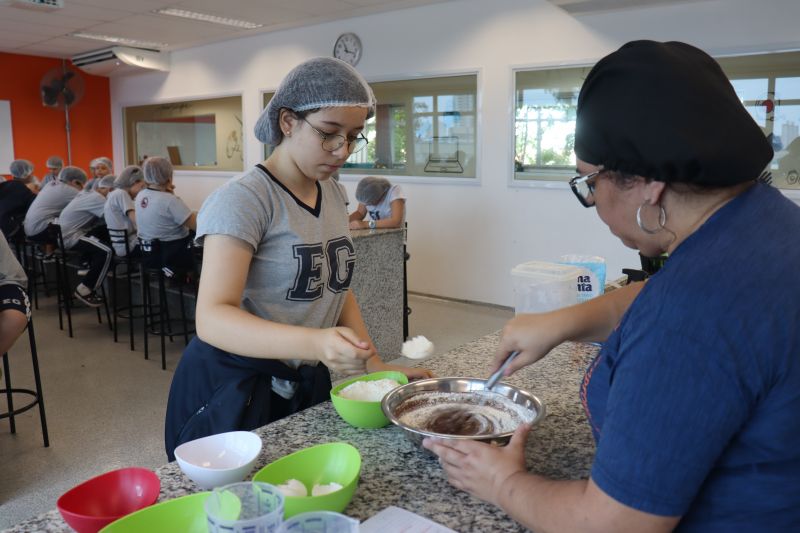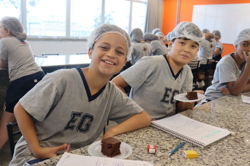 Com o objetivo de demonstrar a ocorrência da transformação química na produção de um bolo, os estudantes do 6º ano foram à Cozinha Experimental acompanhados da Professora Carolina Nascimento e, além de aprenderem, deliciaram-se com um bolo de chocolate feito pela Cássia, responsável pela Cozinha.