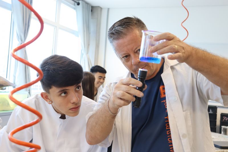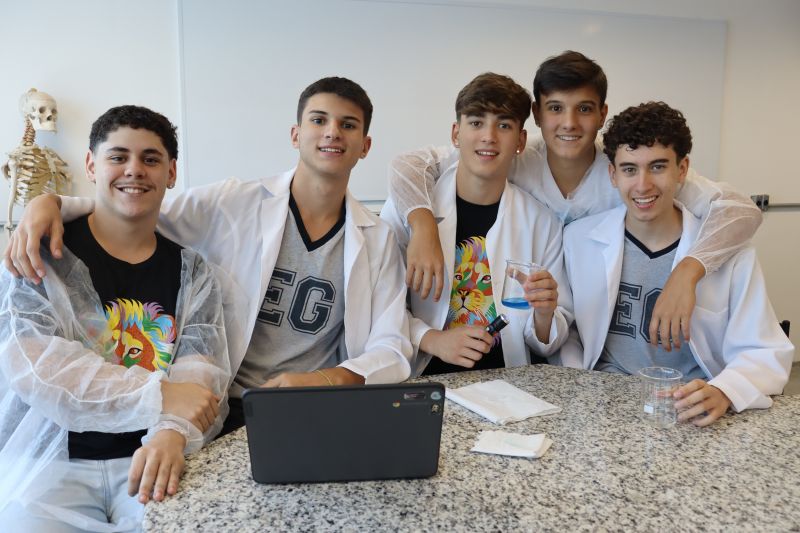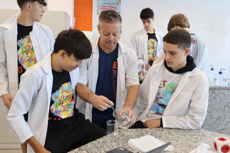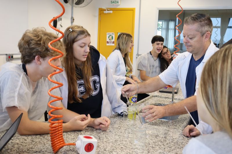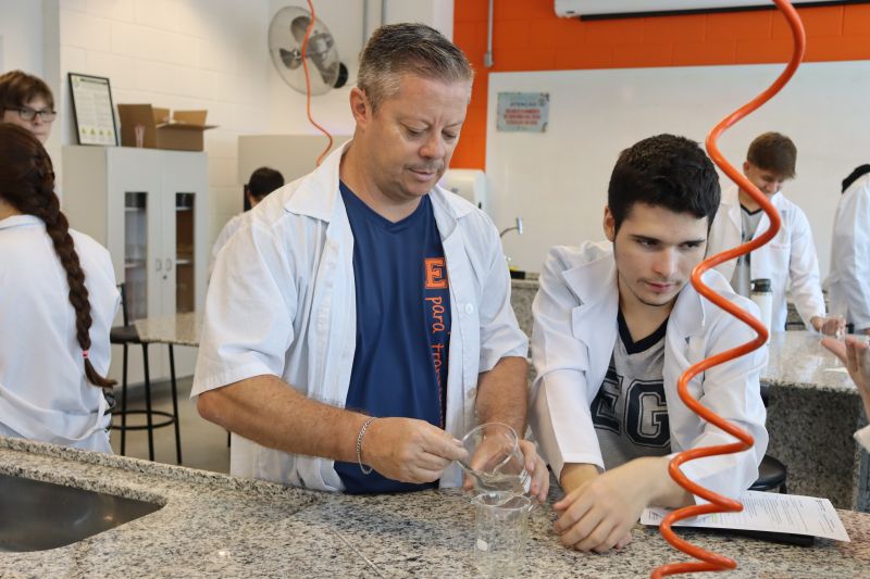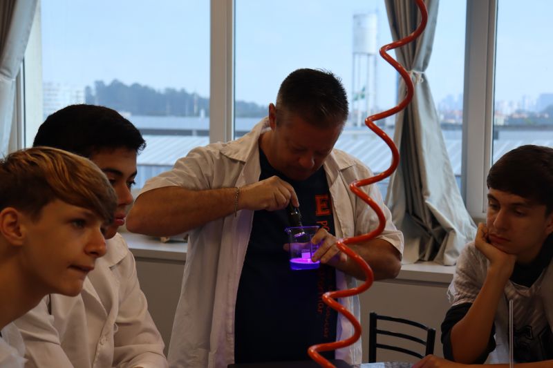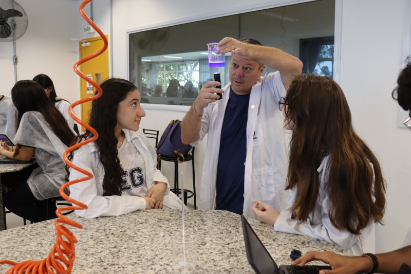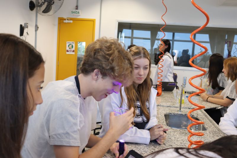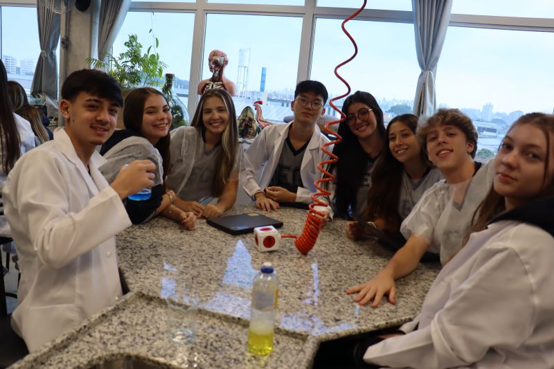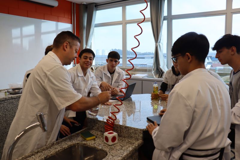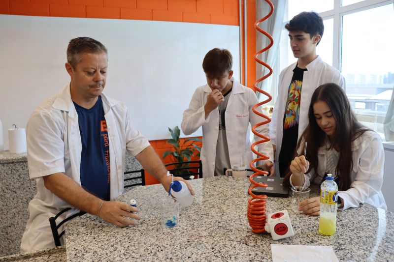 Os alunos do Itinerário de Química, da 2ª série do EM – Investigação e Análises Químicas, participaram de uma aula prática no laboratório, sob orientação do Professor Alex. A atividade teve como objetivo realizar a extração e a identificação do DNA a partir da saliva.