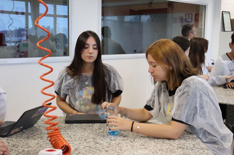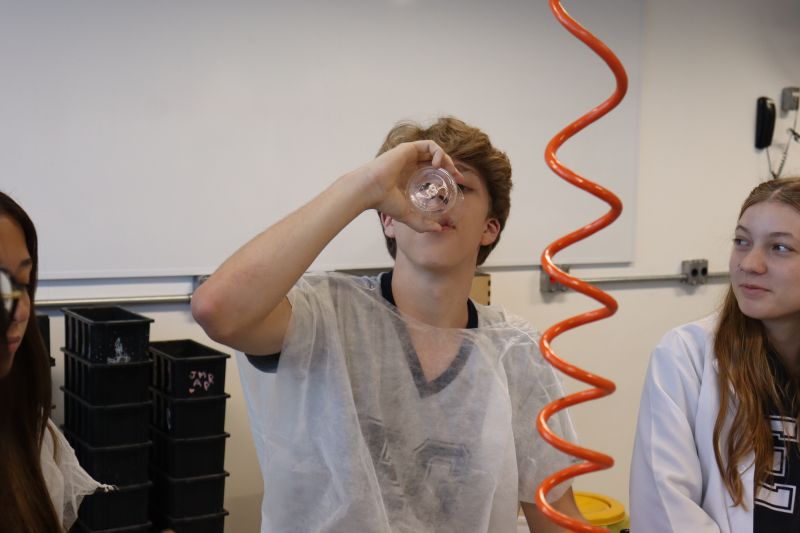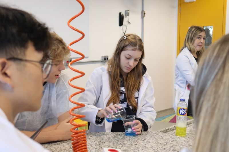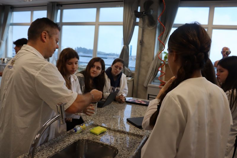 O experimento consistiu na extração do DNA por meio de um procedimento simples: cada aluno fez bochecho com uma solução de água e sal, que, em seguida, foi misturada com corante e álcool. Após alguns segundos, foi possível observar a separação e a identificação do DNA, visível como uma substância esbranquiçada na mistura.