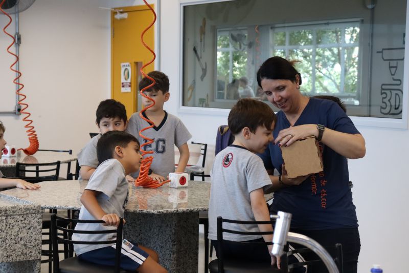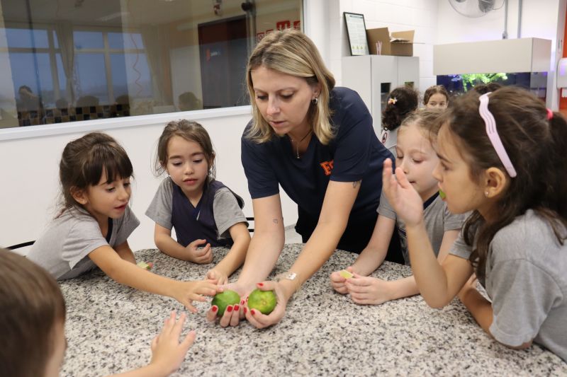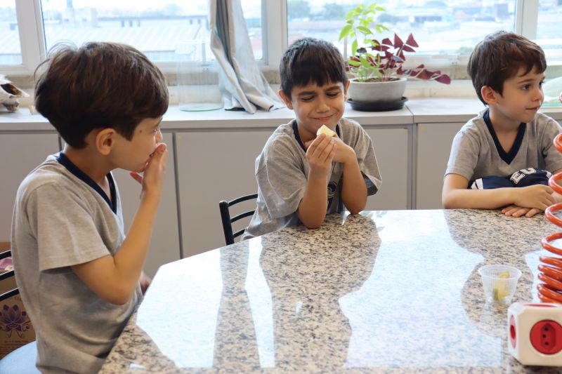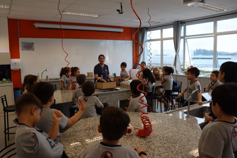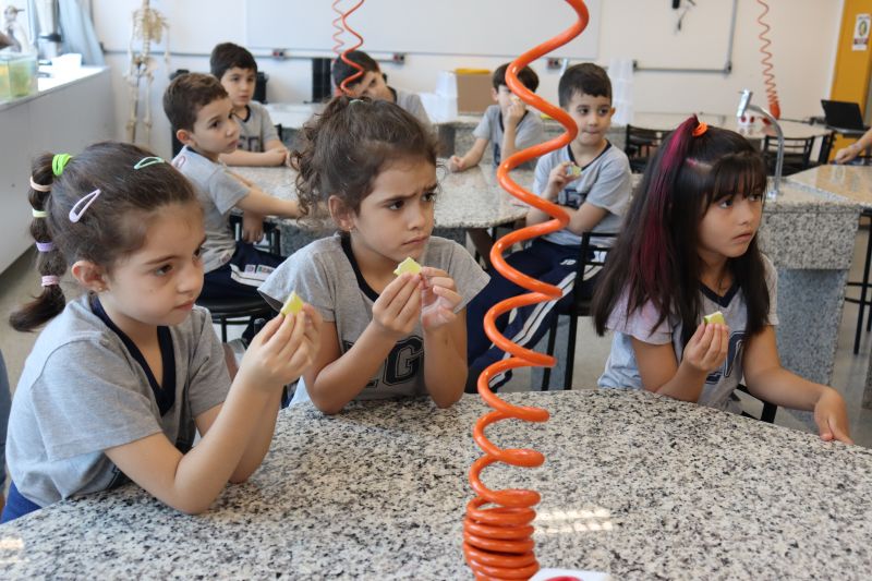 Os estudantes do 1º ano do EF, acompanhados pelas Professoras Rosimeire, Eny, Marcela e Valquíria, participaram de uma atividade no laboratório, sobre os cinco sentidos.