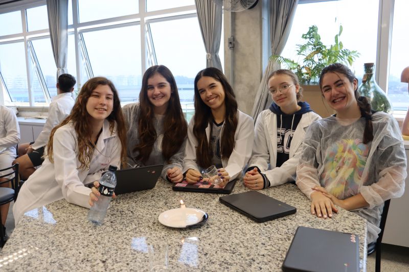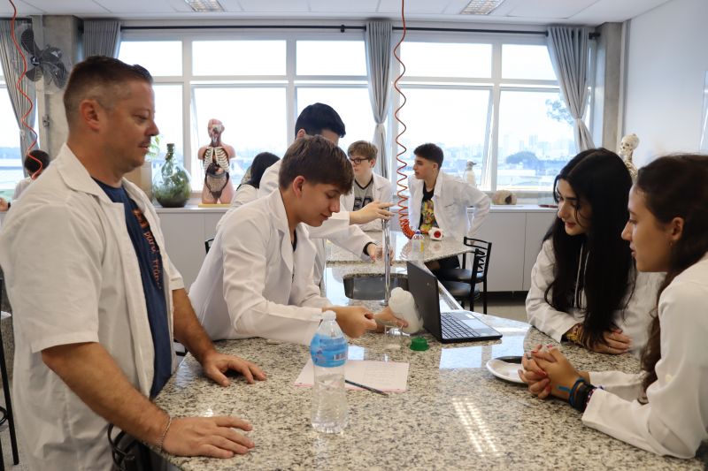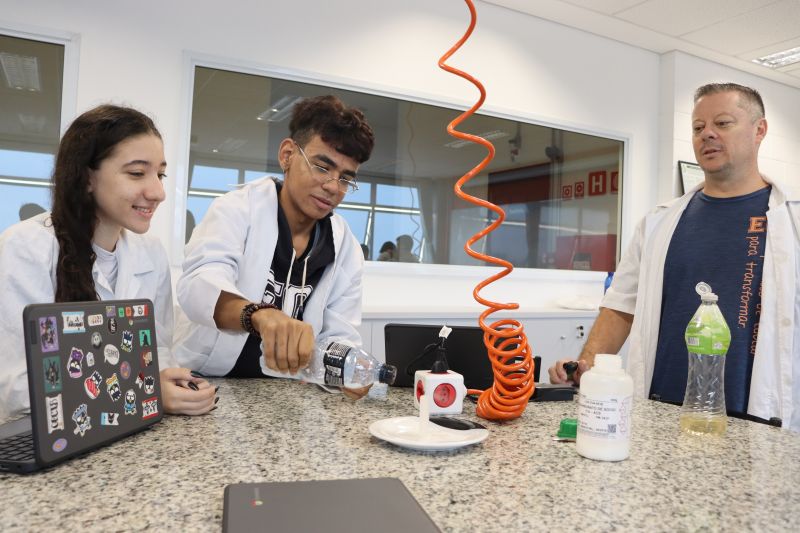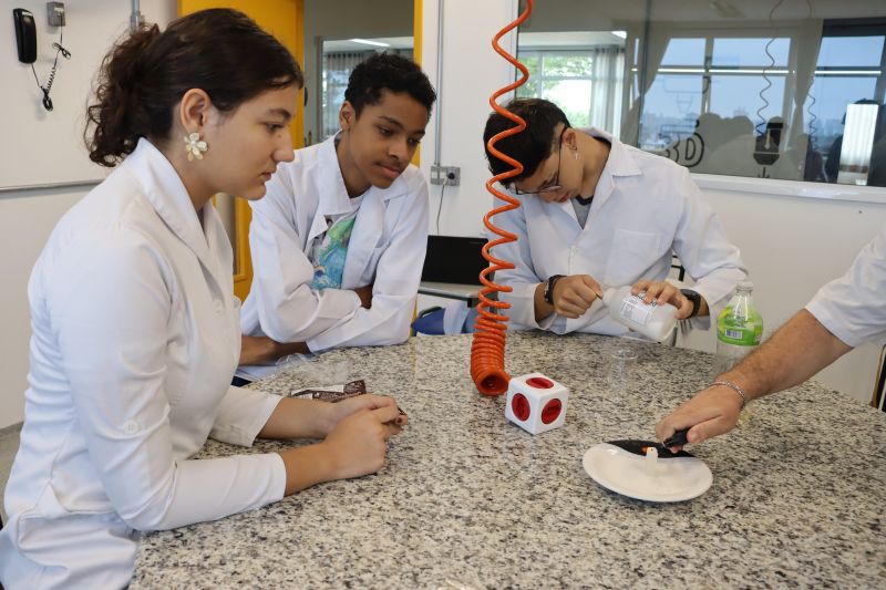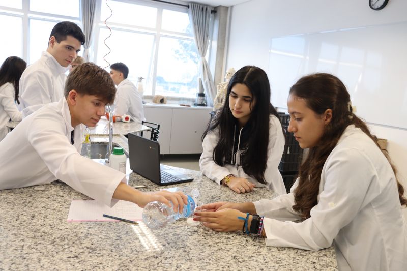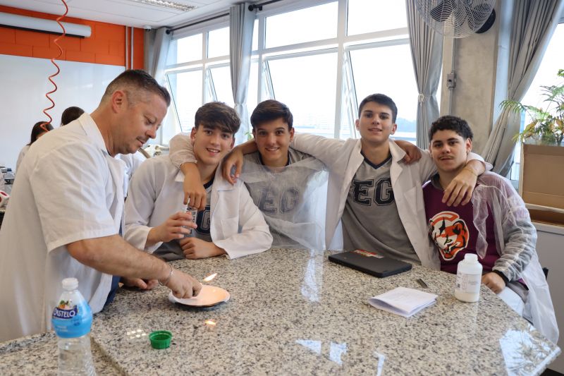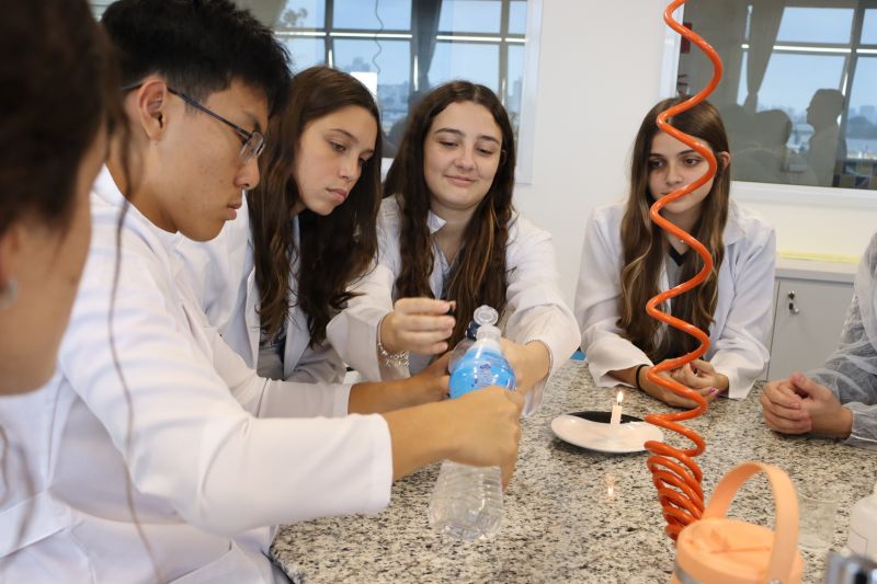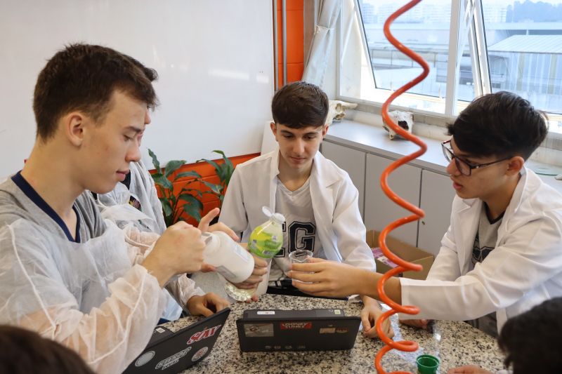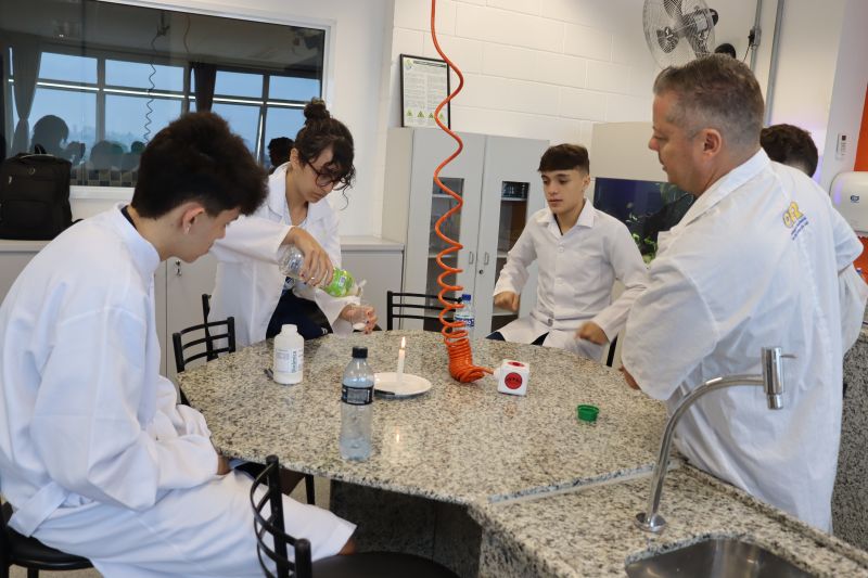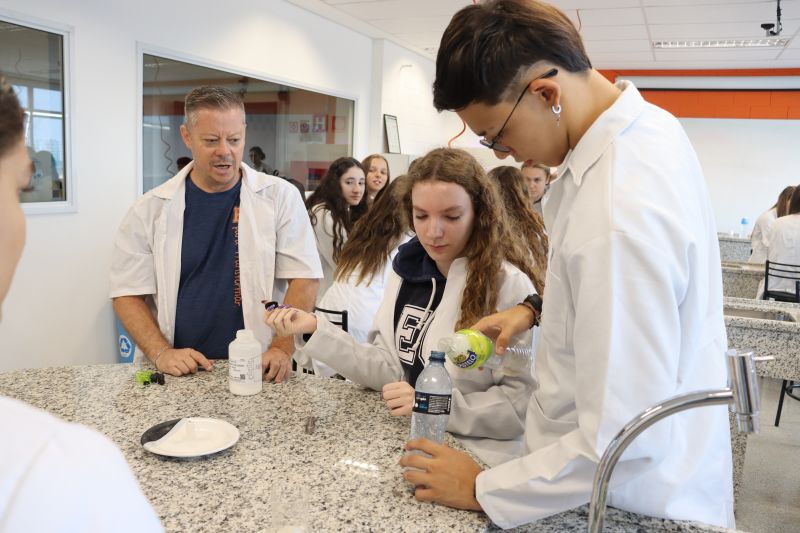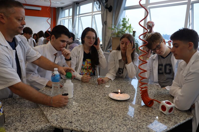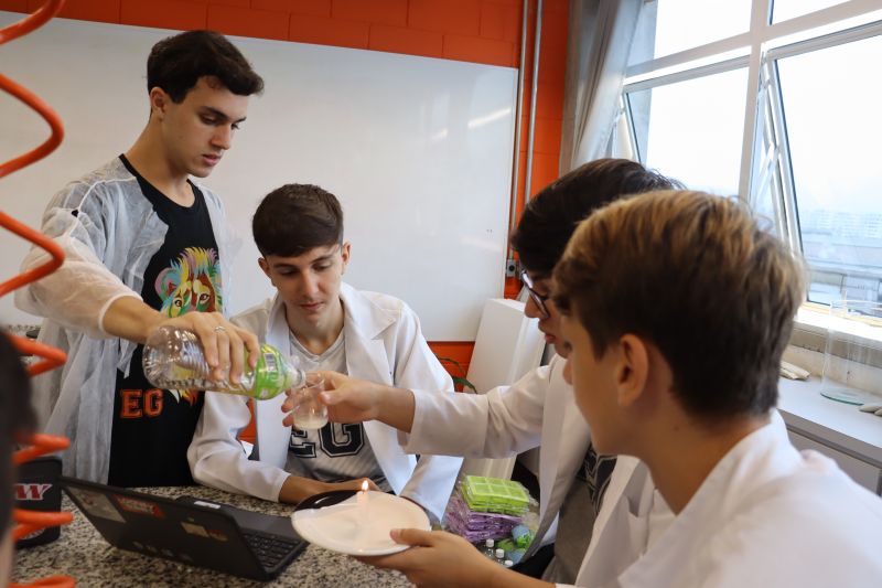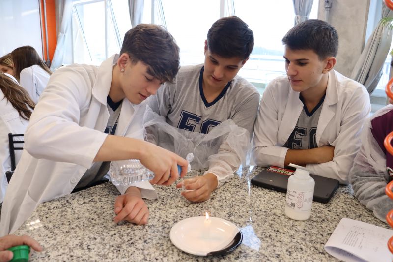 Acompanhados pelo Professor Alex, os alunos do Itinerário de Química, da 2ª série do EM – Investigação e Análises Químicas, foram ao Laboratório para realizar um experimento envolvendo CO2, com o auxílio da Juliana, responsável pelo espaço.
