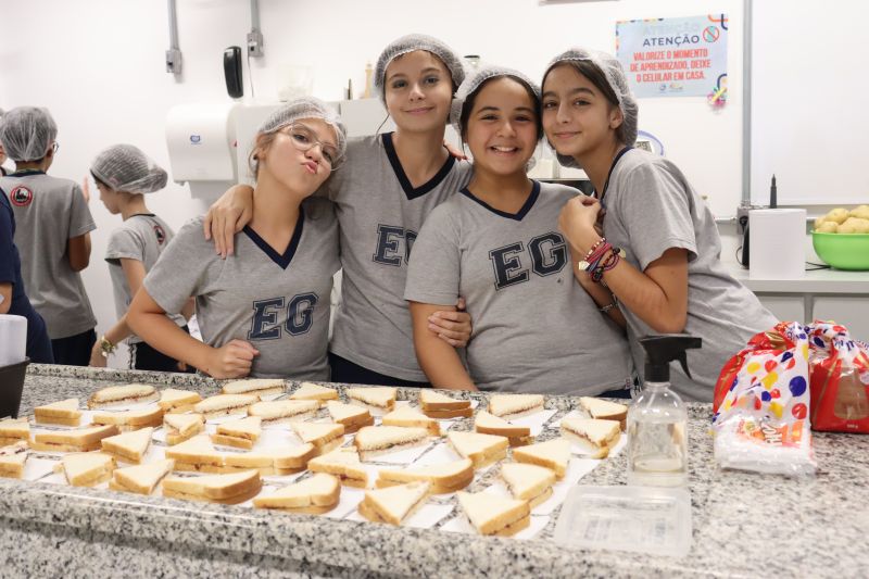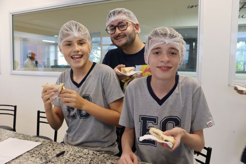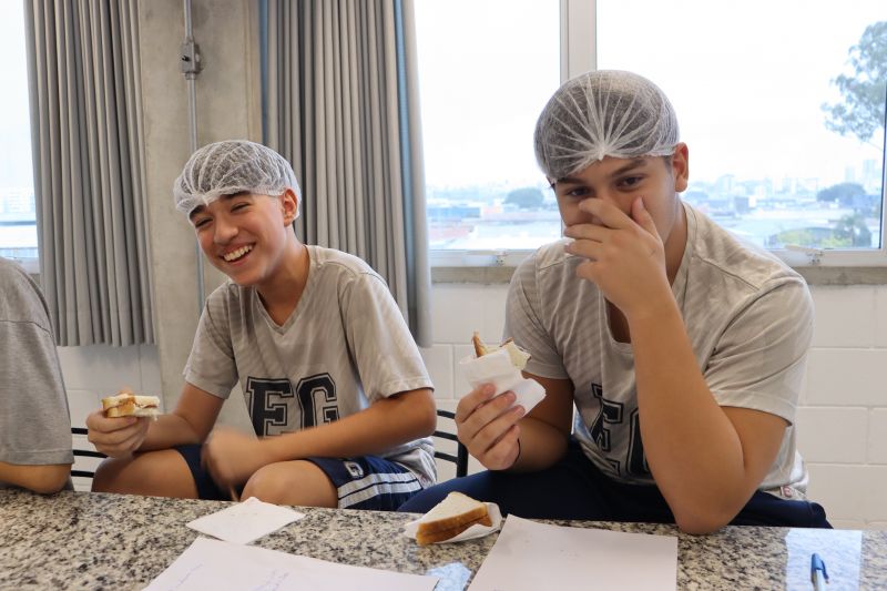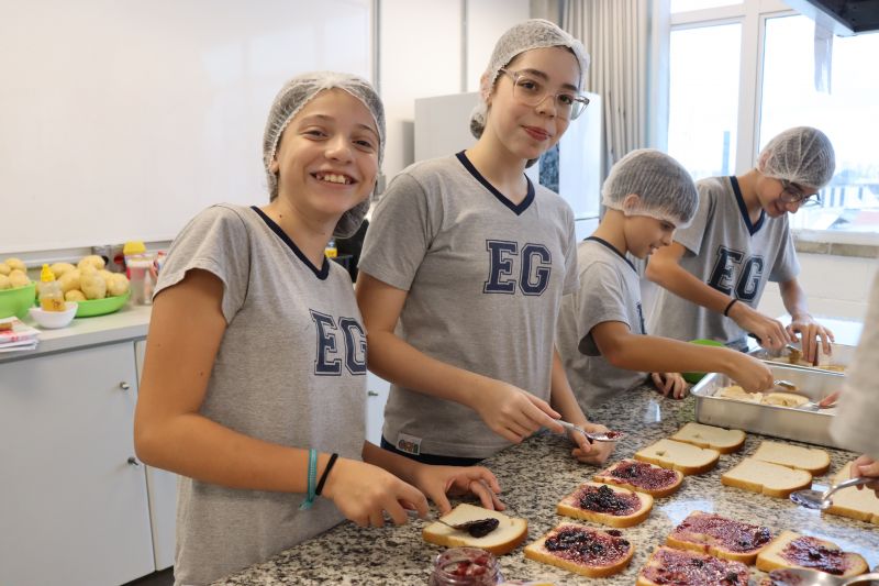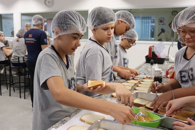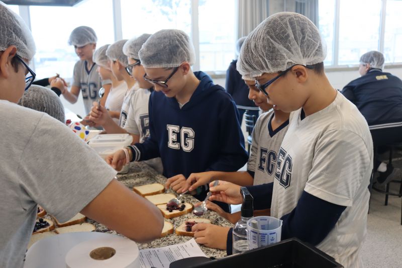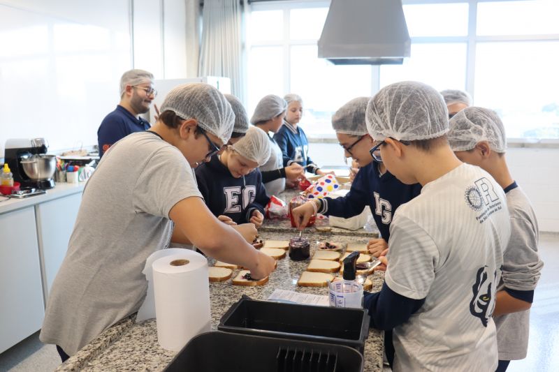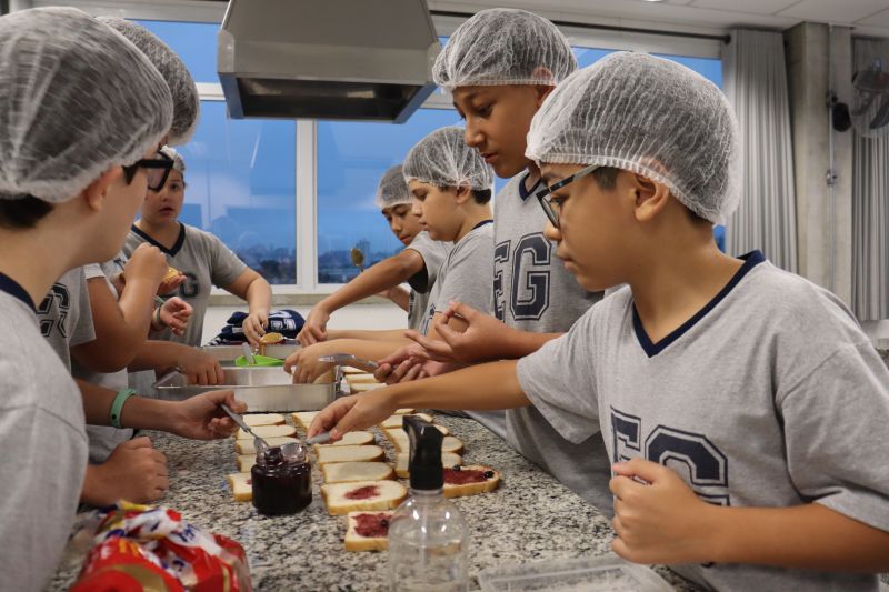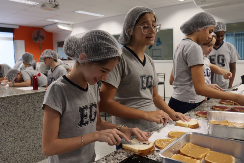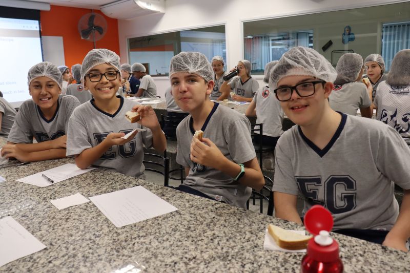 No 7º ano, a atividade fez parte do encerramento da Unit 2 – Delicious Diversity. Os estudantes seguiram uma receita típica da cultura norte-americana: Penaut Butter and Jam Sandwich. Além de prepararem o lanche, os alunos também estudaram o gênero textual “receita” e ampliaram o vocabulário em inglês, relacionado a comidas e bebidas.