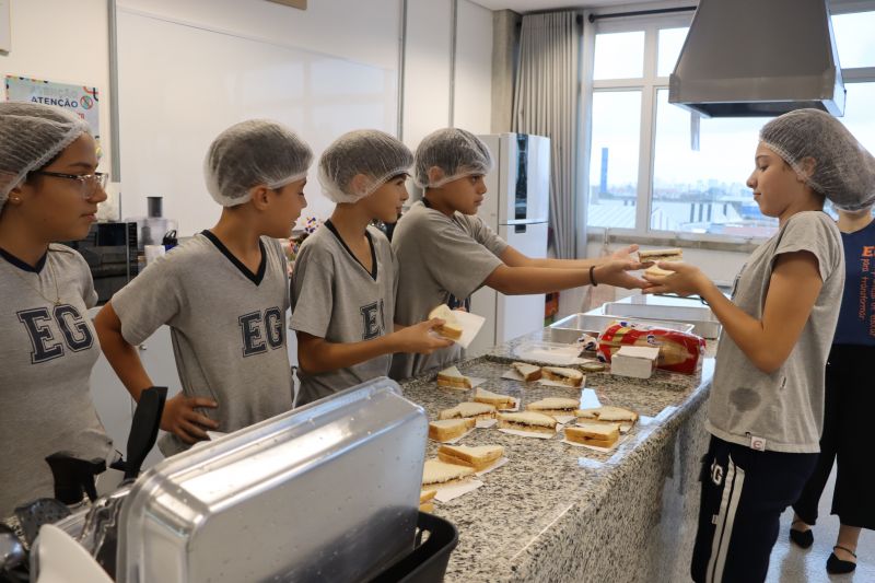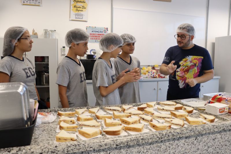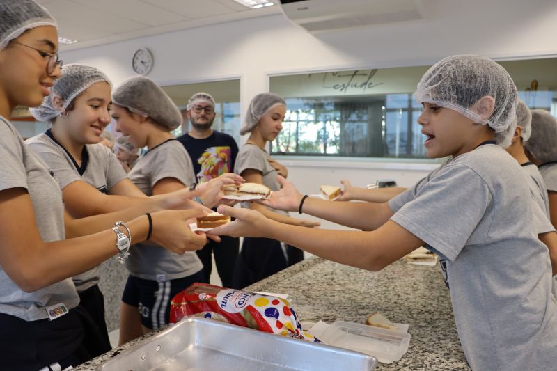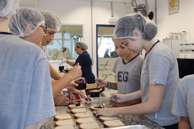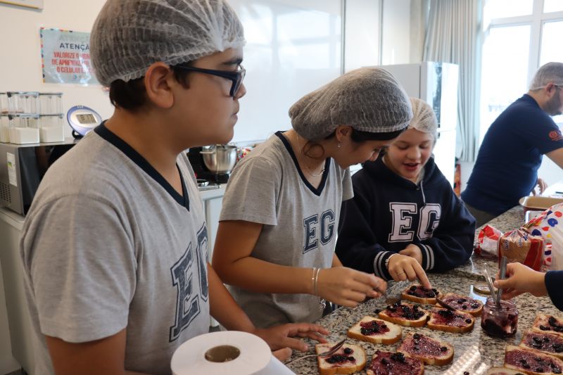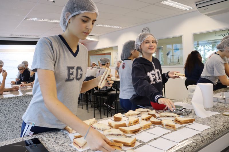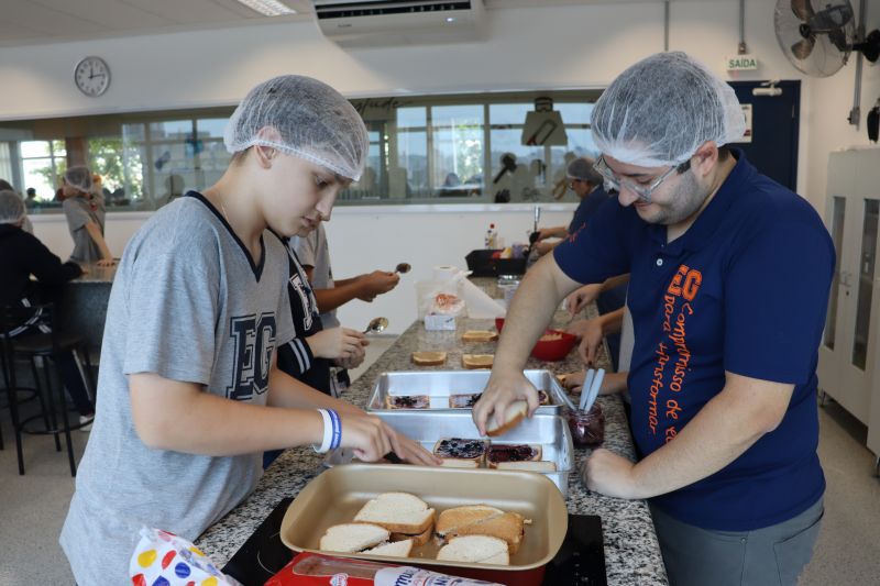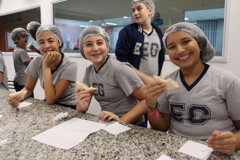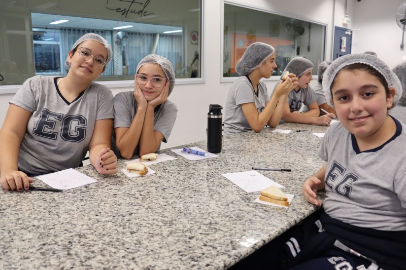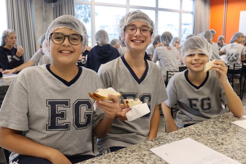 No 7º ano, a atividade fez parte do encerramento da Unit 2 – Delicious Diversity. Os estudantes seguiram uma receita típica da cultura norte-americana: Penaut Butter and Jam Sandwich. Além de prepararem o lanche, os alunos também estudaram o gênero textual “receita” e ampliaram o vocabulário em inglês, relacionado a comidas e bebidas.