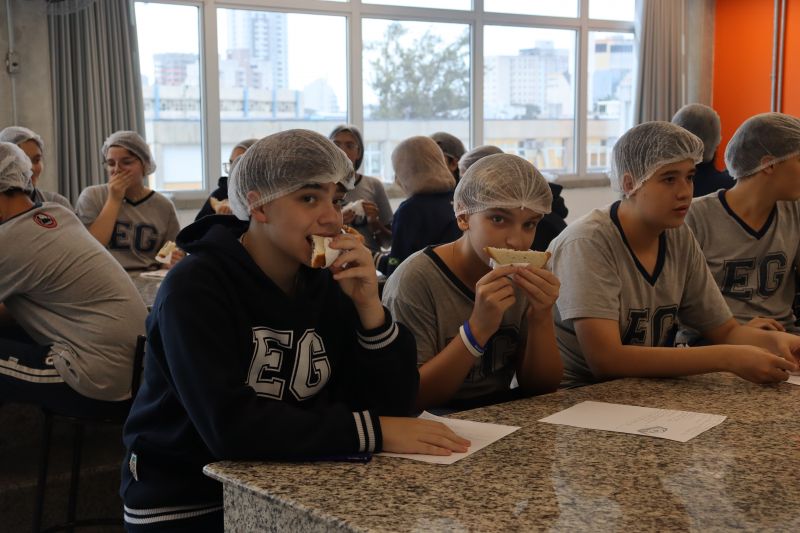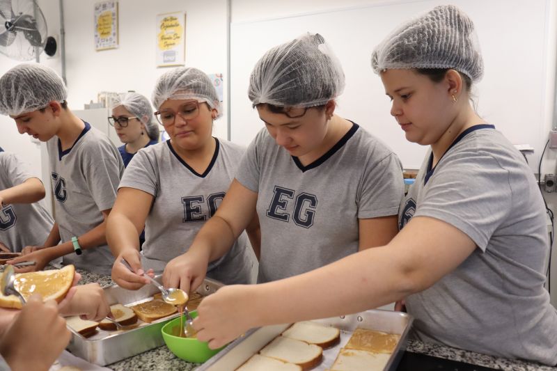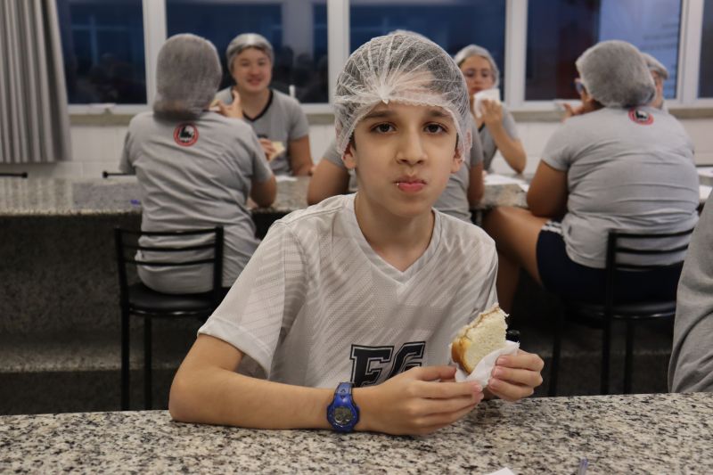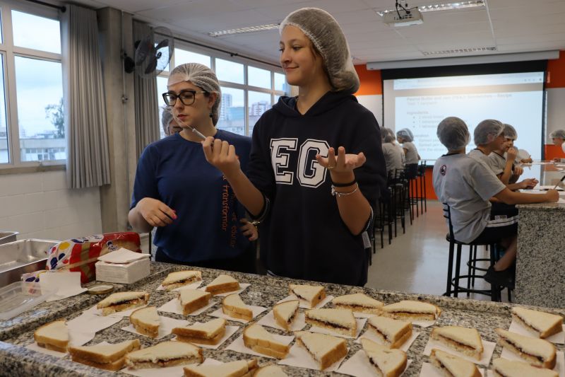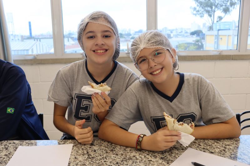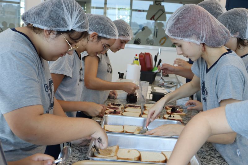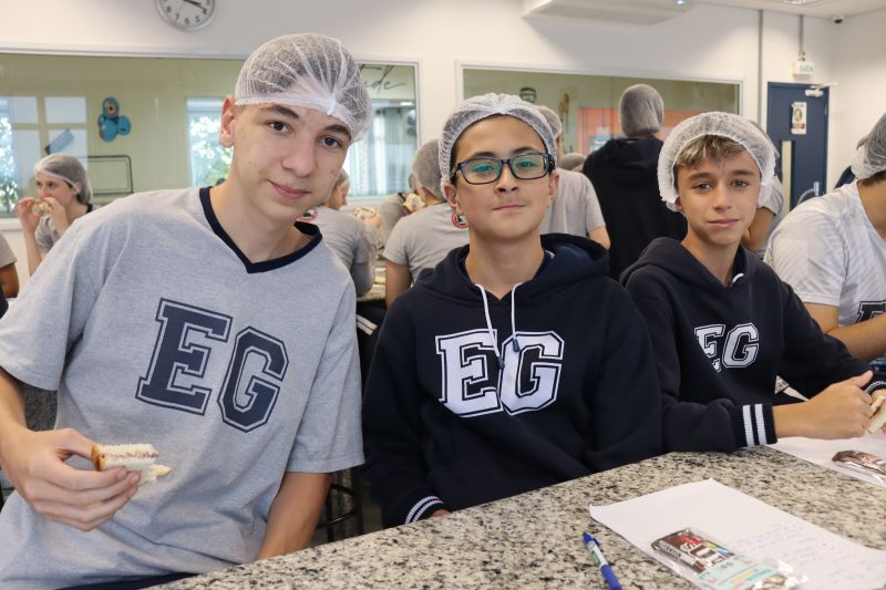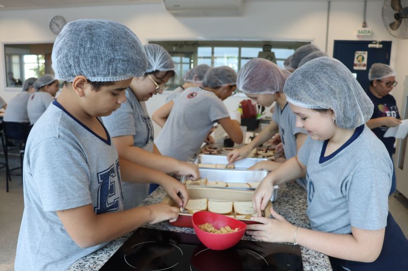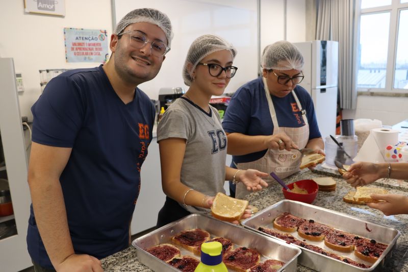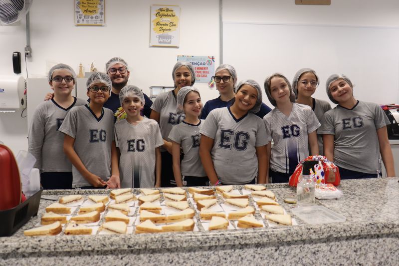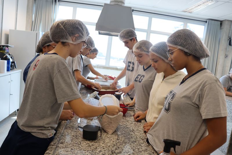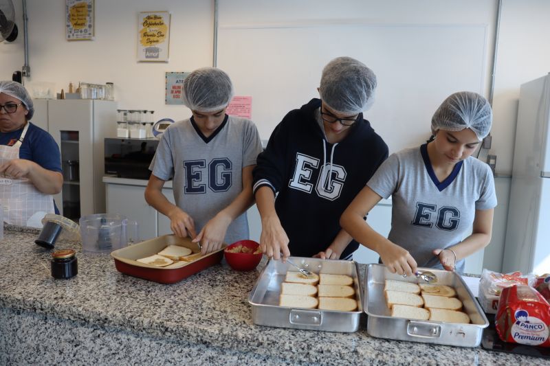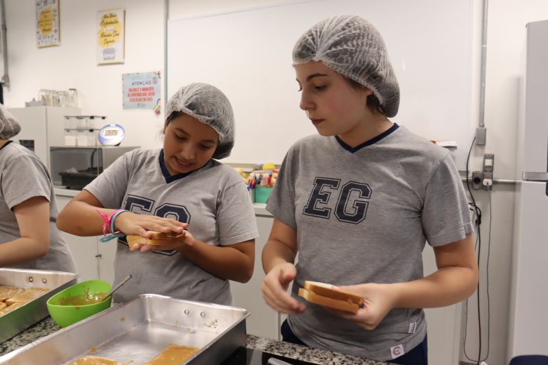 Os alunos do 9º ano encerraram a Unit 2 – What Makes Us Happy?, com o mesmo preparo culinário. A proposta foi apresentar um elemento cultural dos Estados Unidos, aliando a prática e o aprendizado. Após a preparação da receita, os estudantes produziram um relatório, em inglês, sobre a experiência.