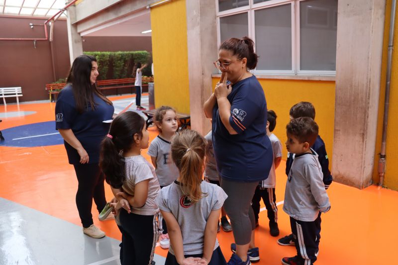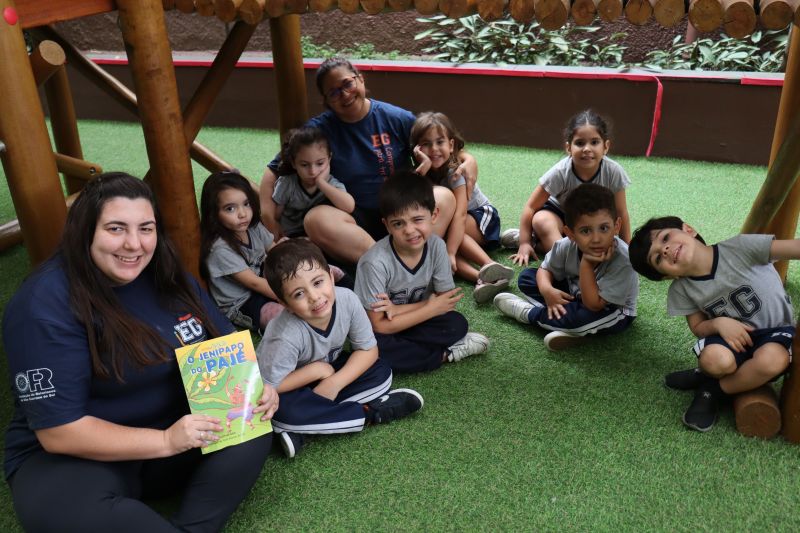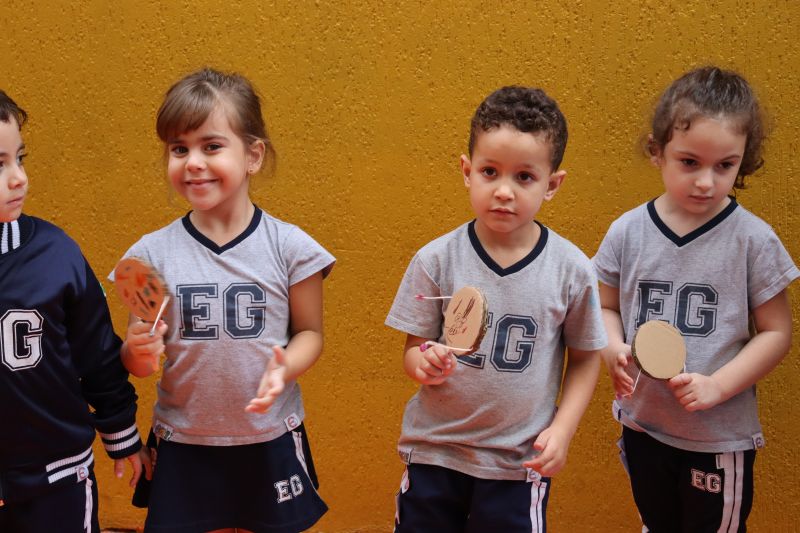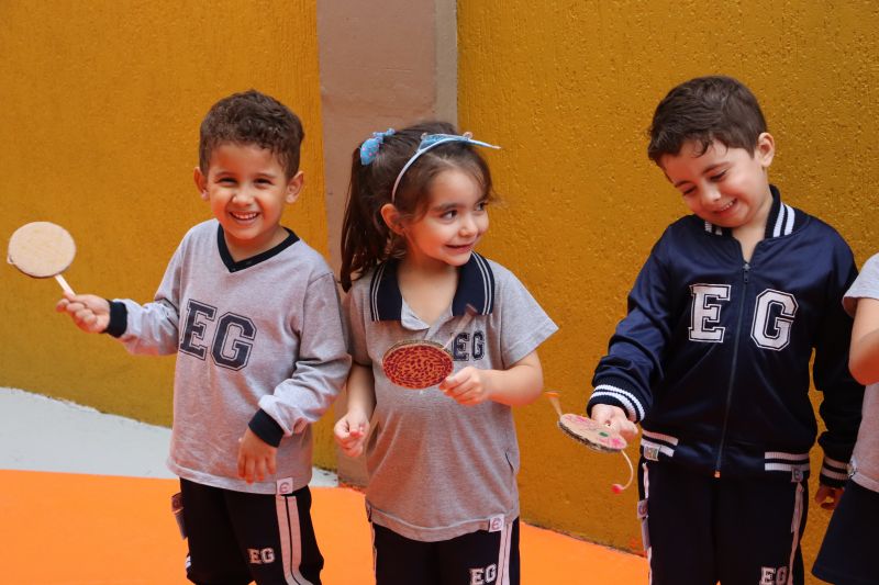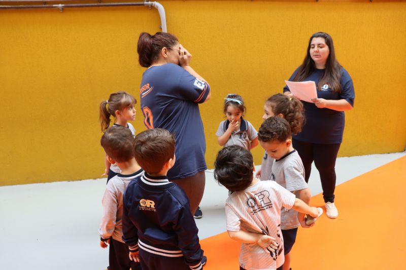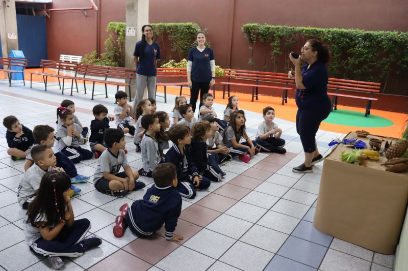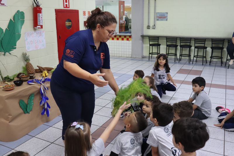 No pátio da Ed. Infantil, o Nível 2 juntou-se ao Nível 1 para brincar de tucunaré e apreciar uma exposição de objetos que fazem parte da vida dos povos indígenas, como adereços, utensílios de cozinha, ferramentas de caça e brinquedos, entre outros itens, organizada pelas Professoras Luciana e Helena.