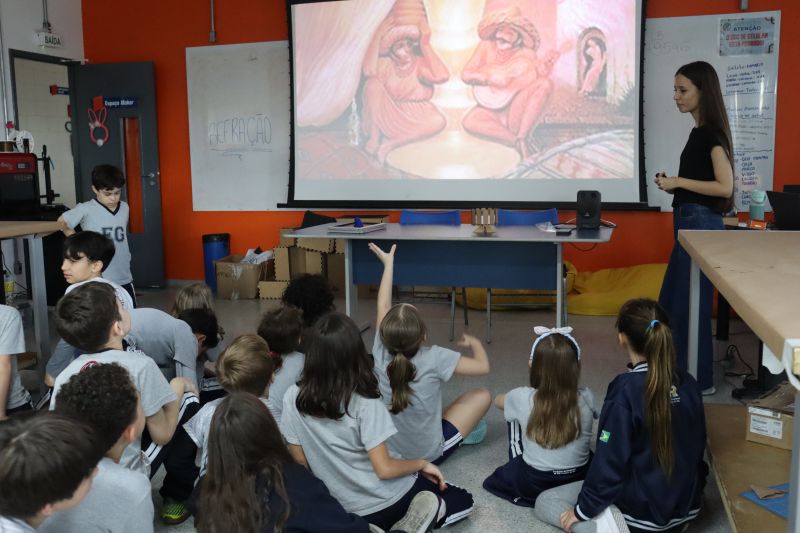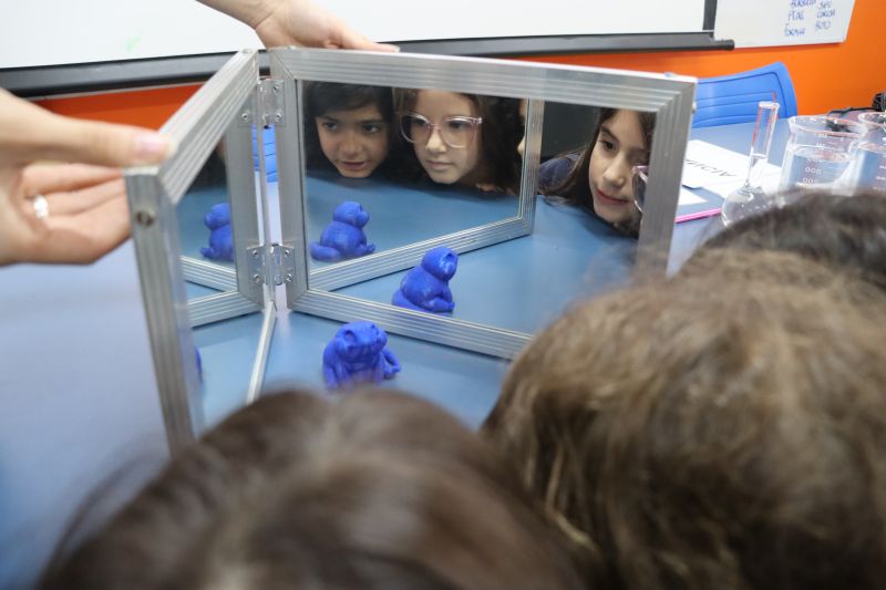 Maressa, Júlia e Derville, do Espaço Maker, conversaram com os estudantes sobre os efeitos da luz nos olhos humanos e, na sequência, realizaram alguns experimentos com espelhos, água e periscópio, entre outros materiais, para investigar o reflexo da luz e seus efeitos.